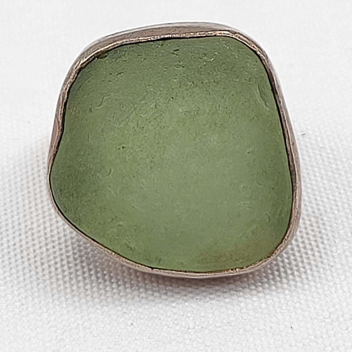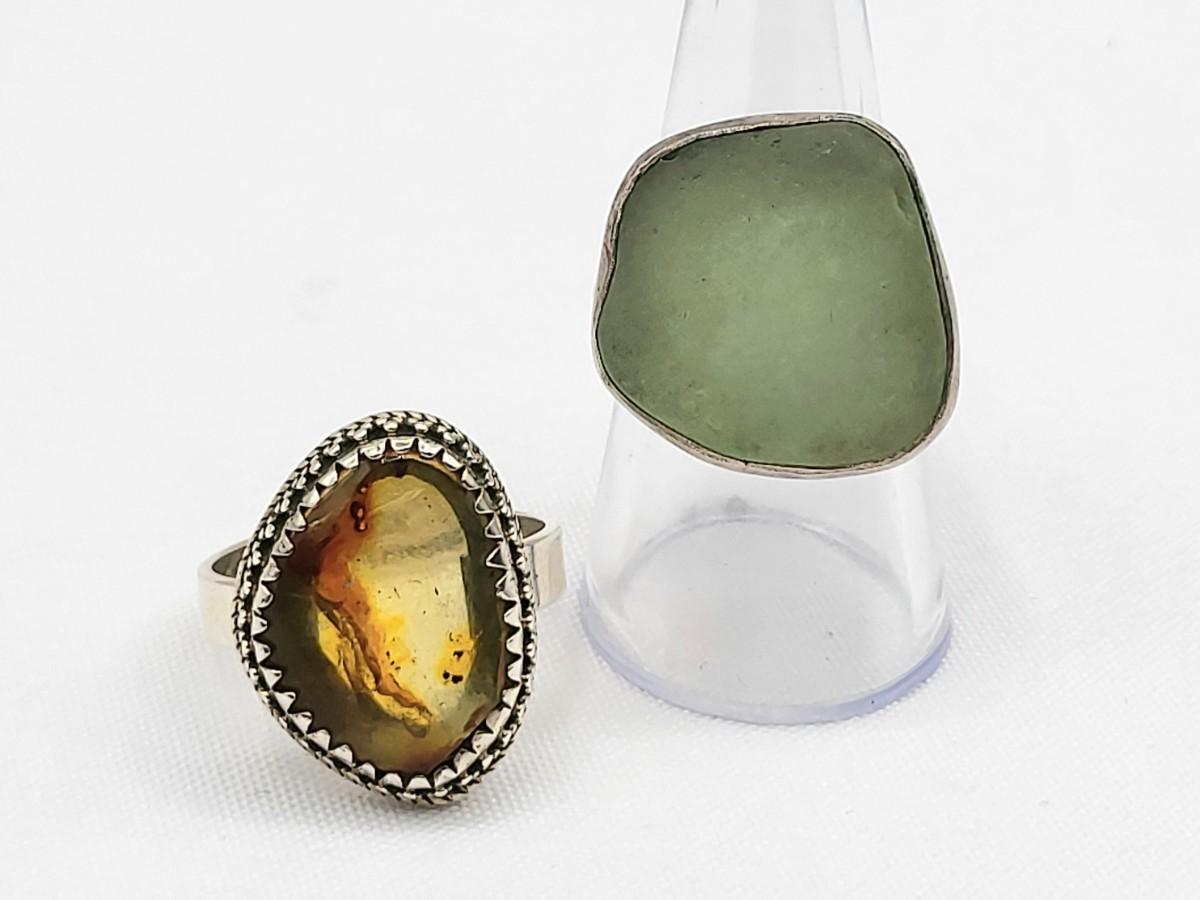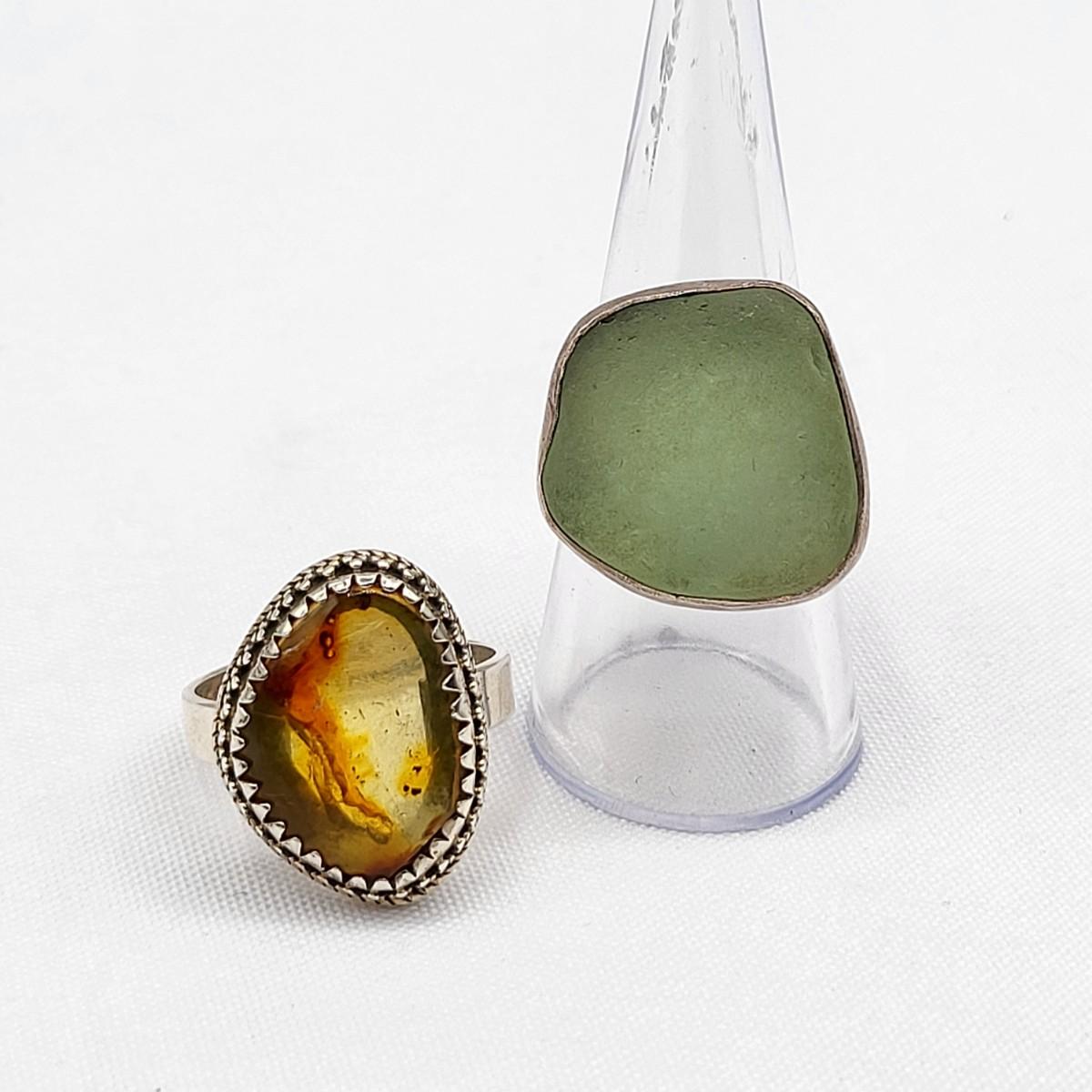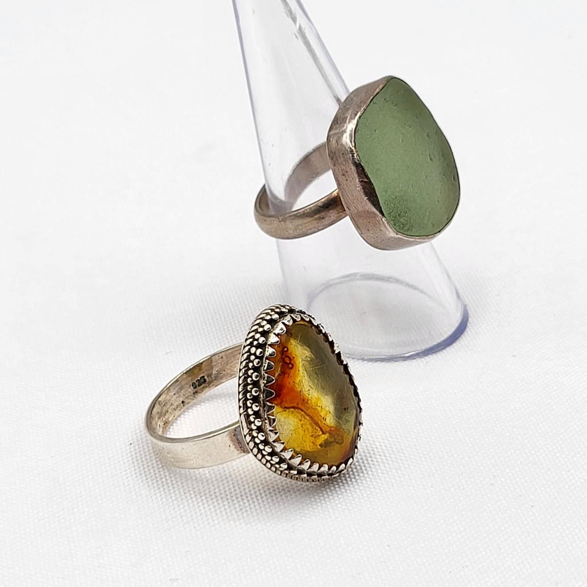 Aqua sea glass artisan signed handmade ring set in sterling silver, size 8. Stamped LISA sterling. Second ring is a unique but unknown material set decorative bezel setting, size 10. Total weight is 16.91 grams