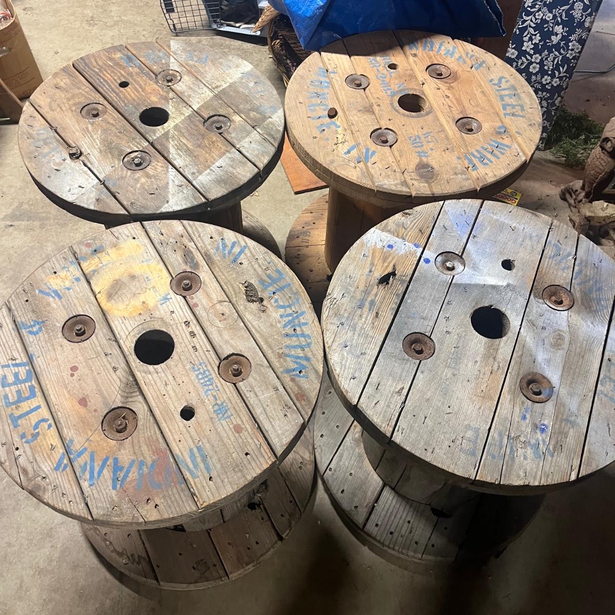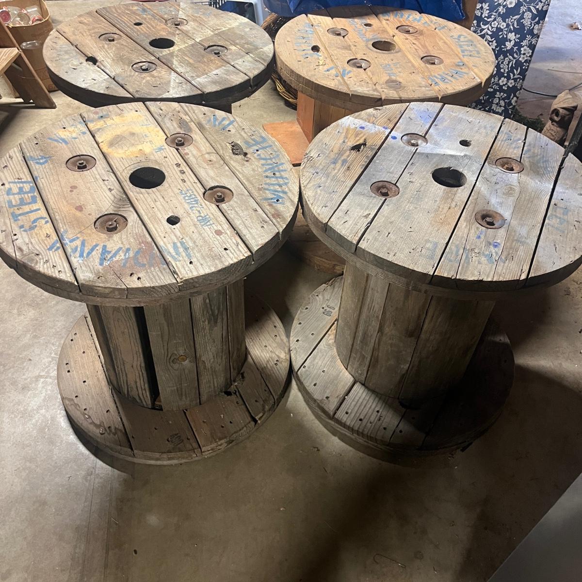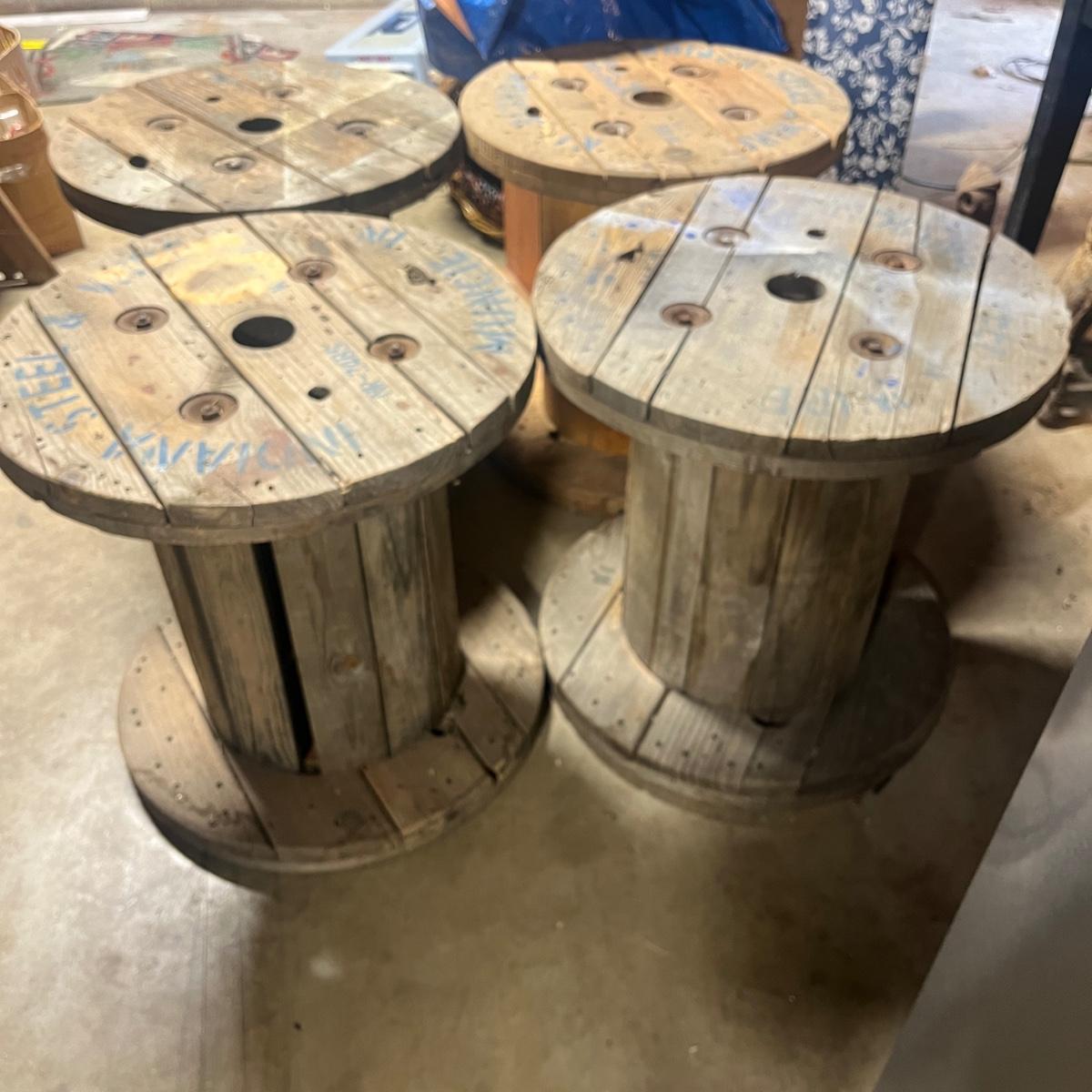 Lot includes four wooden wire spools. Spools measure 23.5”D x 23.5”H. Great to use as unique tables!