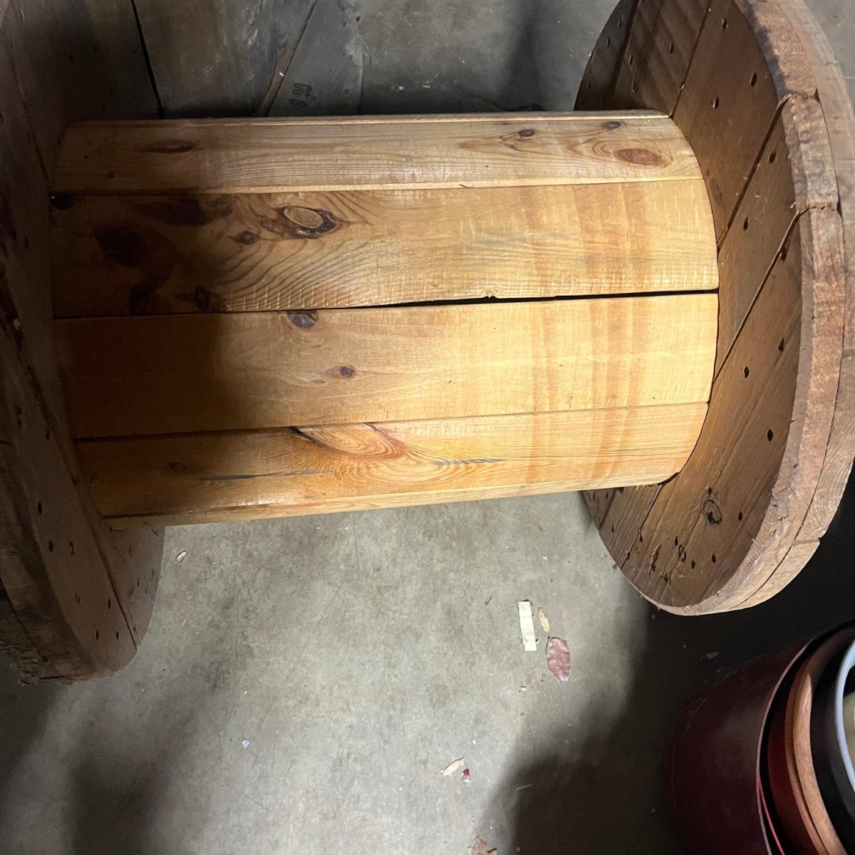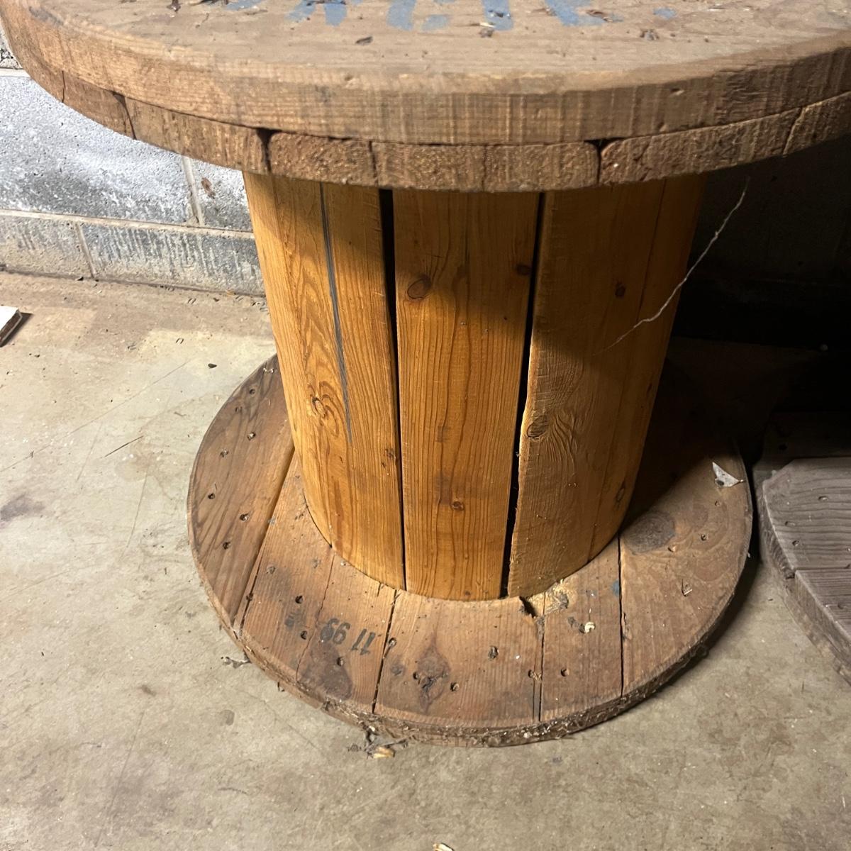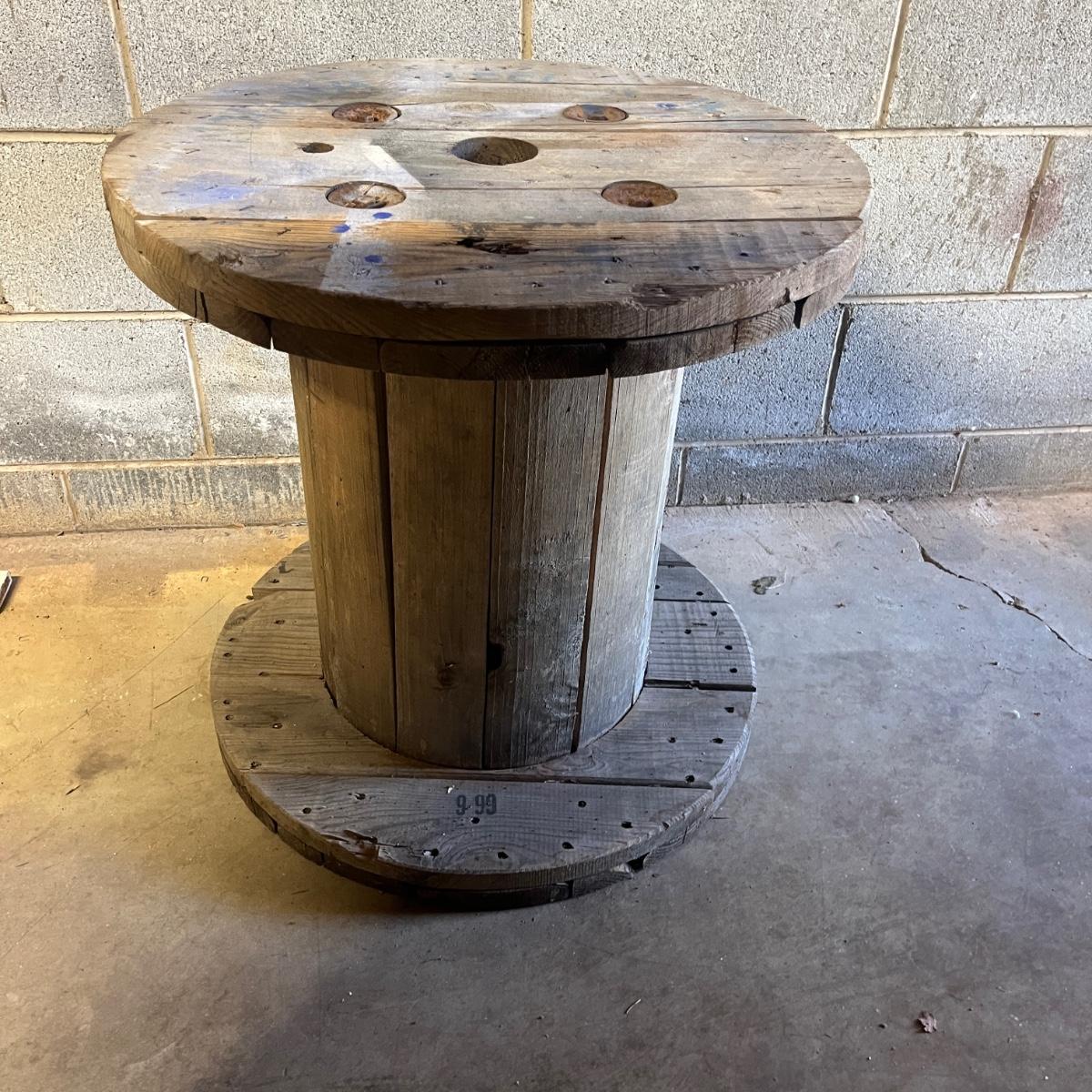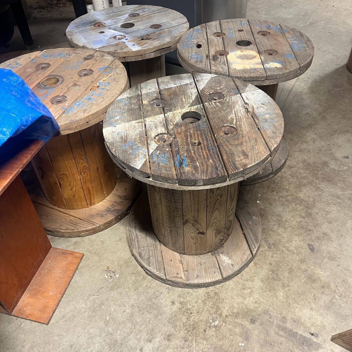 Lot includes four wooden wire spools. Spools measure 23.5”D x 23.5”H. Great to use as unique tables!