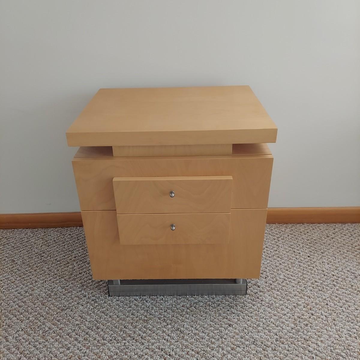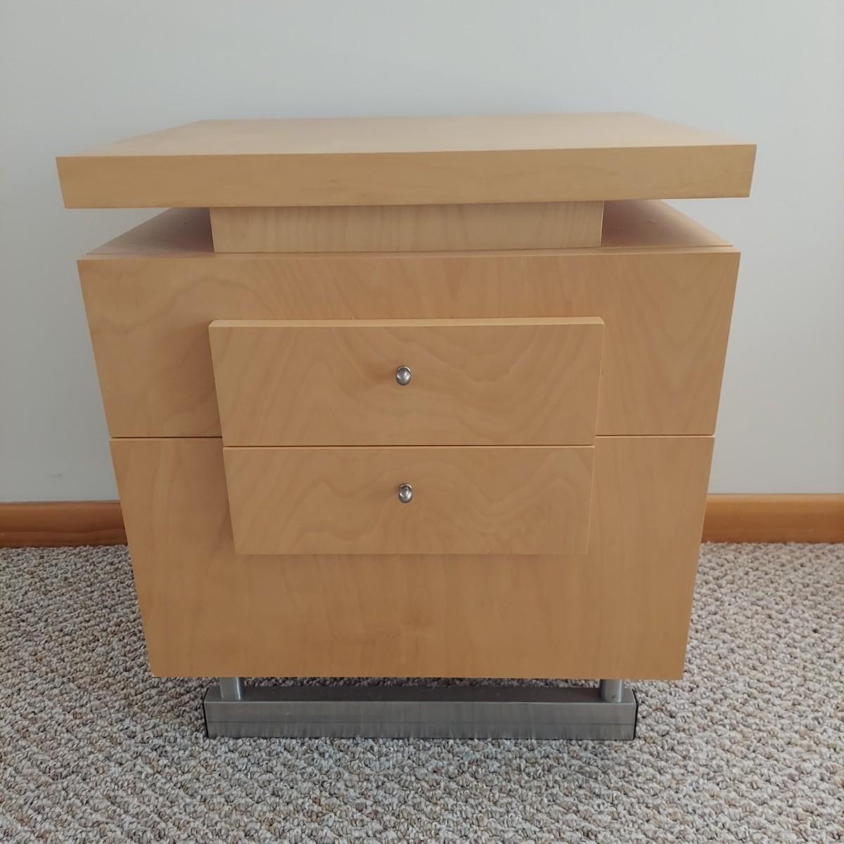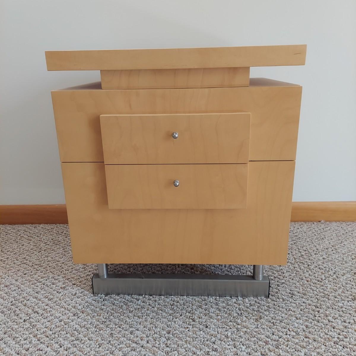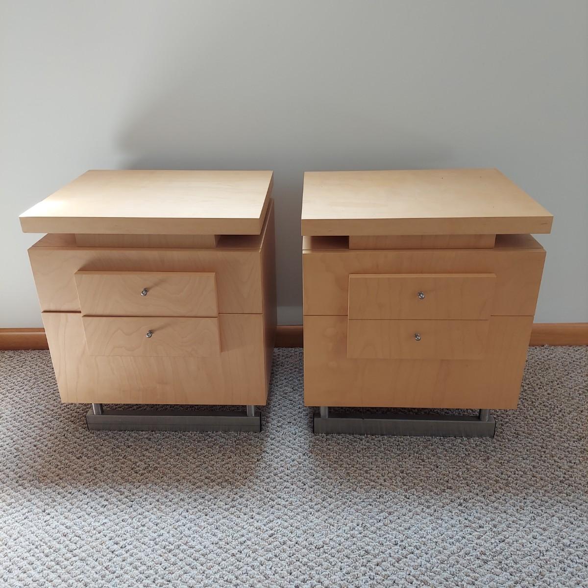 Two blonde wood night stands with metal legs that appear to be Adesso brand. Each table has two drawers. They each measure 20" x 17" x 24"H. These are sturdy and quite heavy. Local Pickup Only. Winning bidder must bring assistance to help move and load this item due to its weight and/or size.