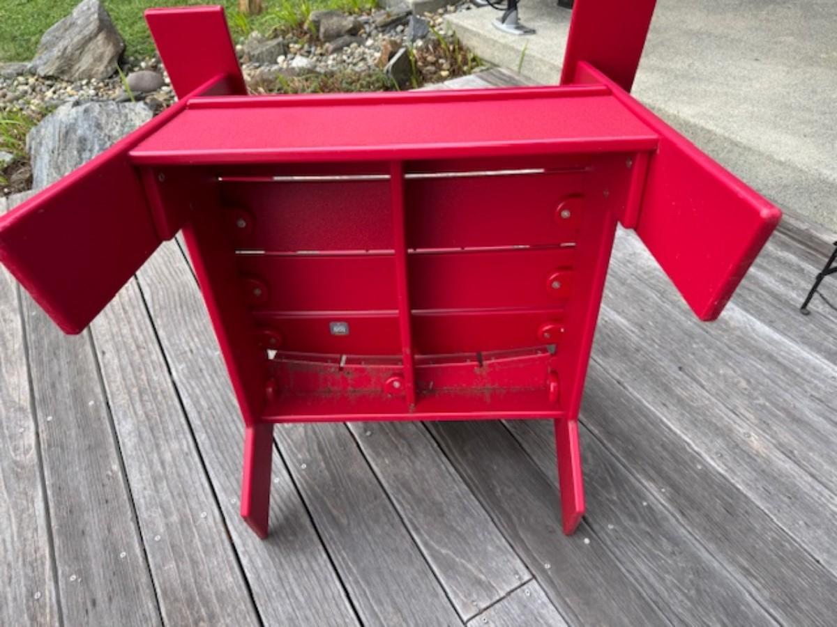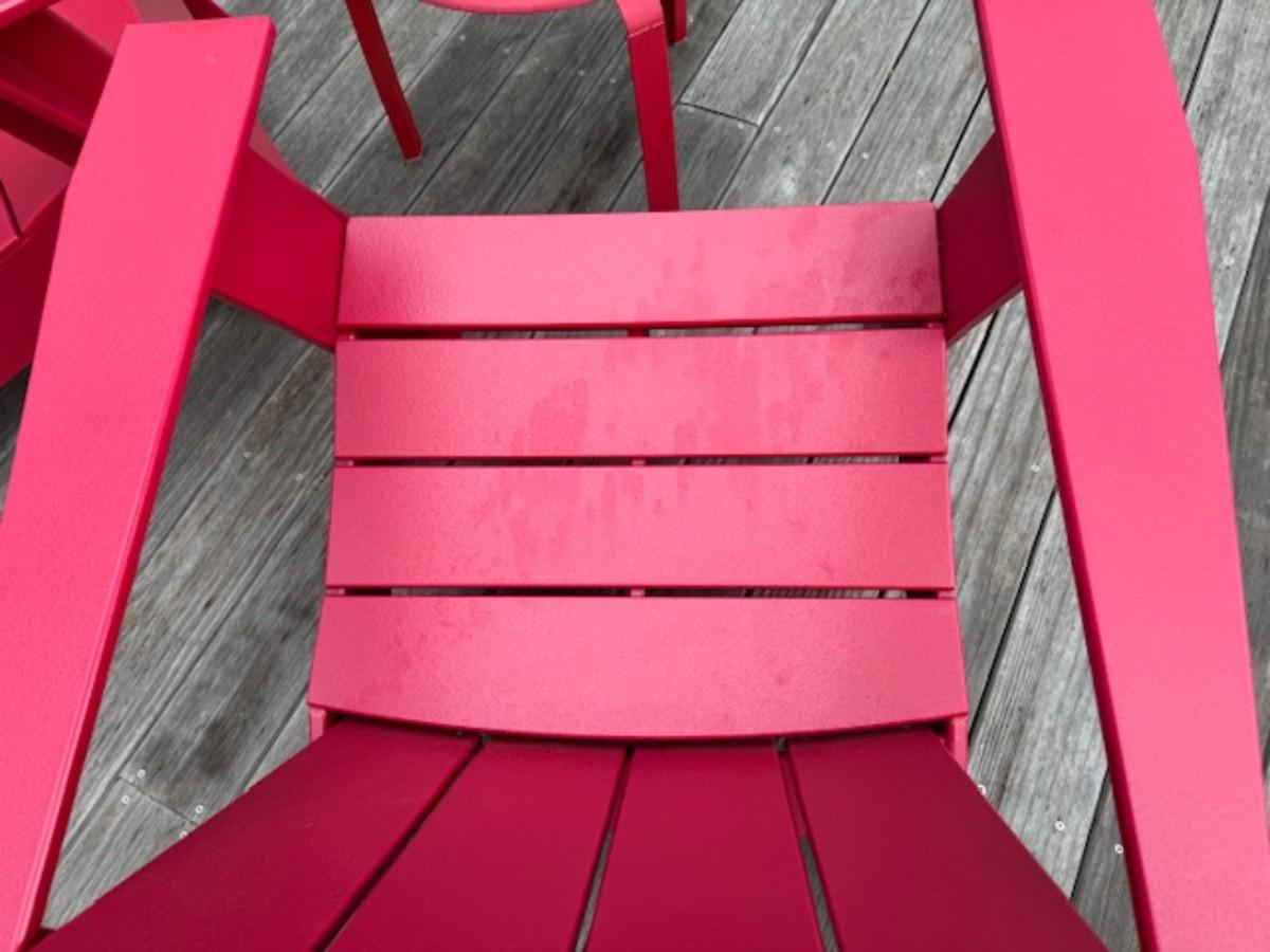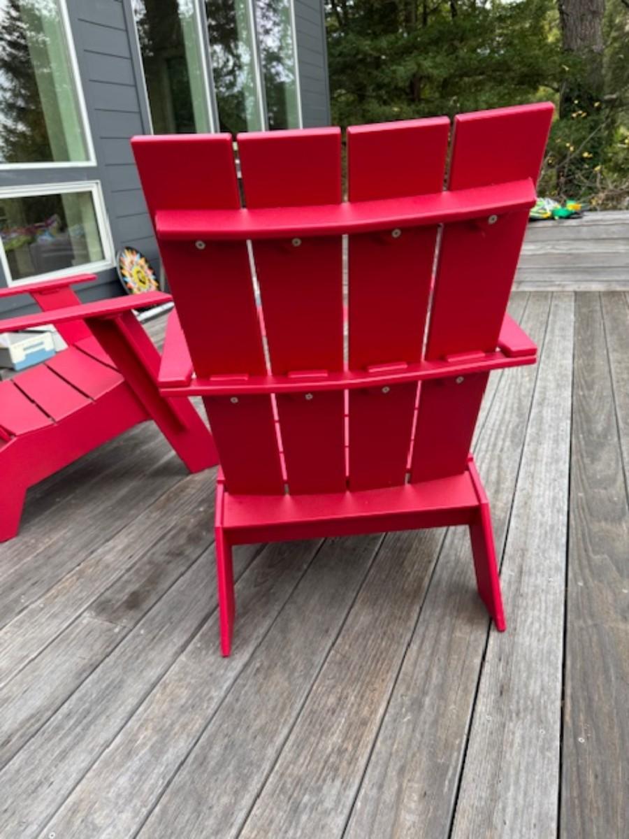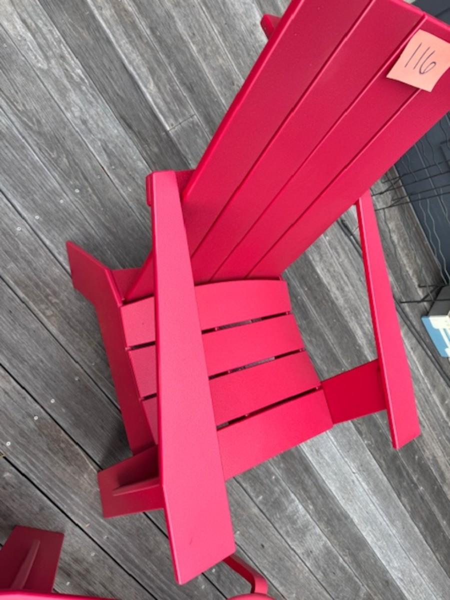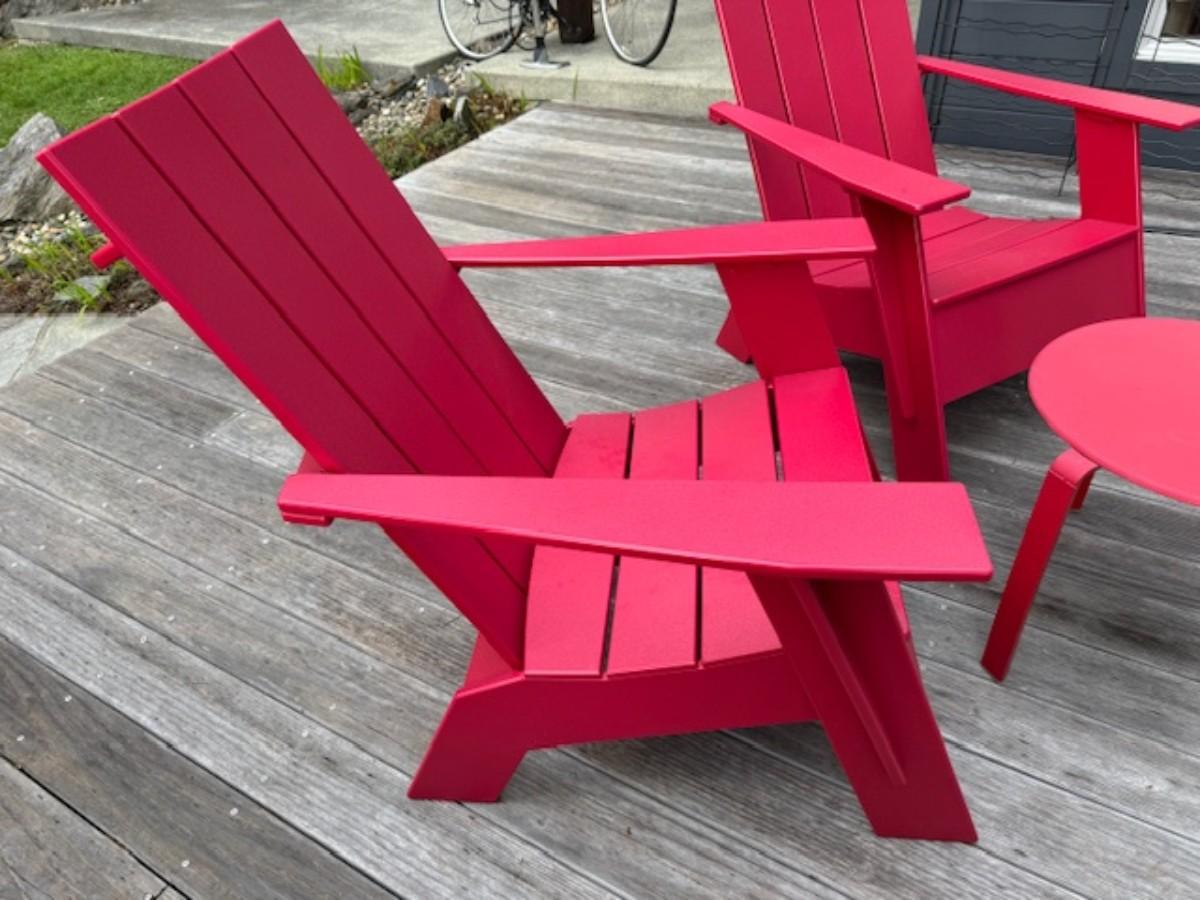Tall apple red Adirondack chairs made by Loll both purchased for $1,790.