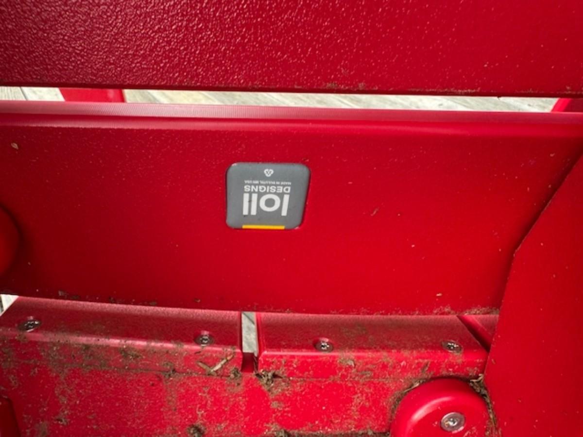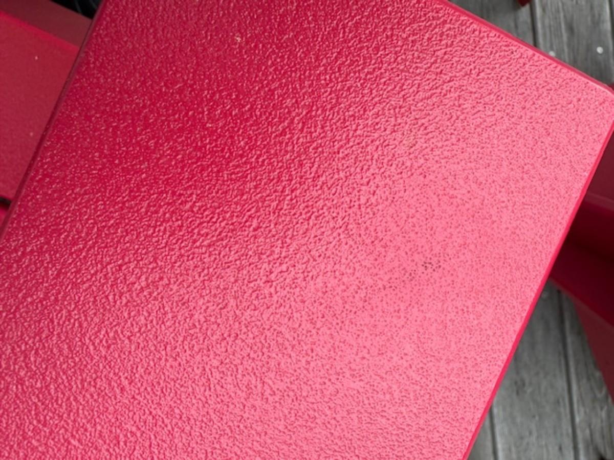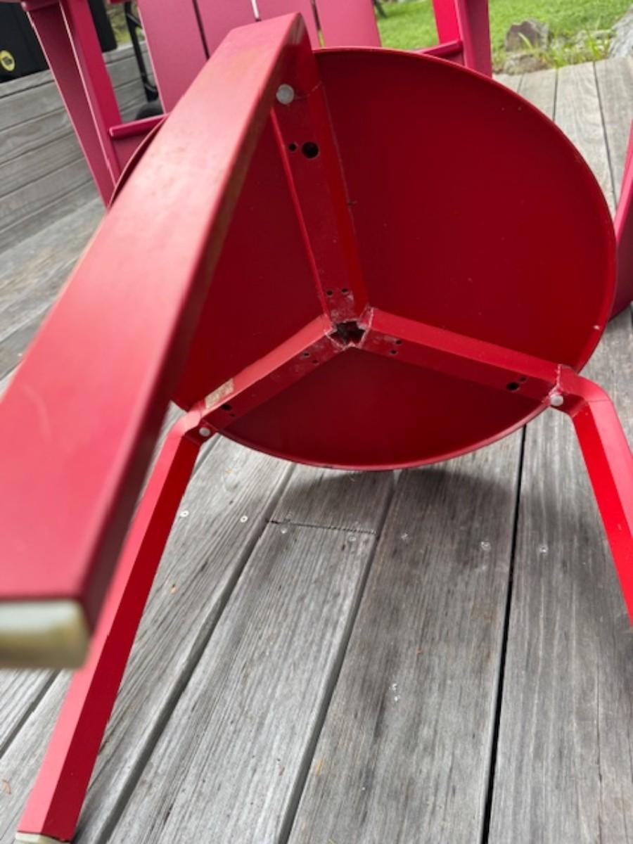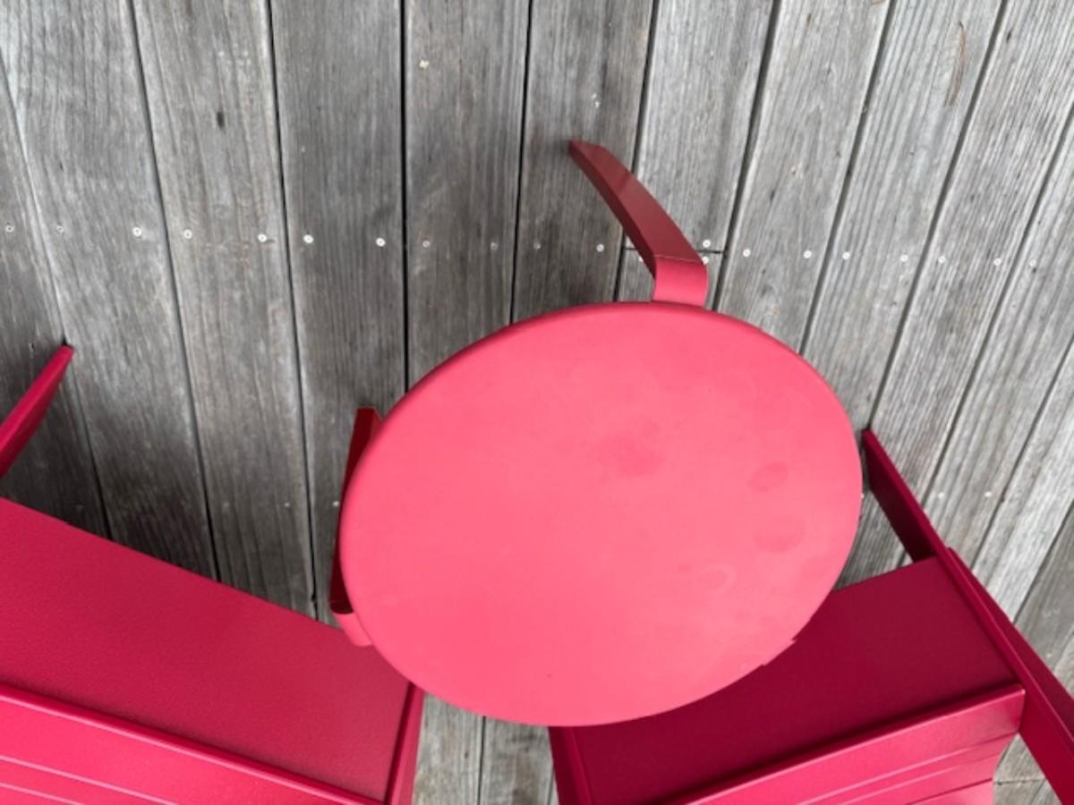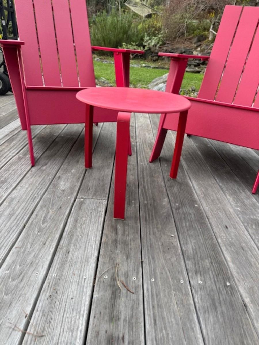Tall apple red Adirondack chairs made by Loll both purchased for $1,790.