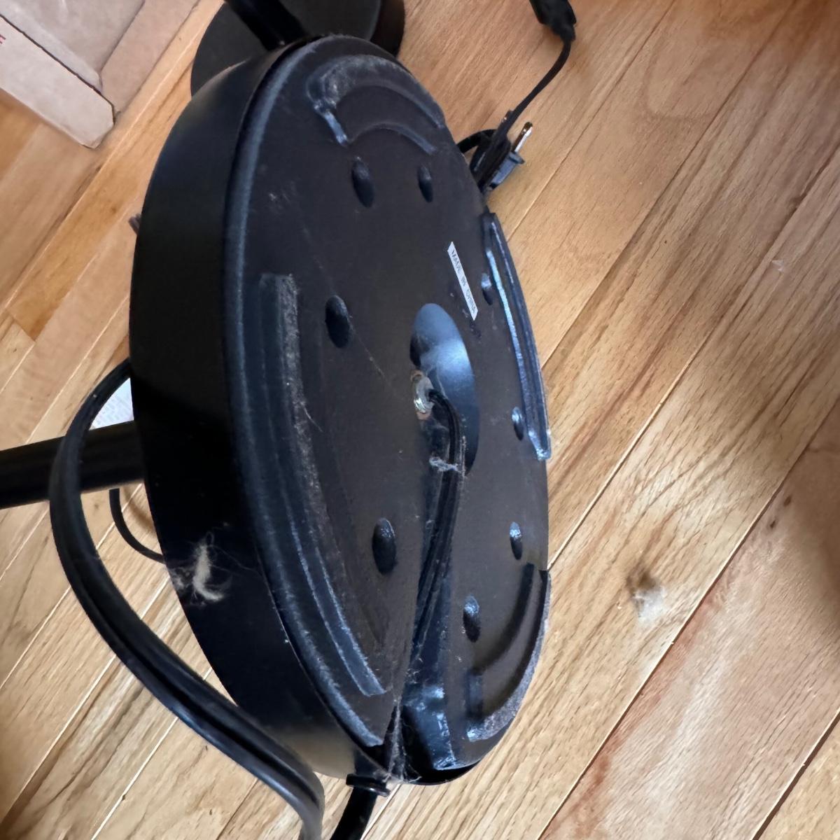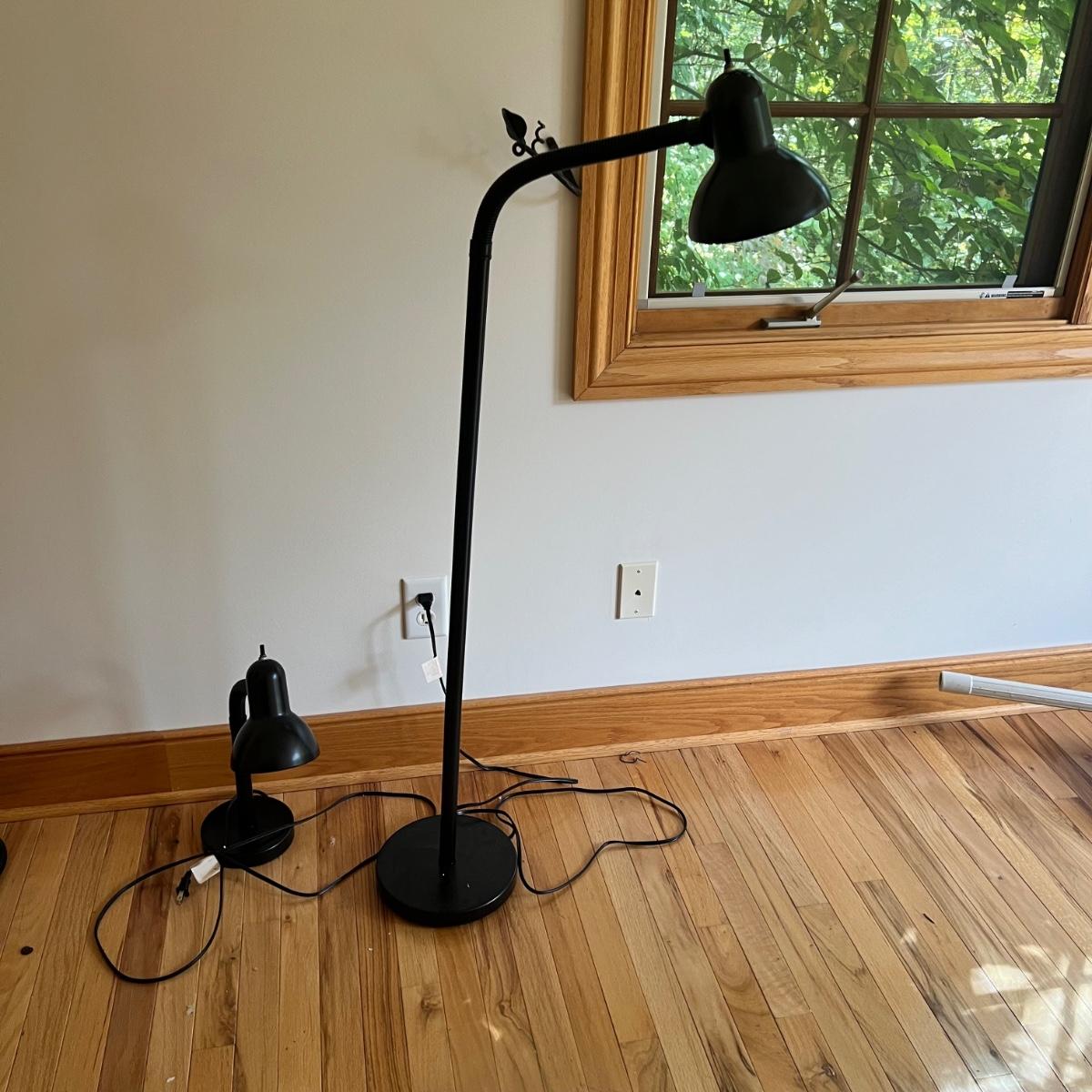 Two black metal lights with adjustable arms. The floor lamp measures 10"D x 43”H and powered on when plugged in. The desk light measures approximately 20”H x 7”D and also powered on when plugged in.