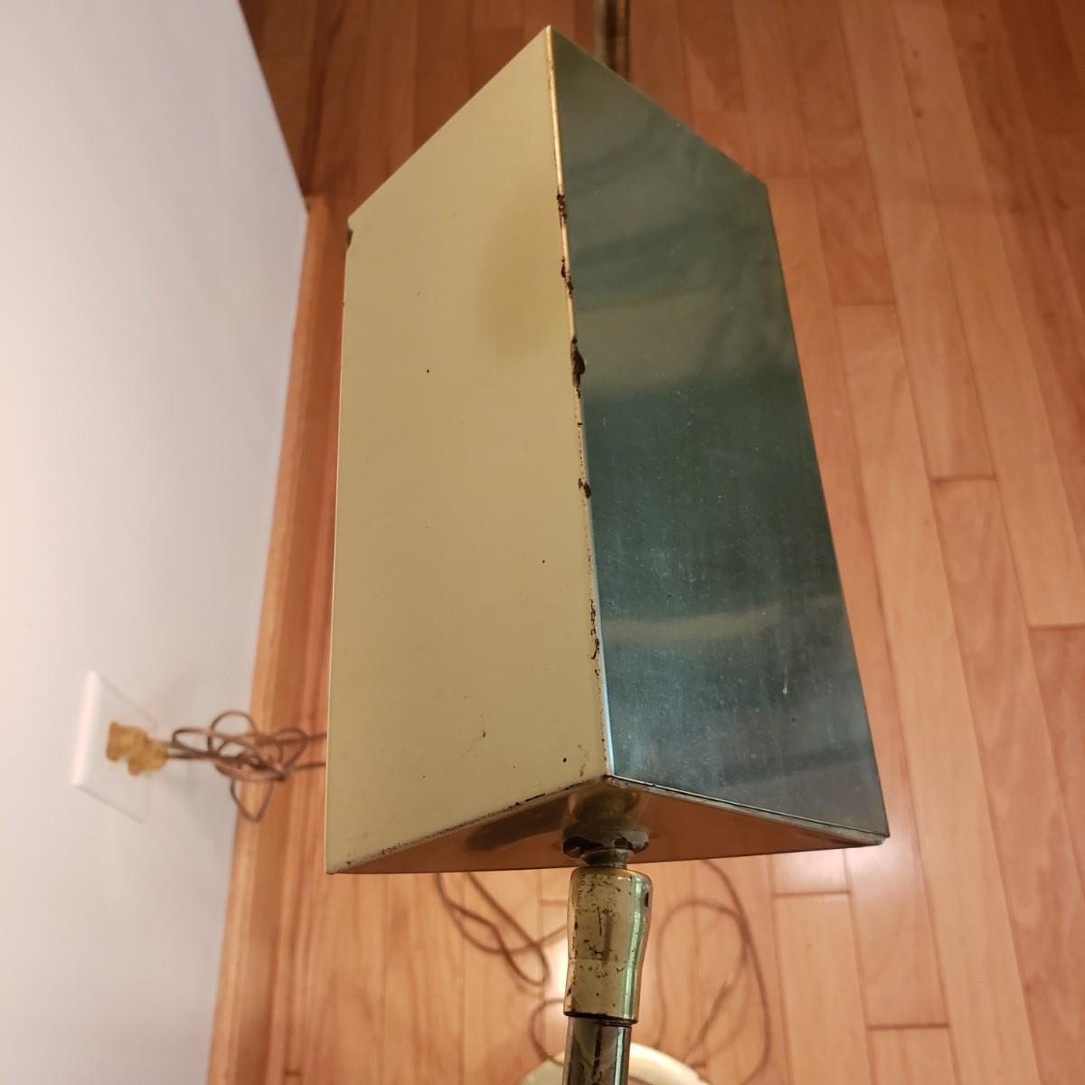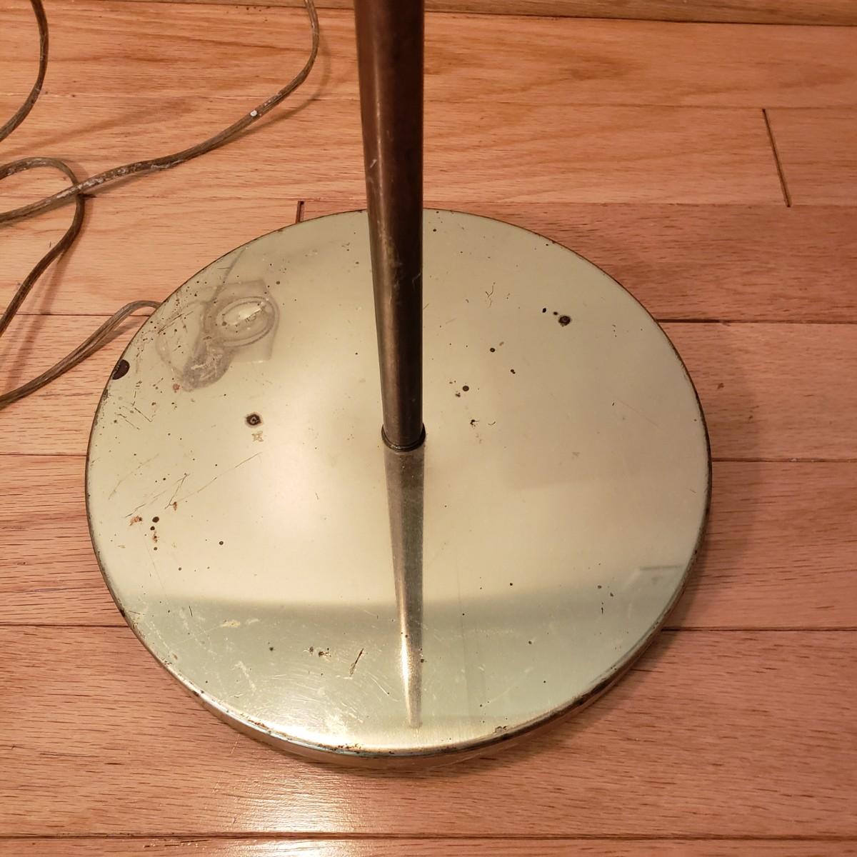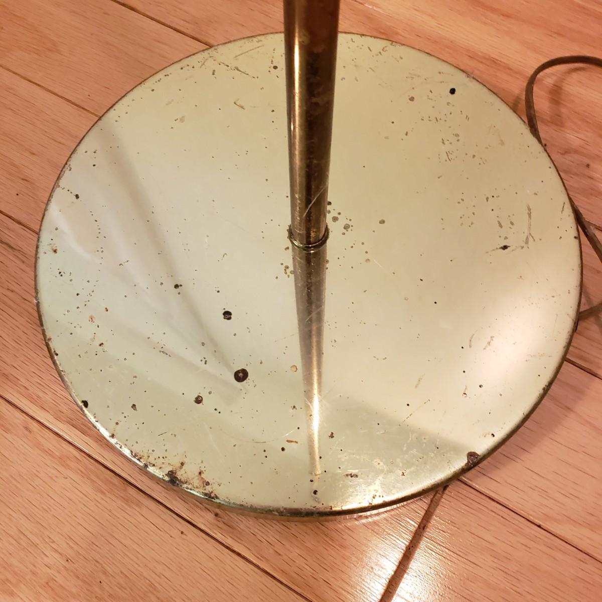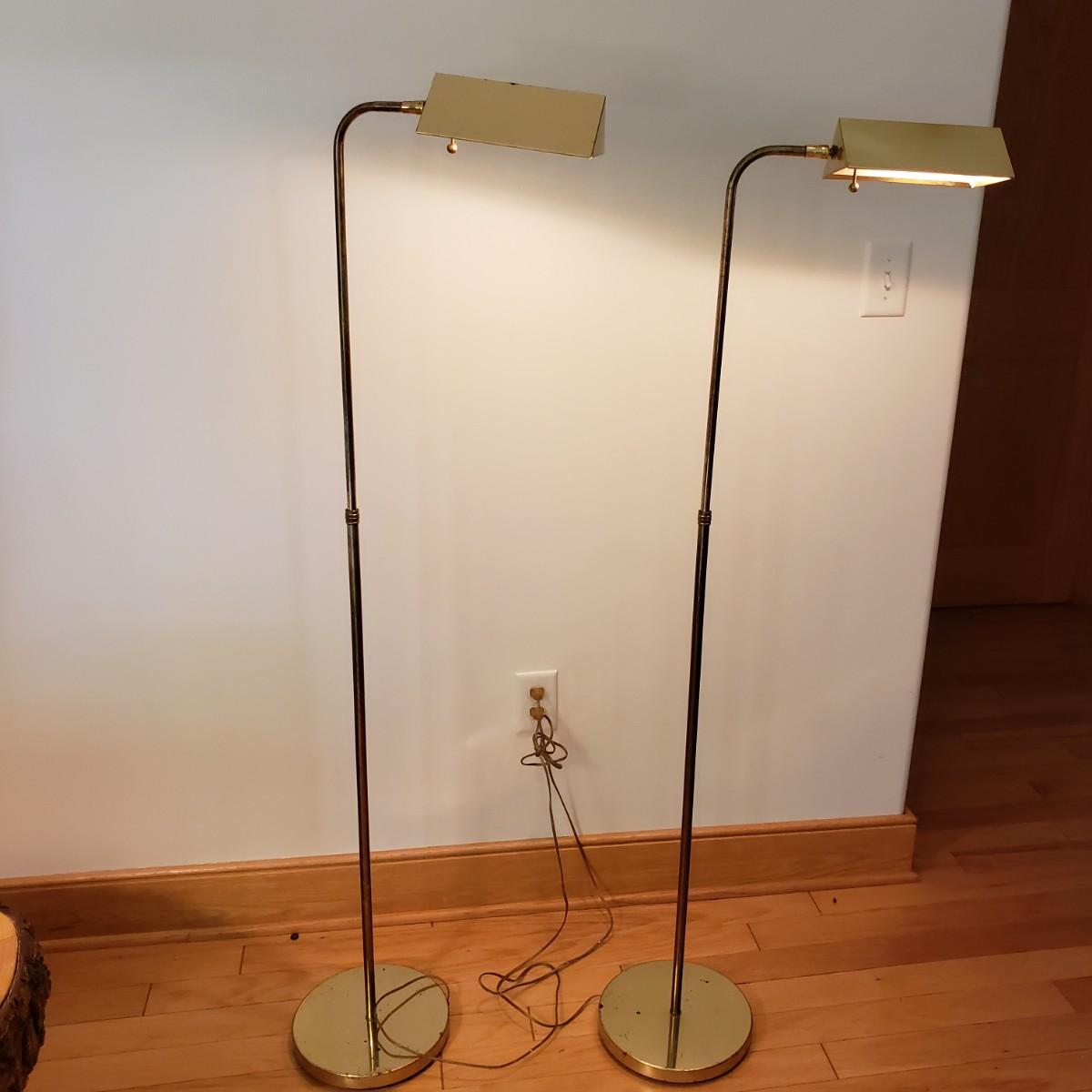 These matching one way switch floor lamps measure 10"D x 45-55"H. The knob half way up the pole adjusts the height of the lamp, see pictures. The brass on both lamps has some spotting. The lamps both powered on when plugged in.