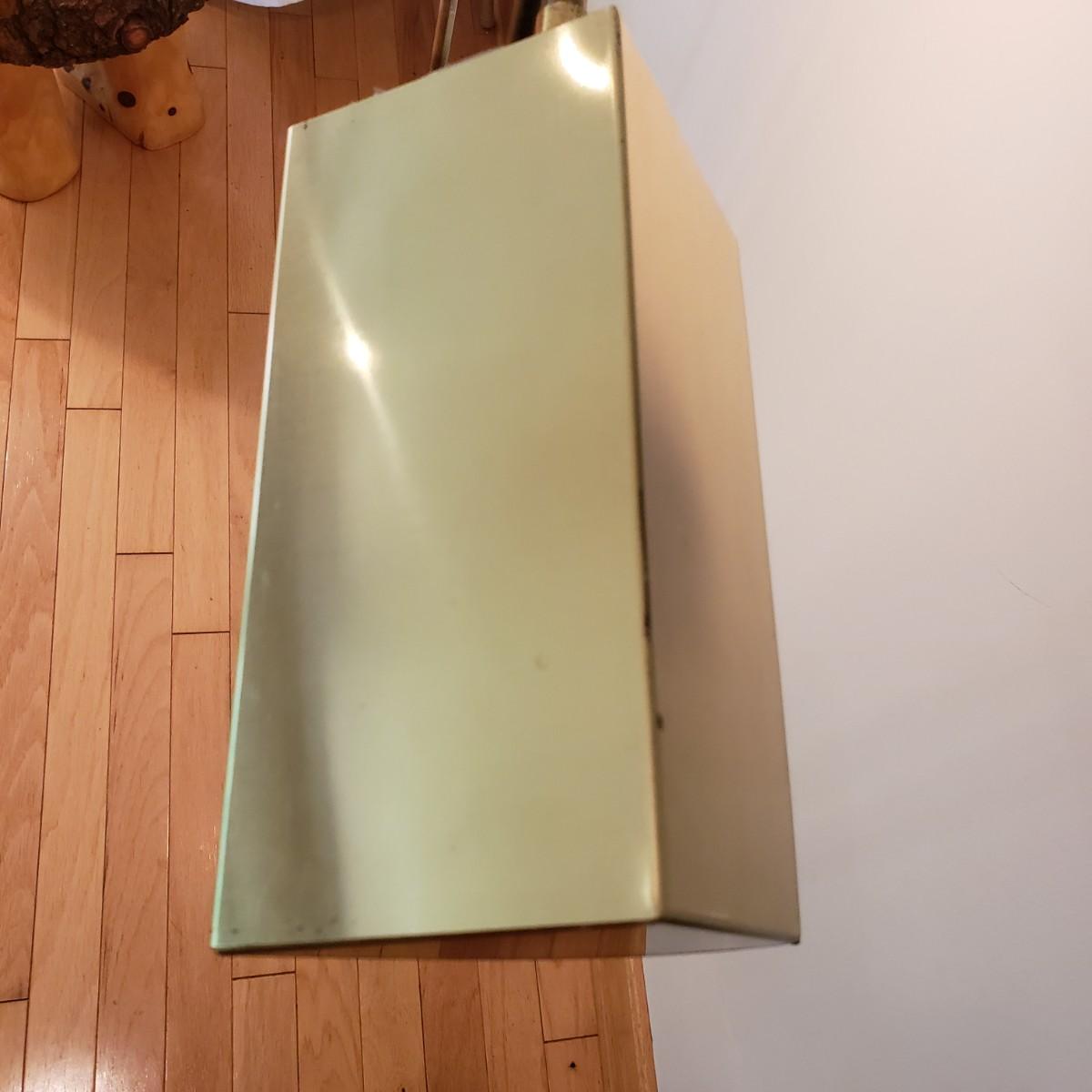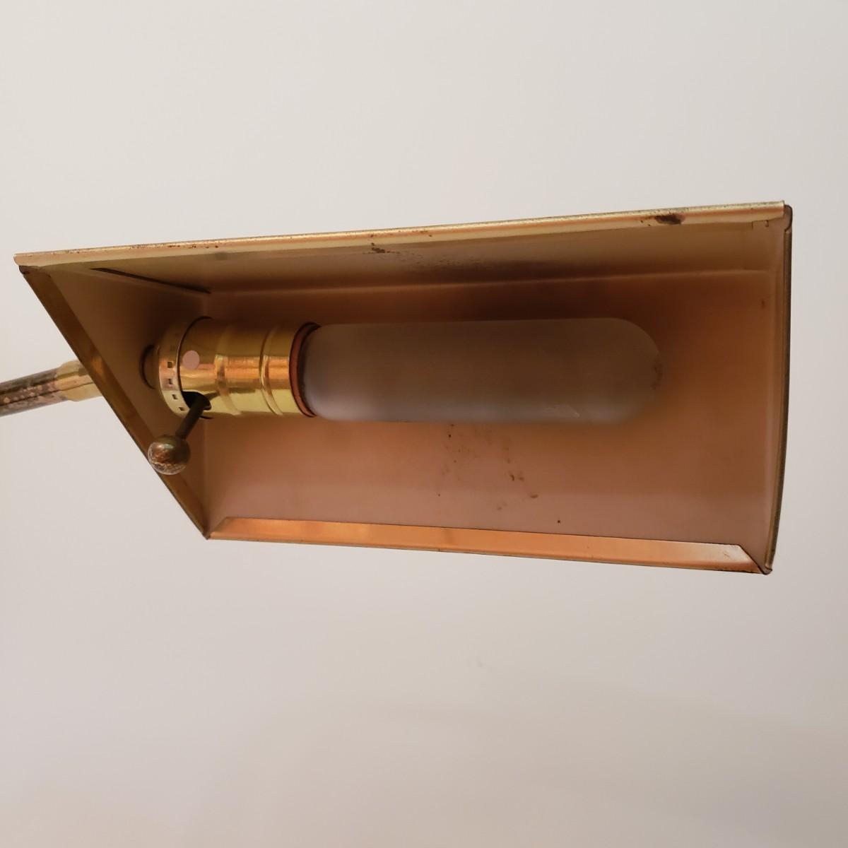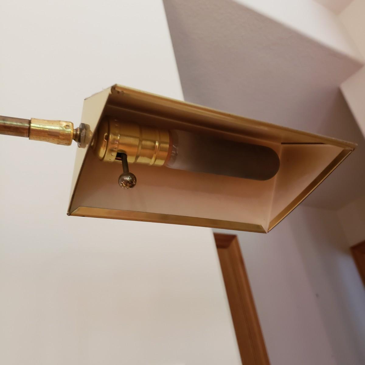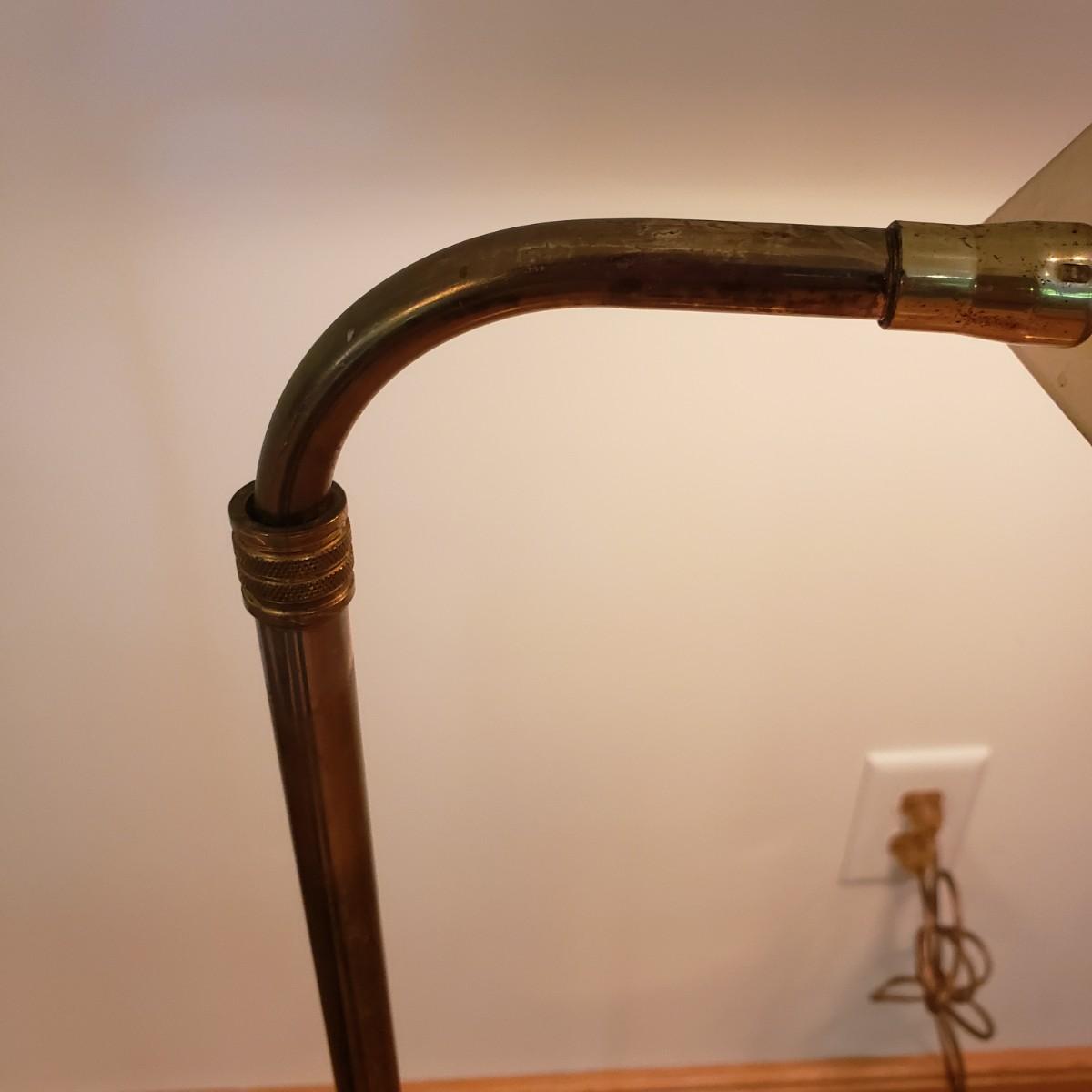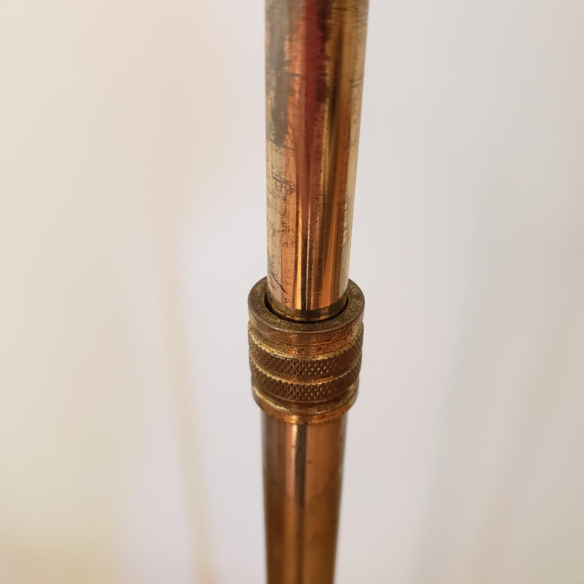 These matching one way switch floor lamps measure 10"D x 45-55"H. The knob half way up the pole adjusts the height of the lamp, see pictures. The brass on both lamps has some spotting. The lamps both powered on when plugged in.
