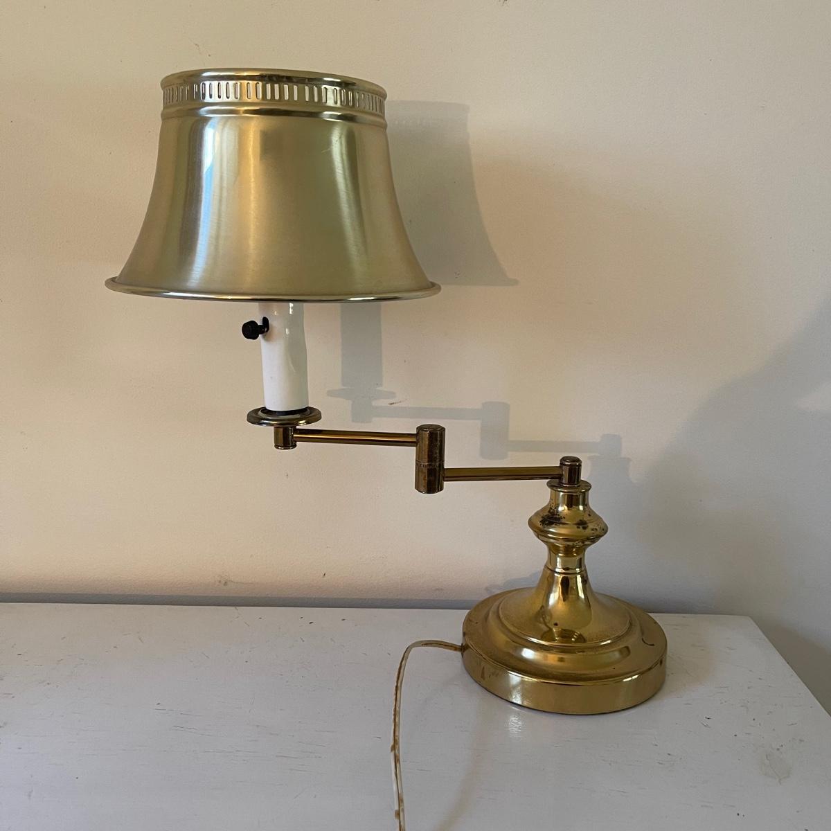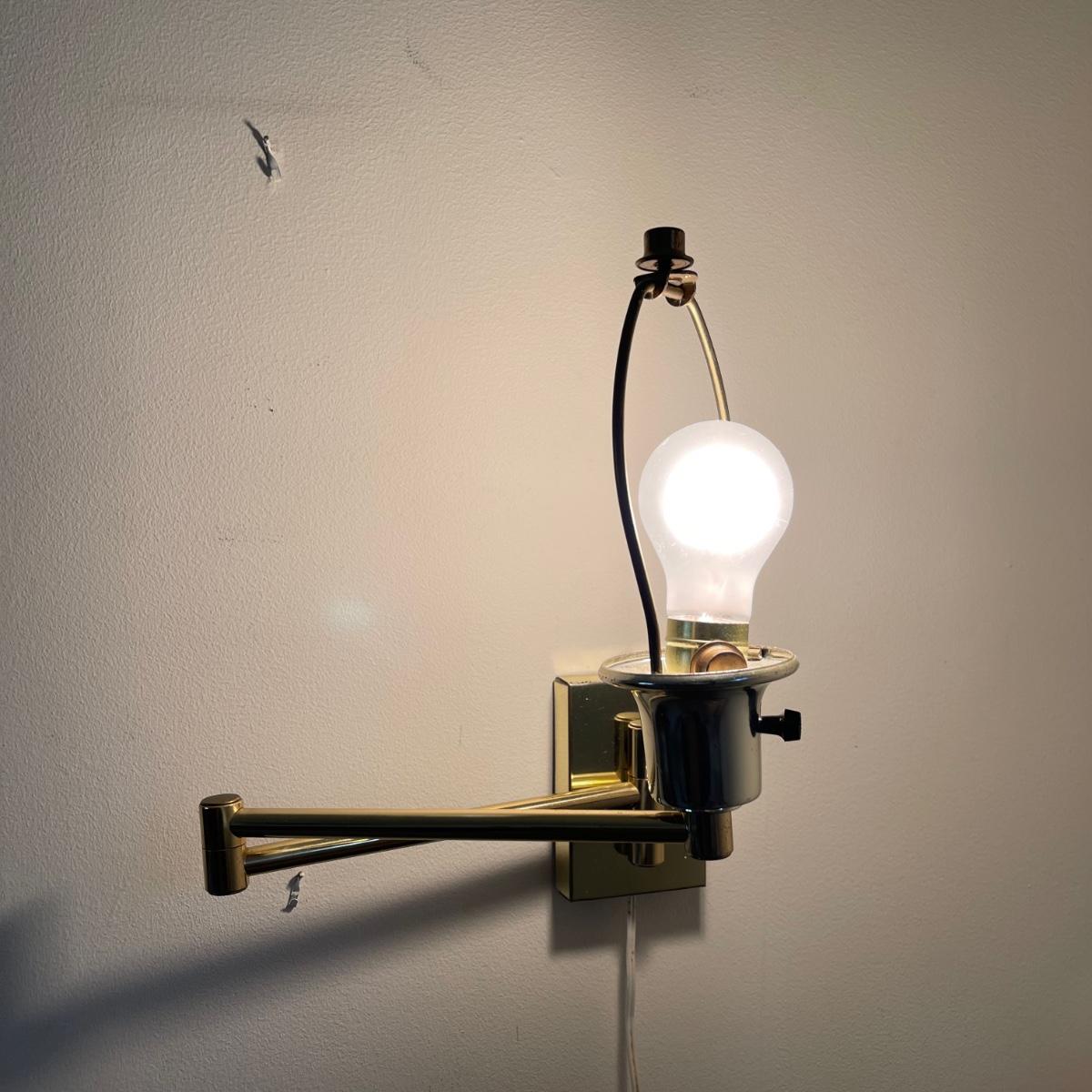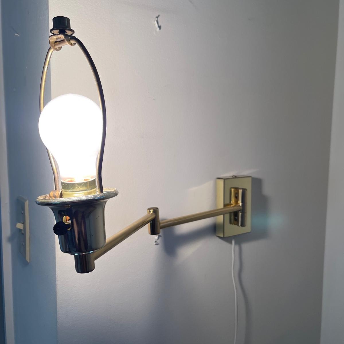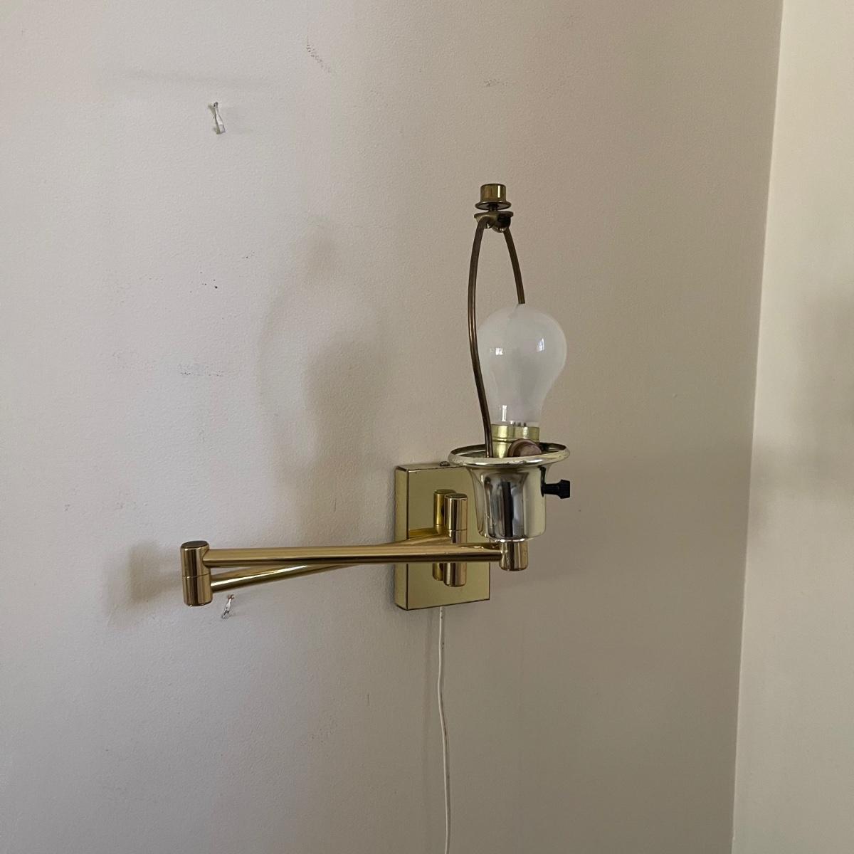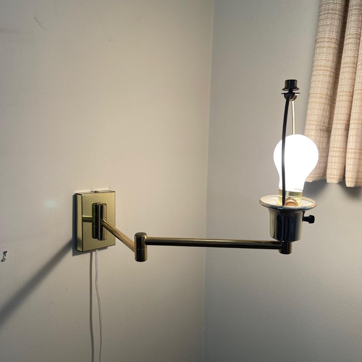 Two adjustable gold colored lamps, one is a desk lamp and the other is a reading light attached to the wall. They both power on. The reading light will need to be removed from the wall, please prepare to do that.