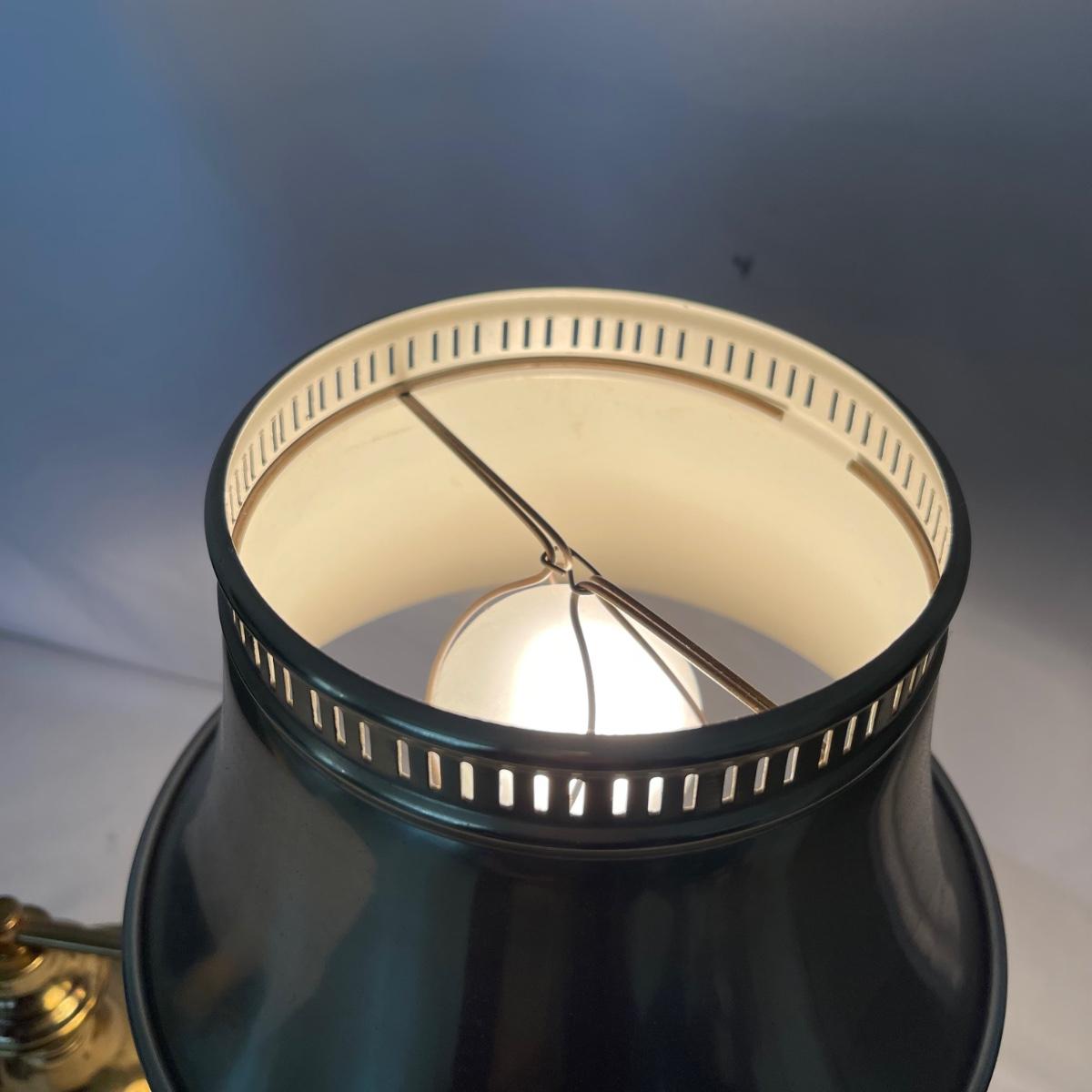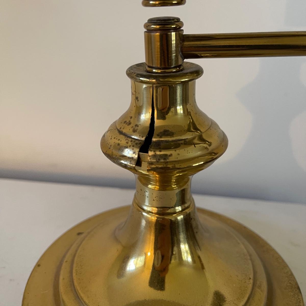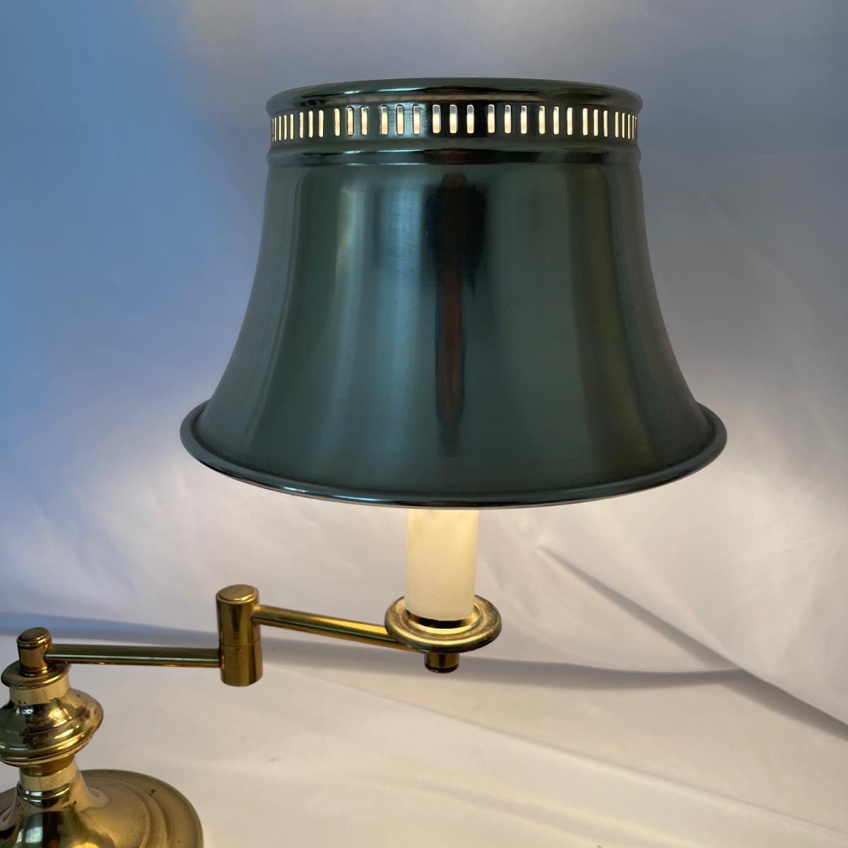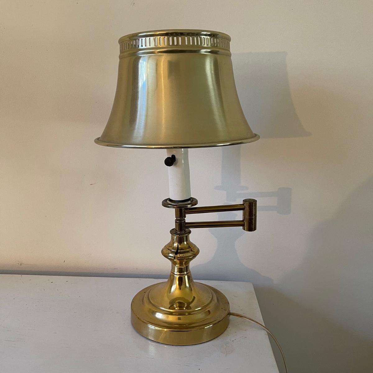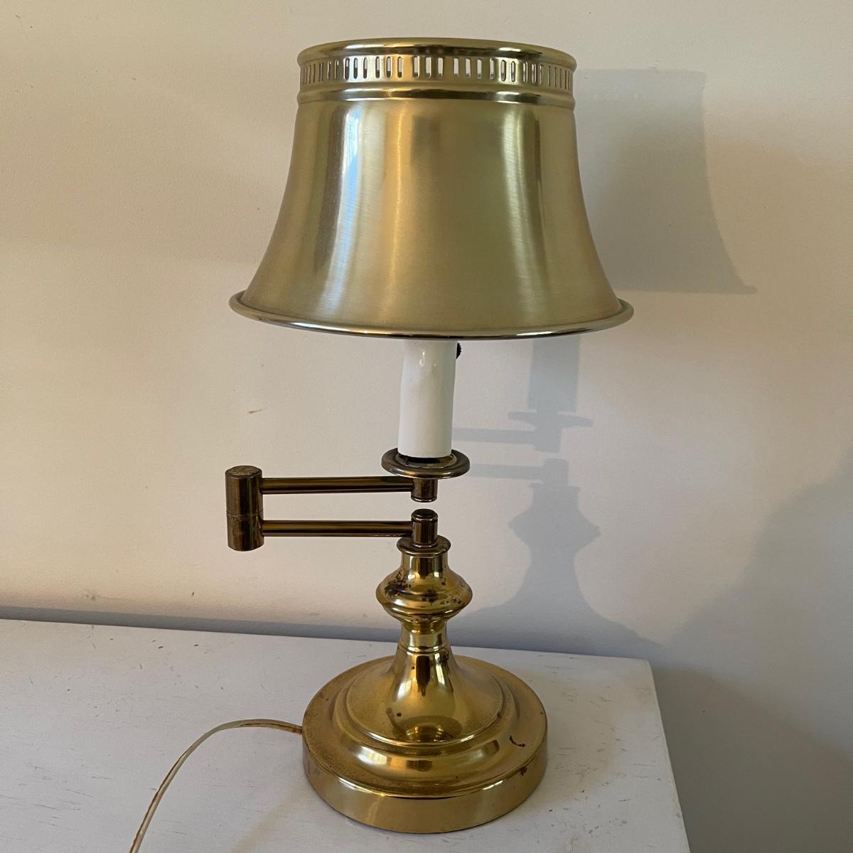 Two adjustable gold colored lamps, one is a desk lamp and the other is a reading light attached to the wall. They both power on. The reading light will need to be removed from the wall, please prepare to do that.