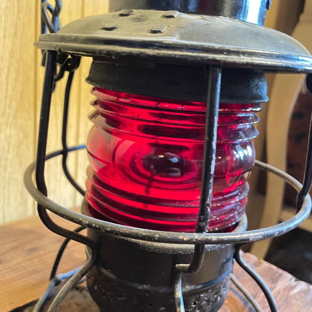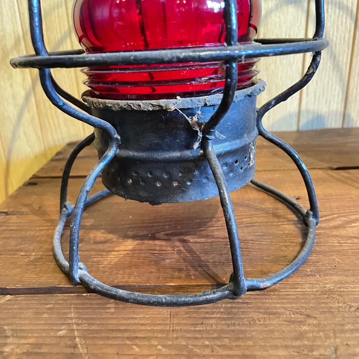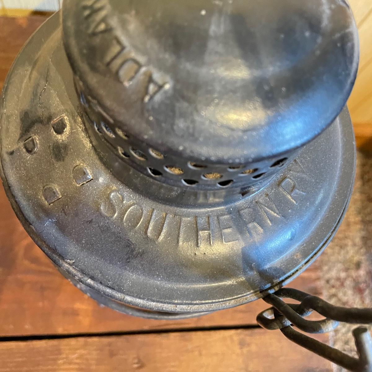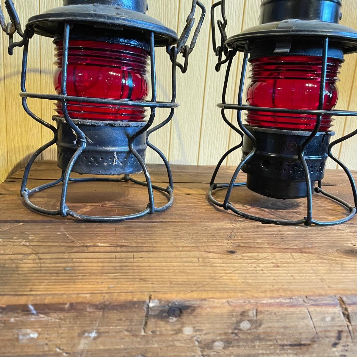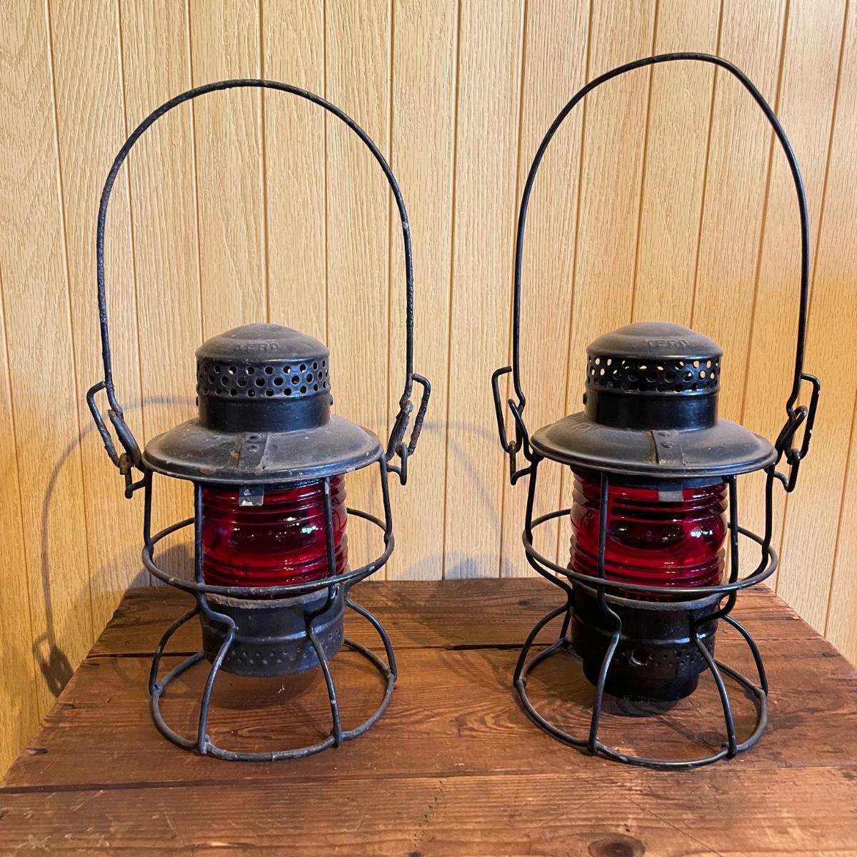 Two Adlake Southern Railway red globe lanterns. The lamp featured on the left is missing it’s bottom and shows a bit more wear. See images. Both lamps are roughly 6”d x 15” to the top of its raised handle. Shipping available.
