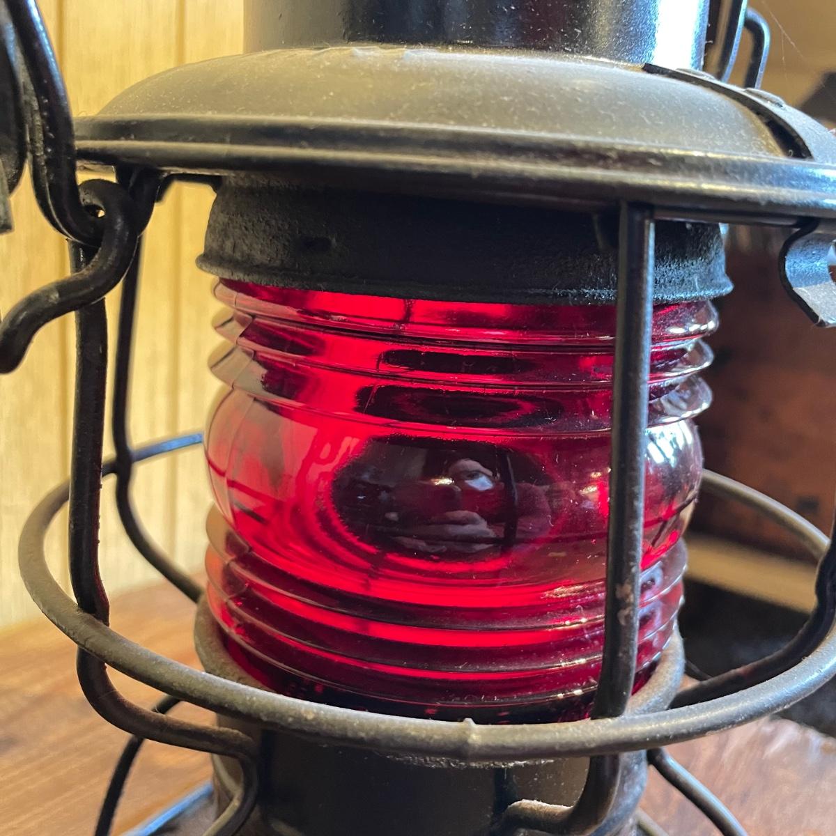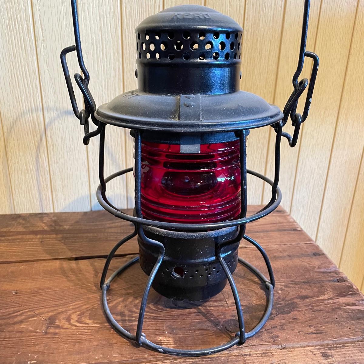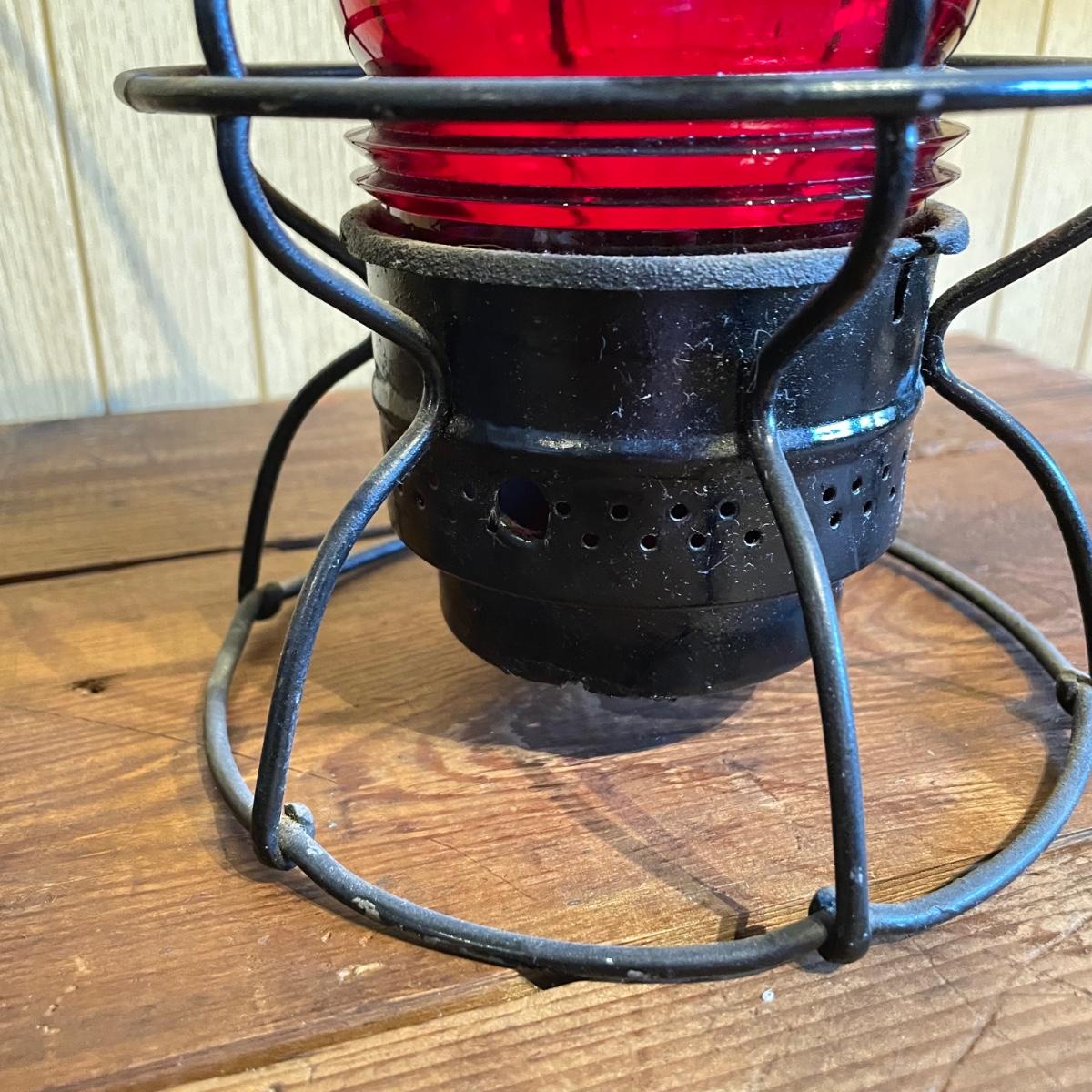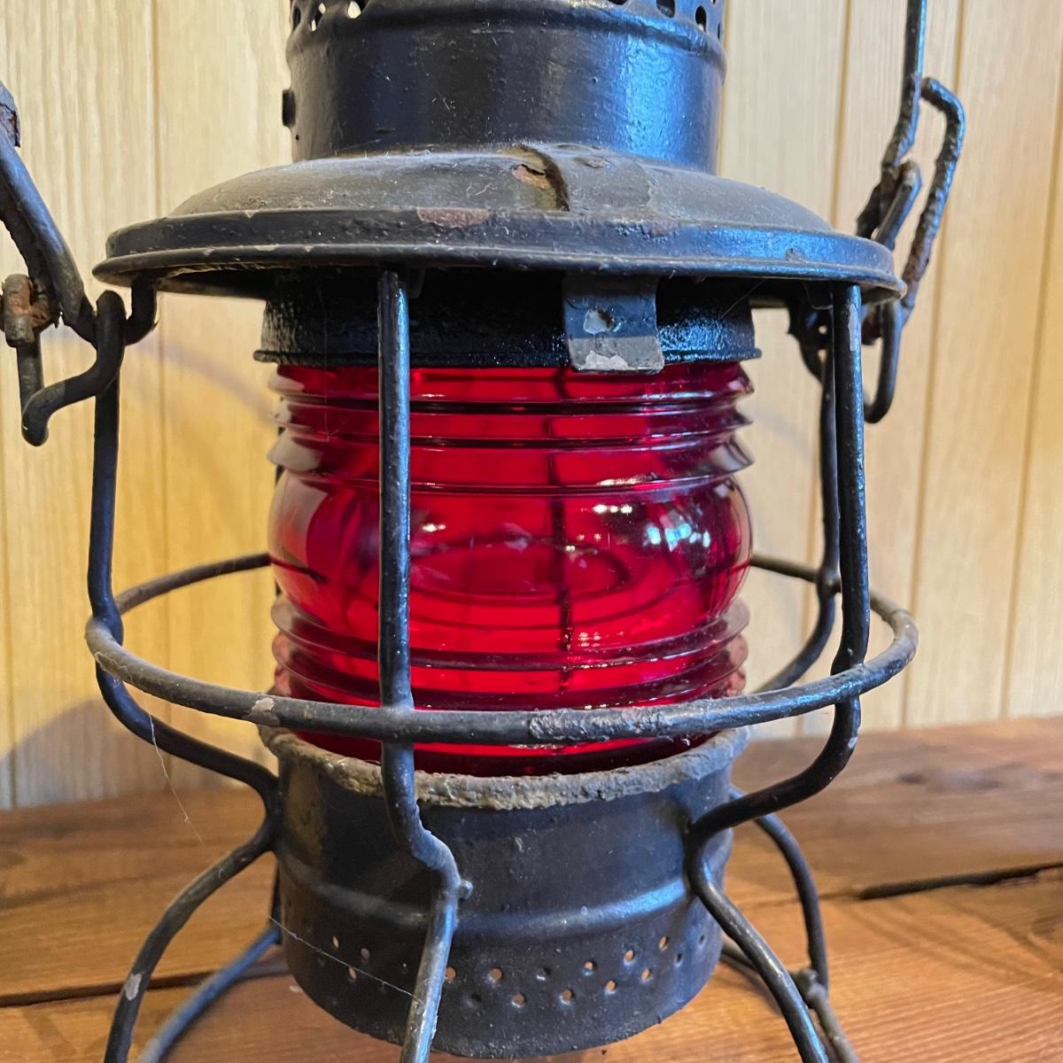 Two Adlake Southern Railway red globe lanterns. The lamp featured on the left is missing it’s bottom and shows a bit more wear. See images. Both lamps are roughly 6”d x 15” to the top of its raised handle. Shipping available.