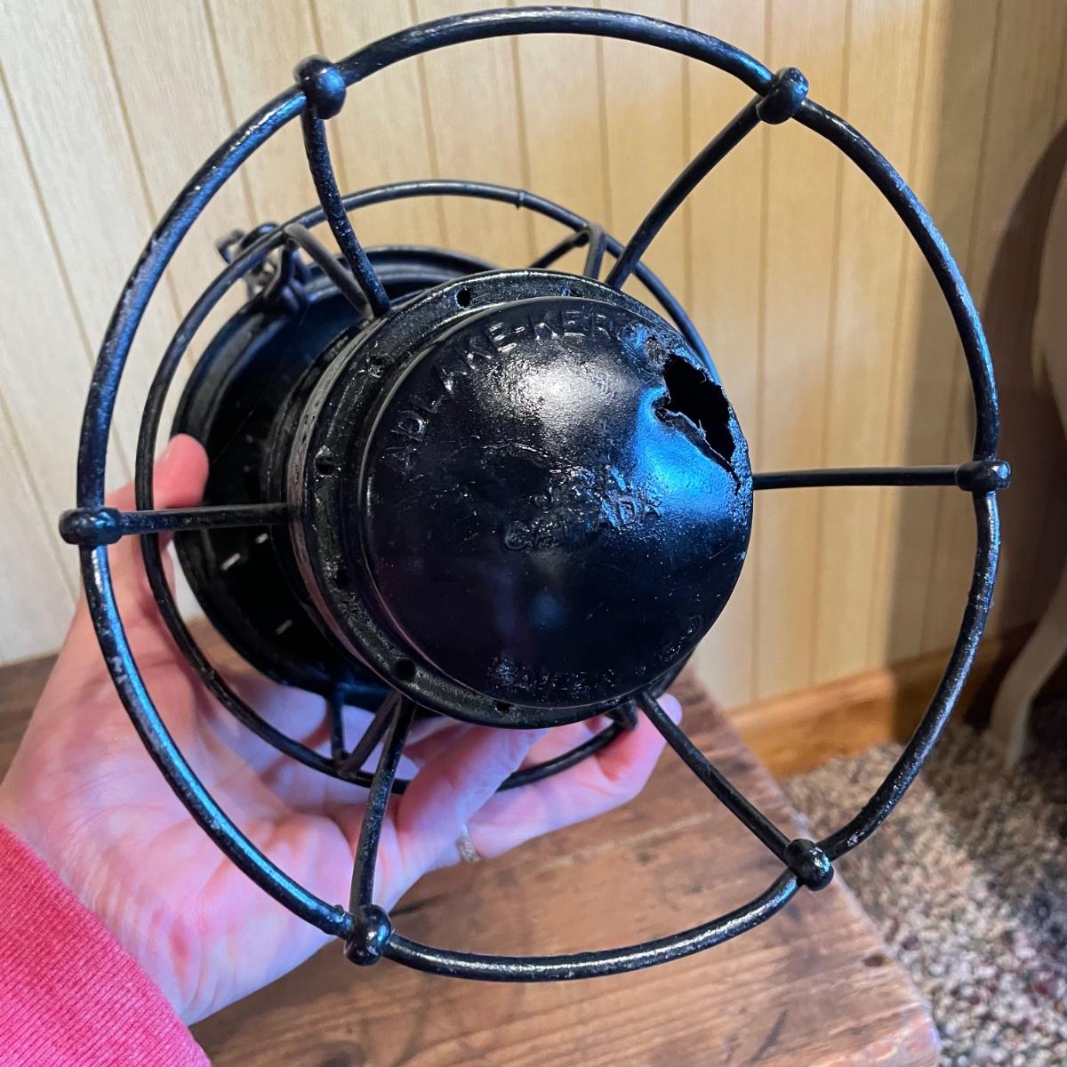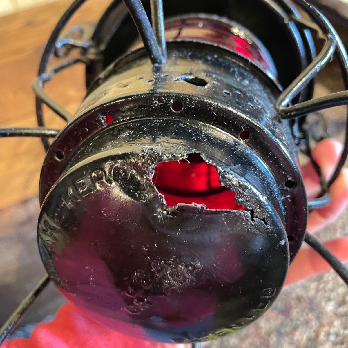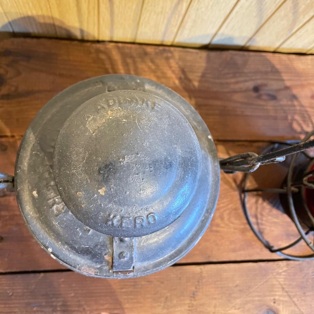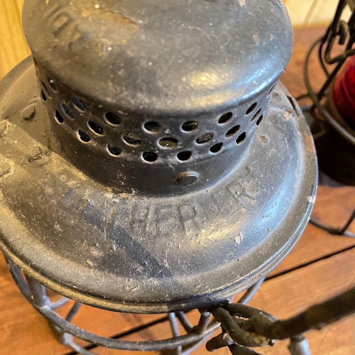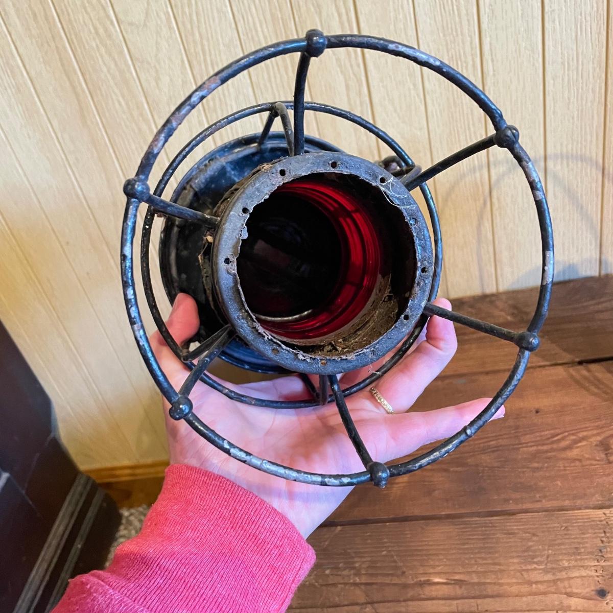 Two Adlake Southern Railway red globe lanterns. The lamp featured on the left is missing it’s bottom and shows a bit more wear. See images. Both lamps are roughly 6”d x 15” to the top of its raised handle. Shipping available.