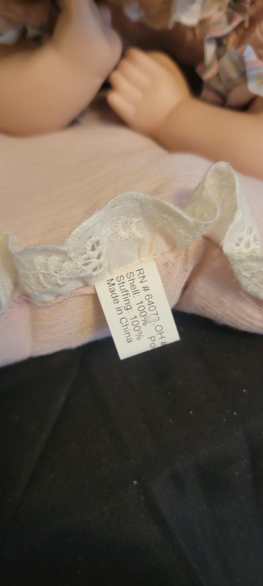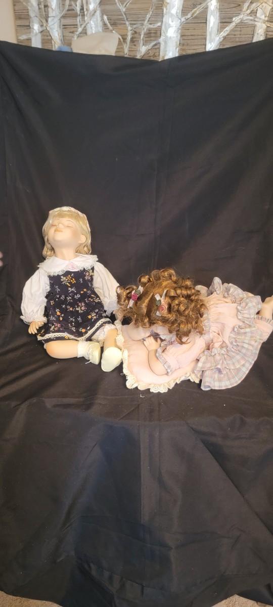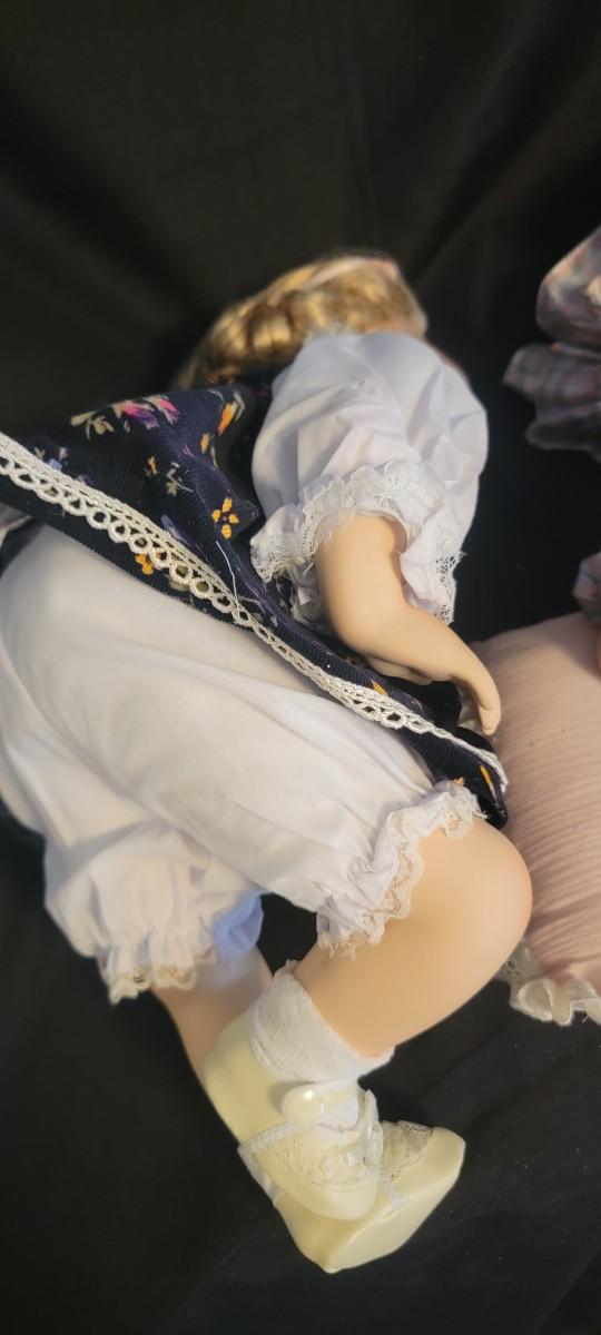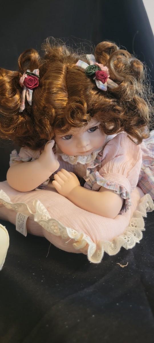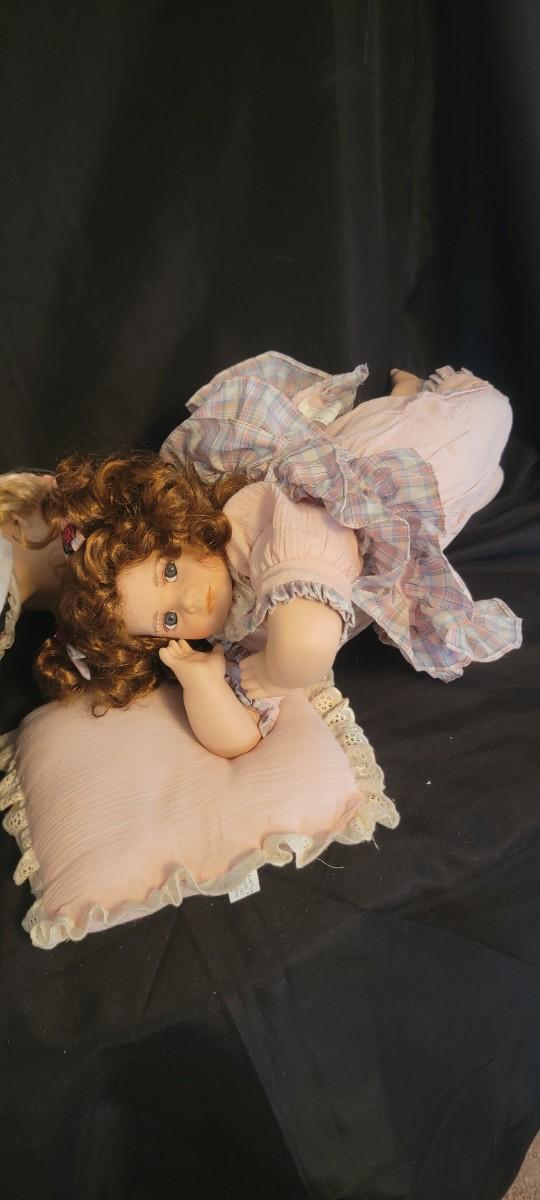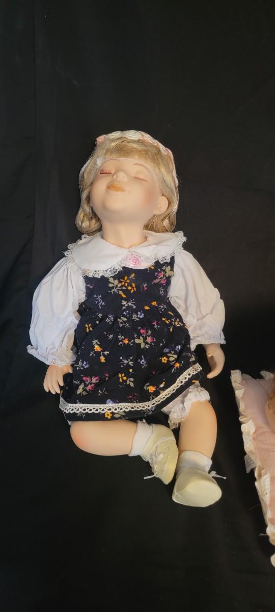 Two adorable dolls. Pretty in pink on a pillow and one with a pinafore dress...too cute!
