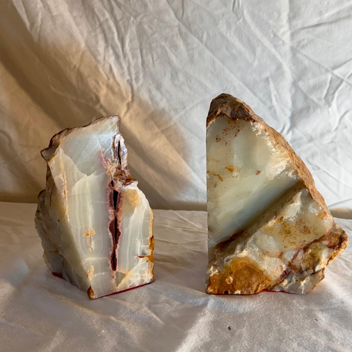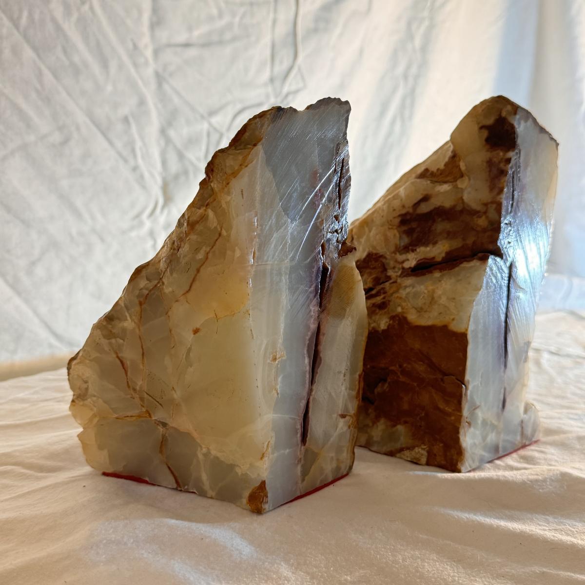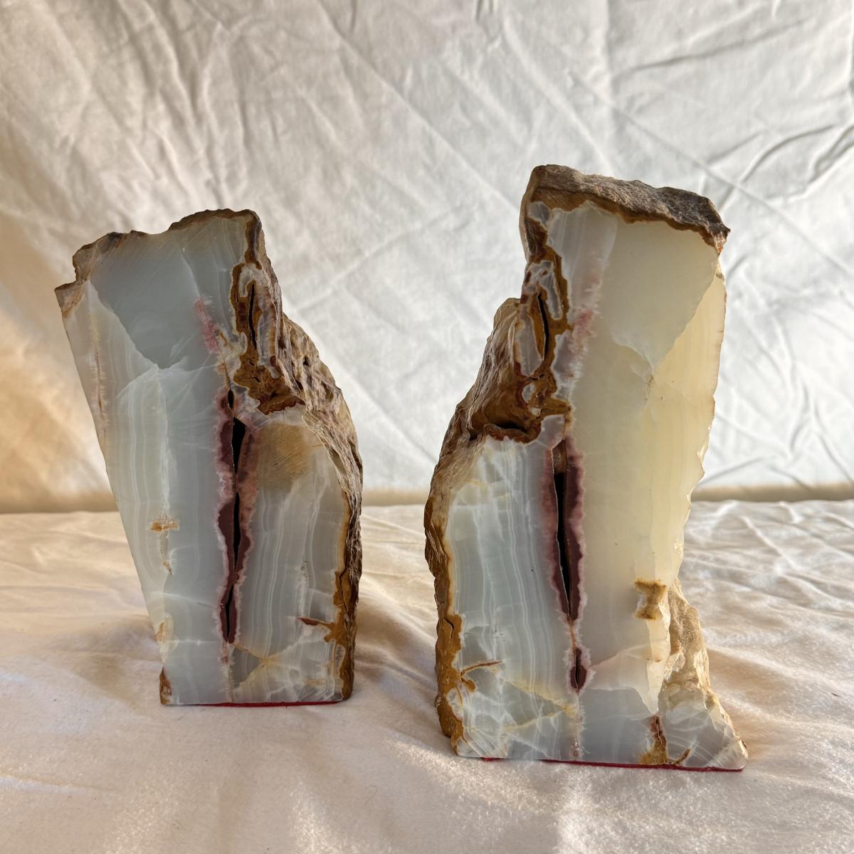 Lot includes two agate book ends that have a felted bottom for traction. The larger book end measures 4” x 4” x 8” and the smaller 3” x 4.5” x 7”H. Shipping available.