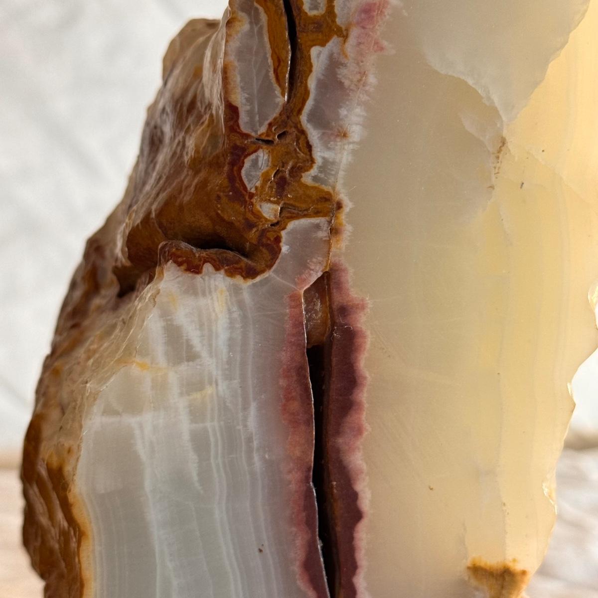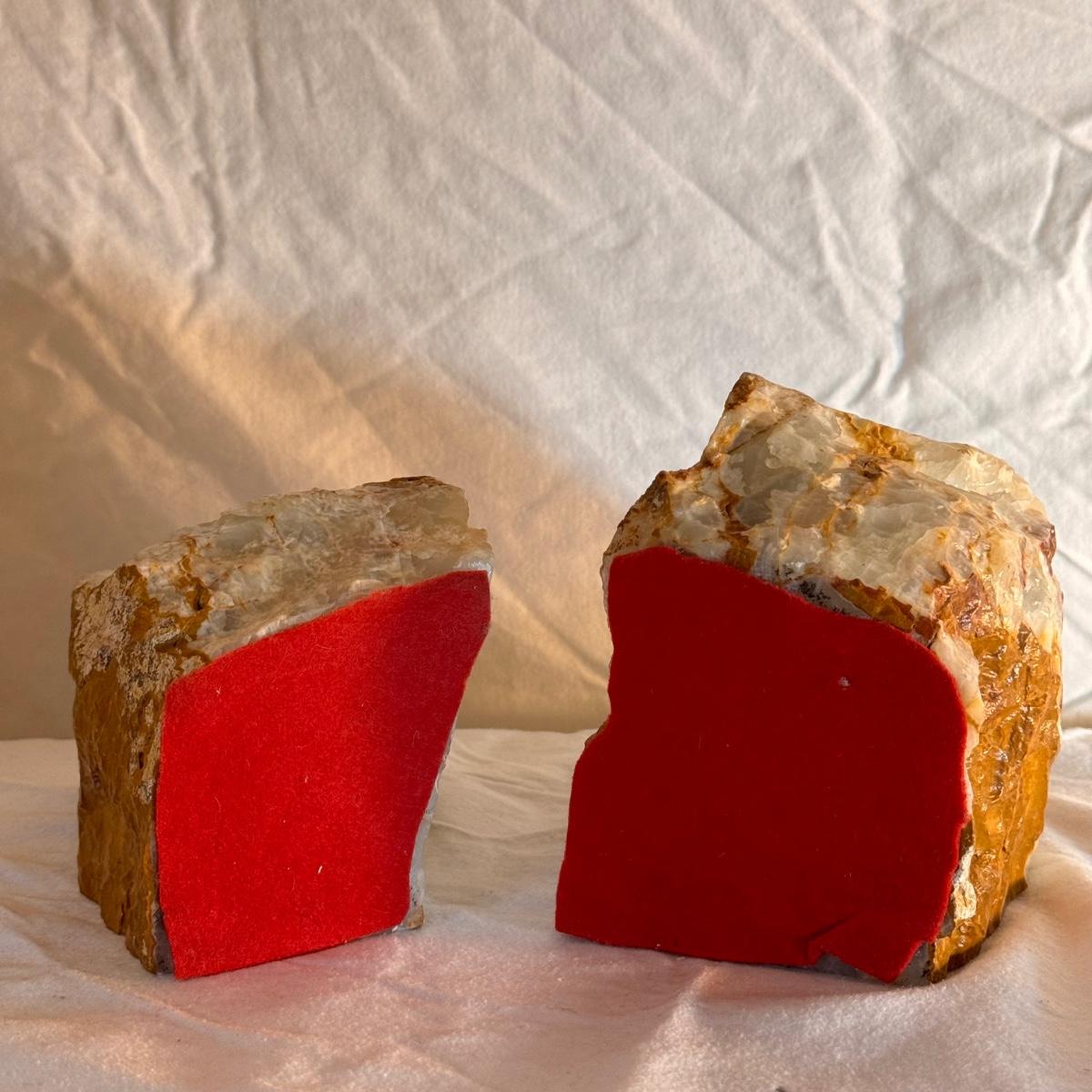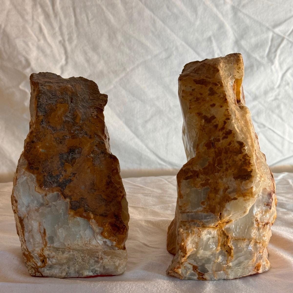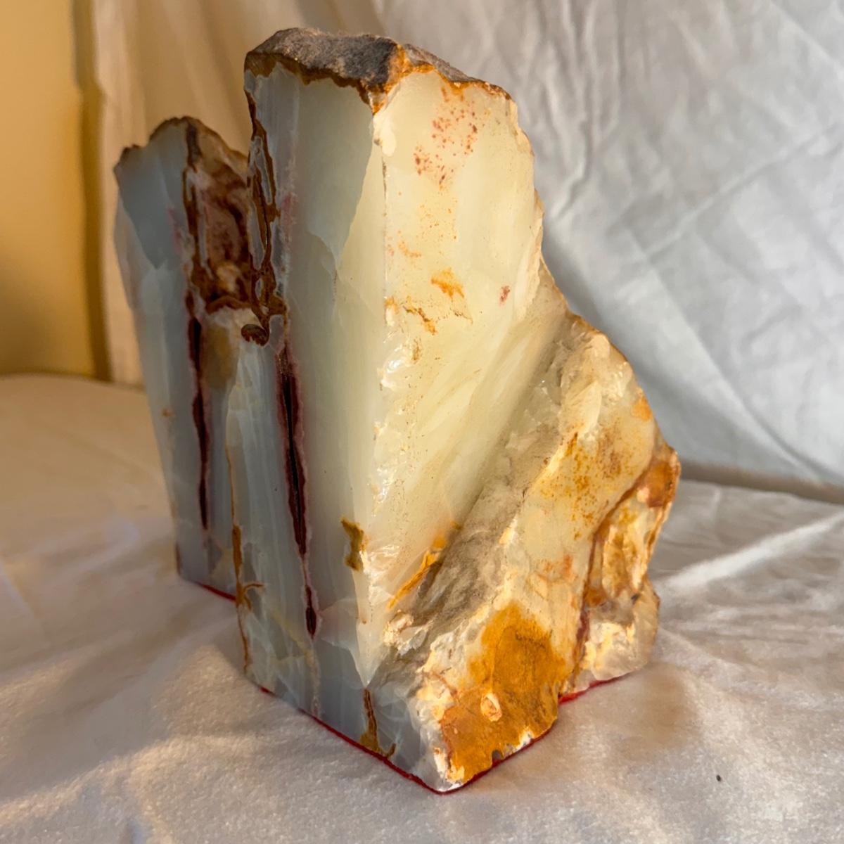 Lot includes two agate book ends that have a felted bottom for traction. The larger book end measures 4” x 4” x 8” and the smaller 3” x 4.5” x 7”H. Shipping available.