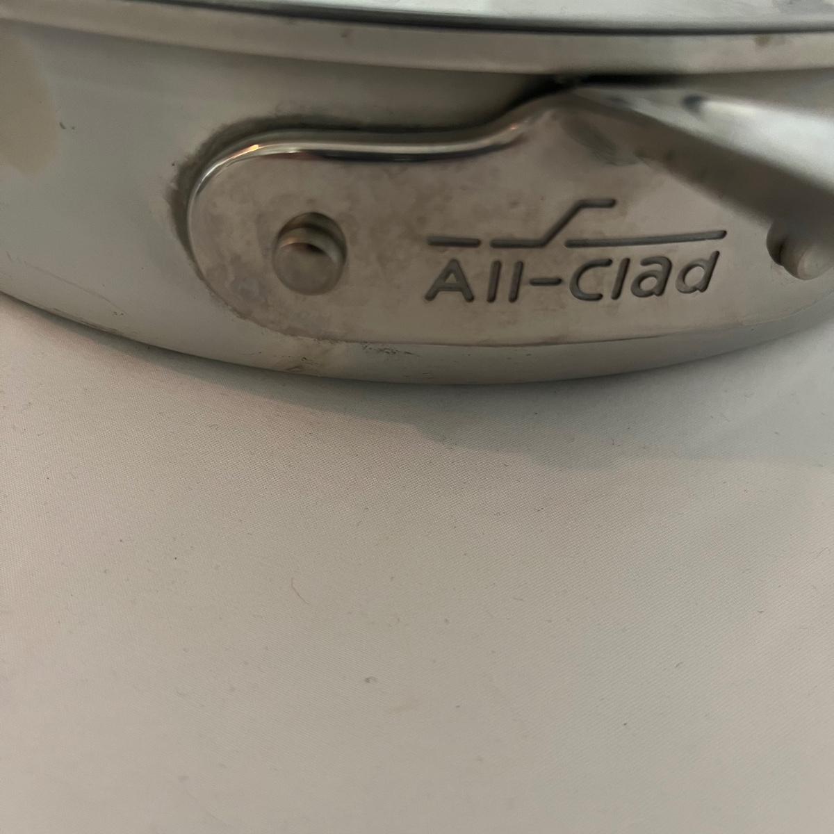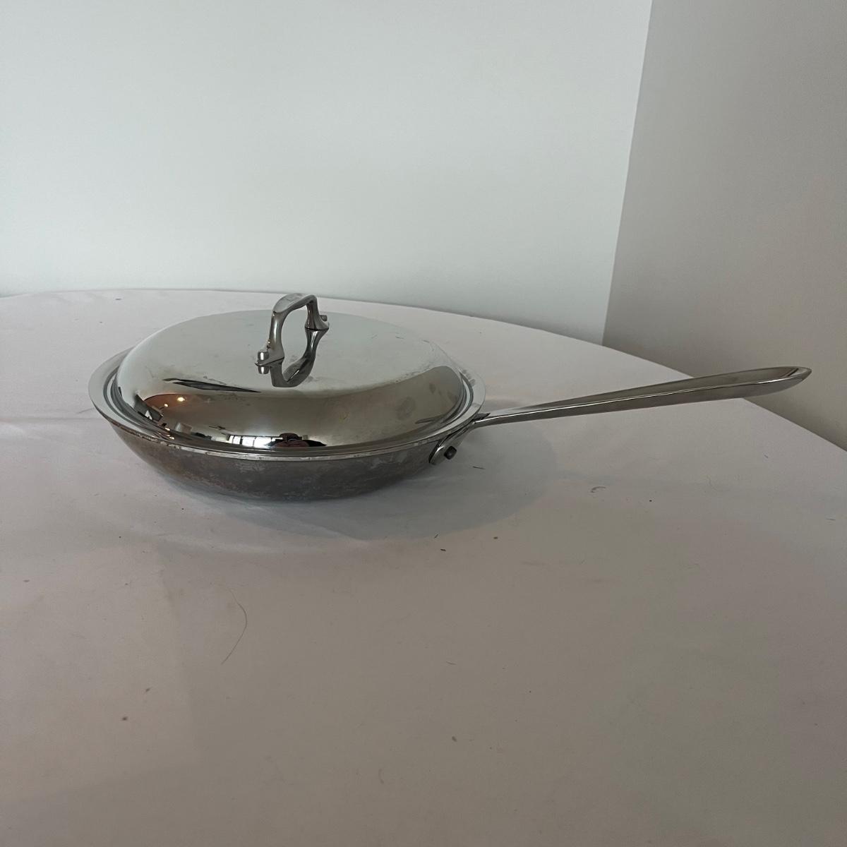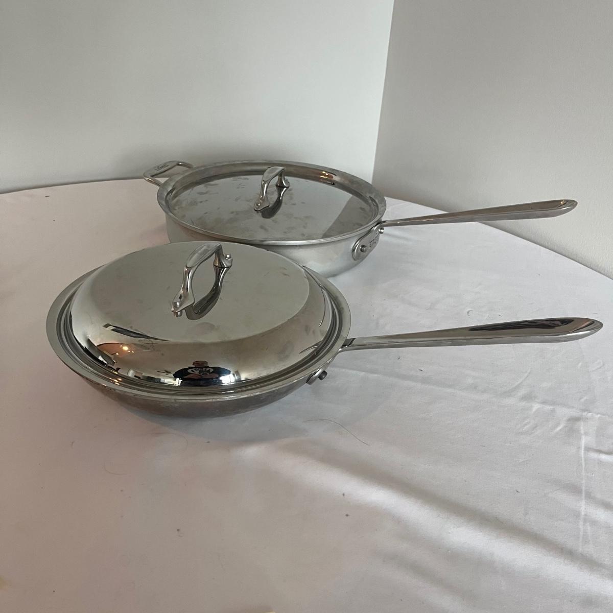 Lot includes one 10.5” All Clad frying pan with lid and an 11” All Clad frying pan with lid. Both pans show some wear, see pictures.