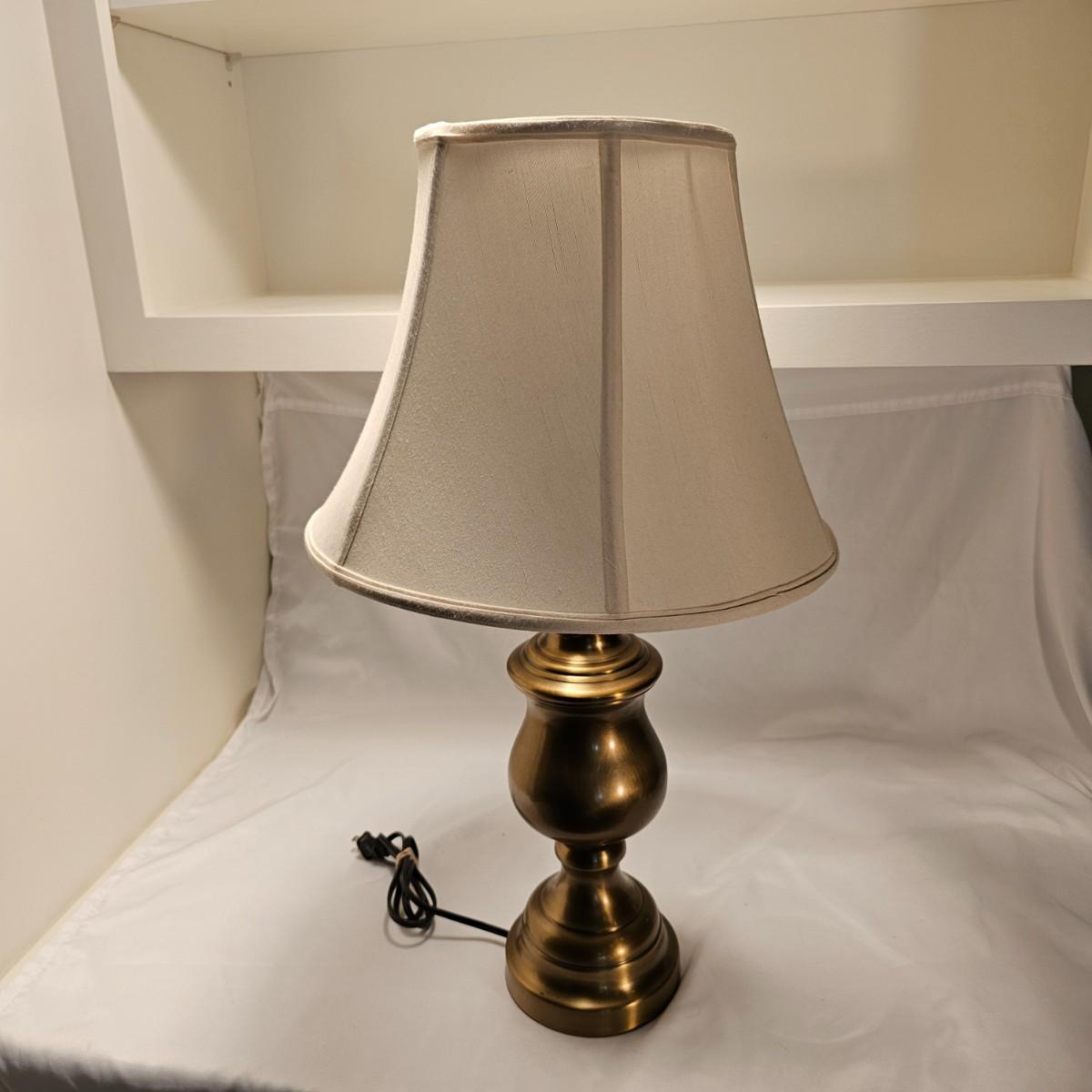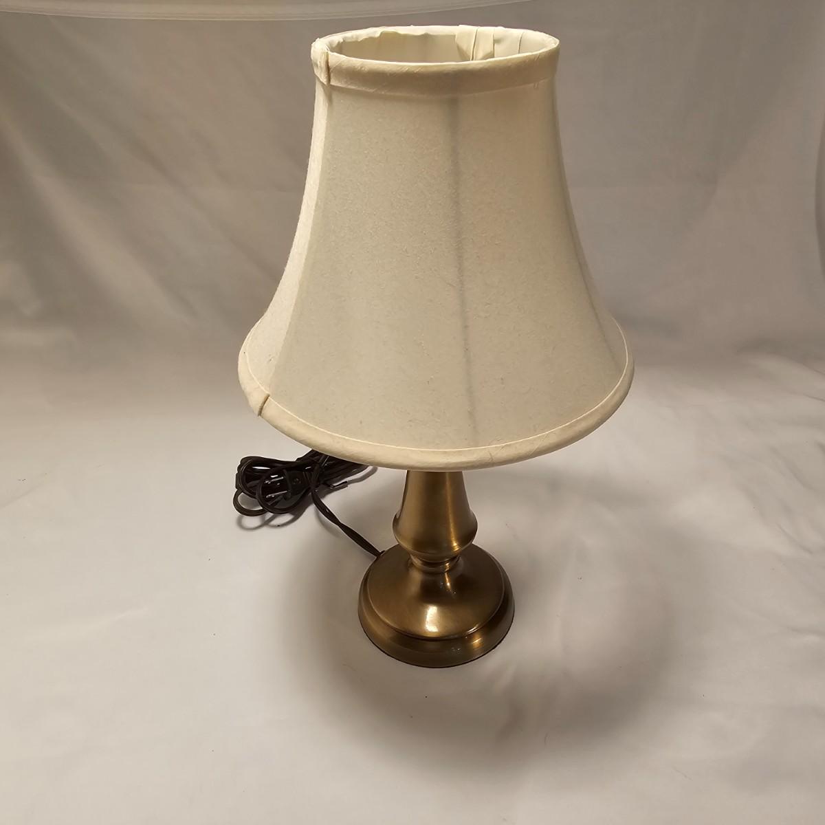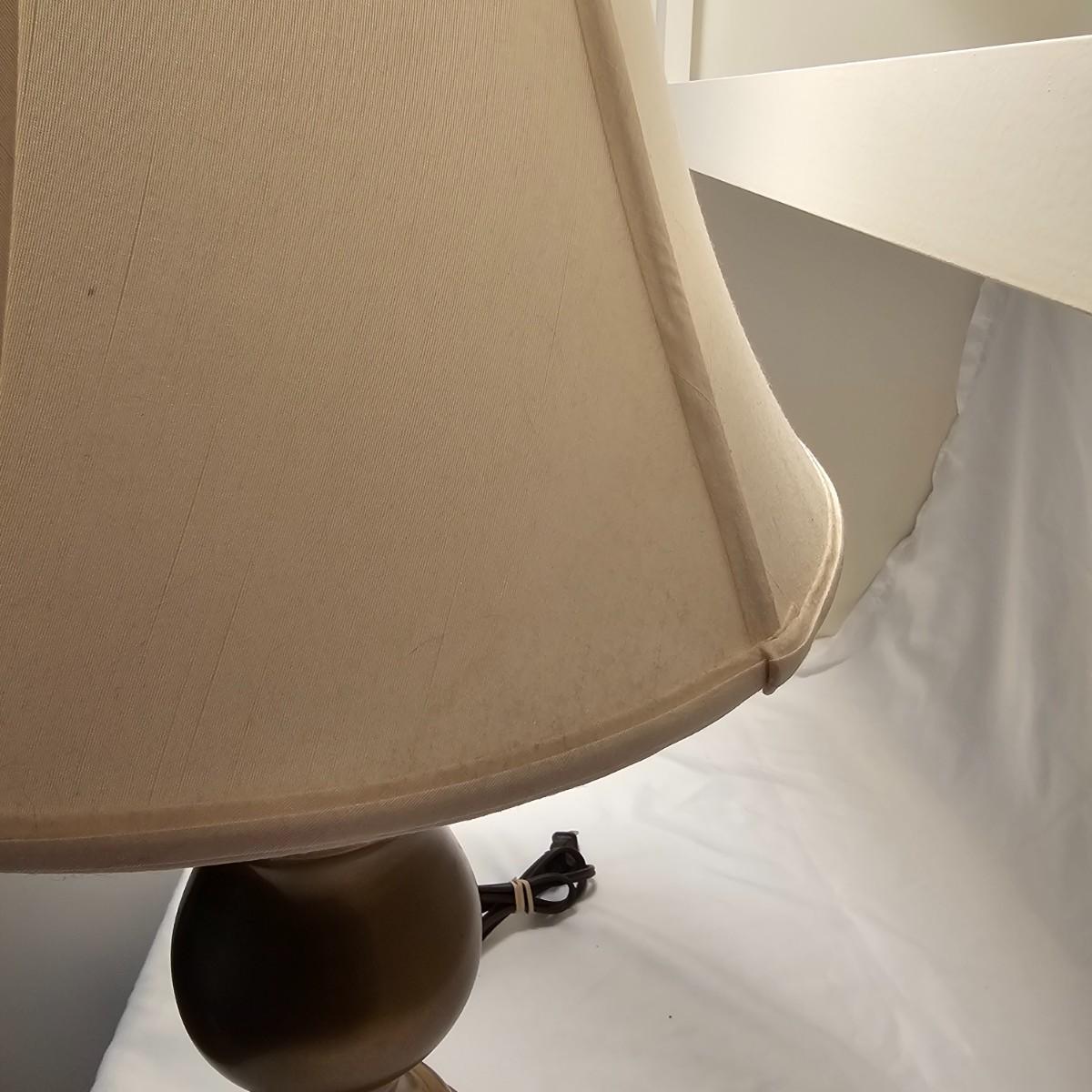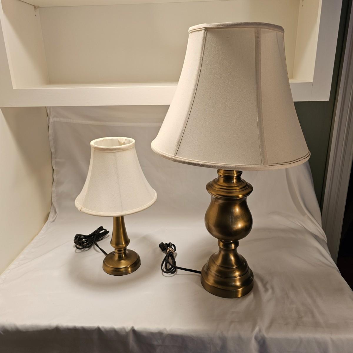 A pair of bronze colored lamps with ivory shades. Larger lamp is 14.5"D x 26"H, has touch on/off activation. Smaller lamp is 9"D x 15"H, has inline cord switch. Both lamps powered on when plugged in. Local pickup only.