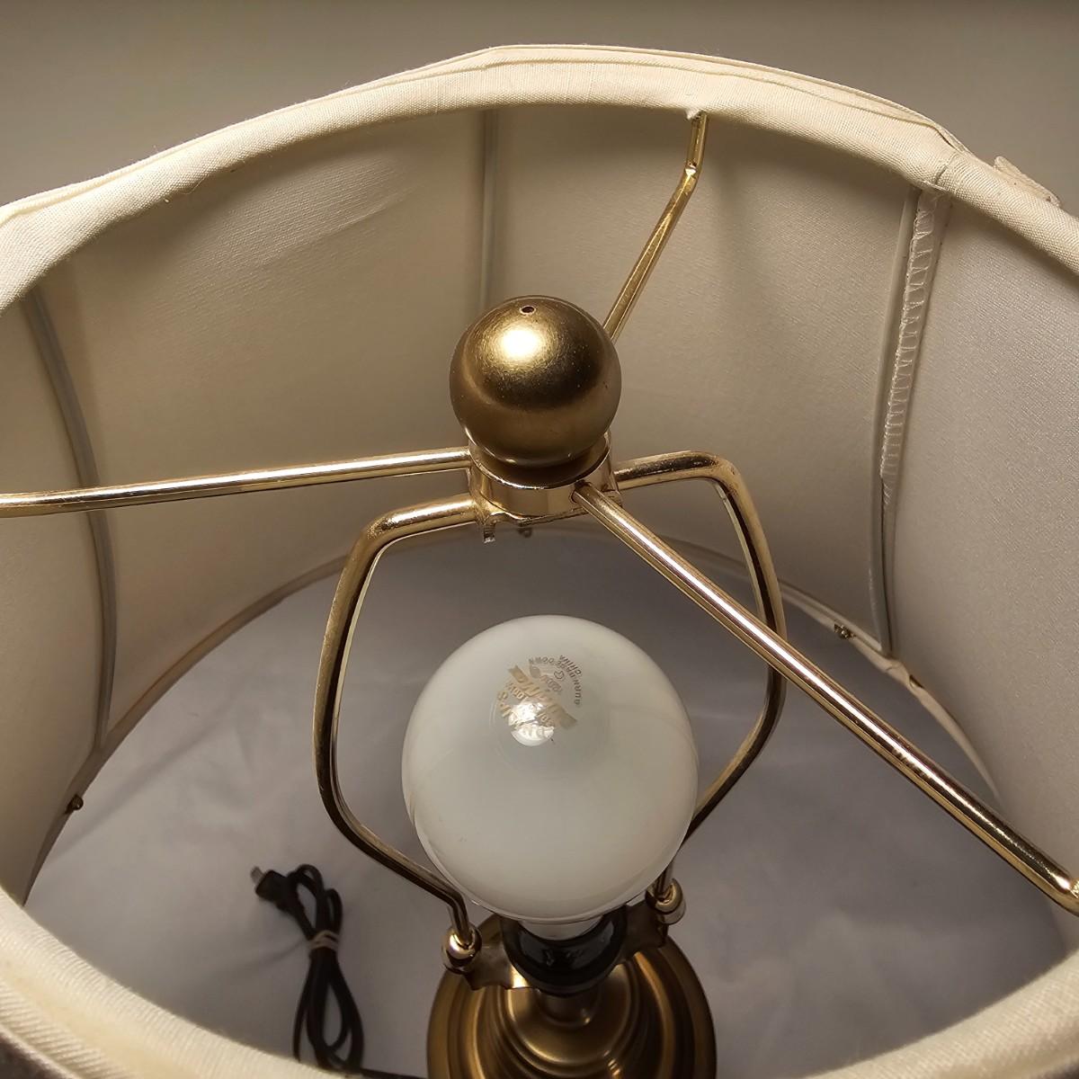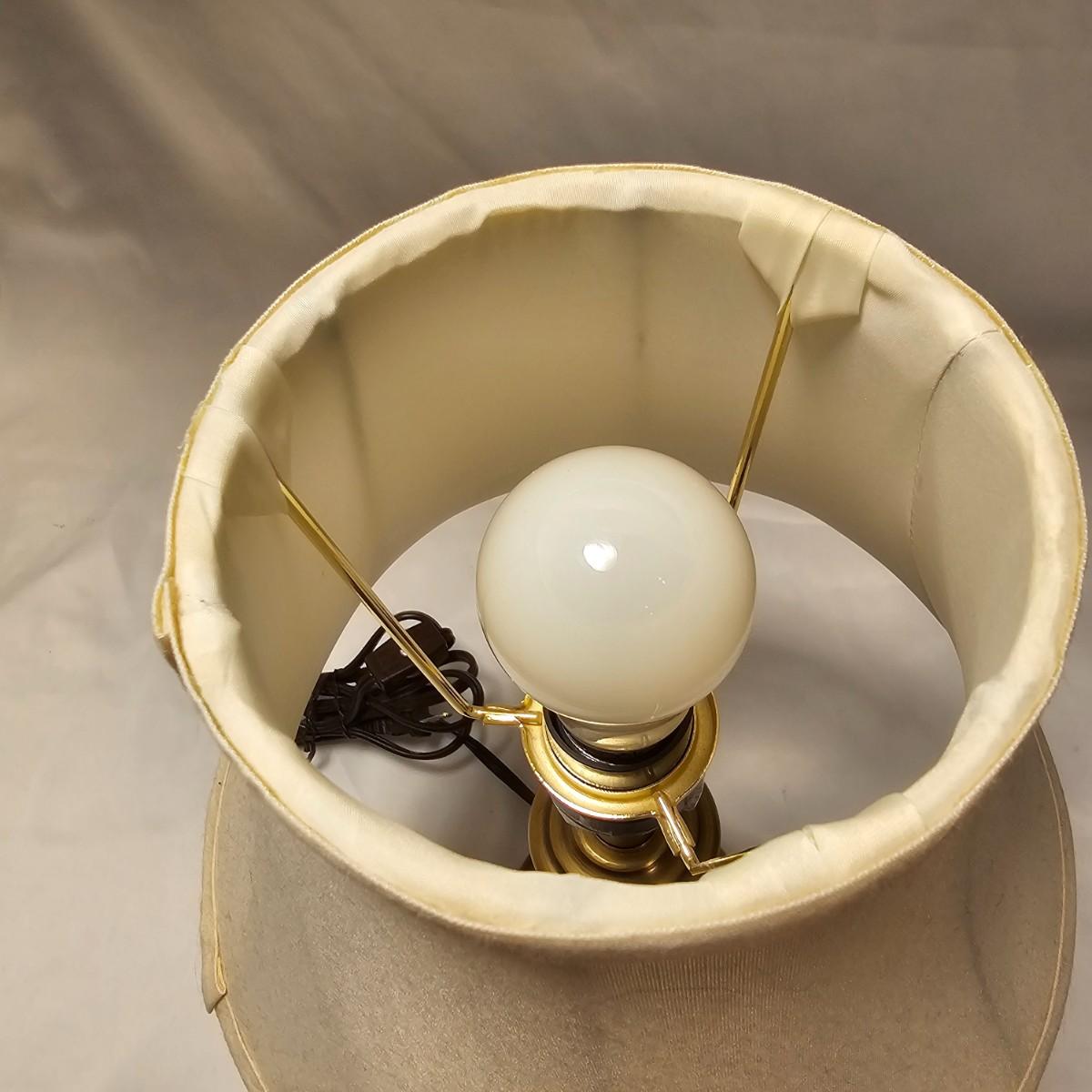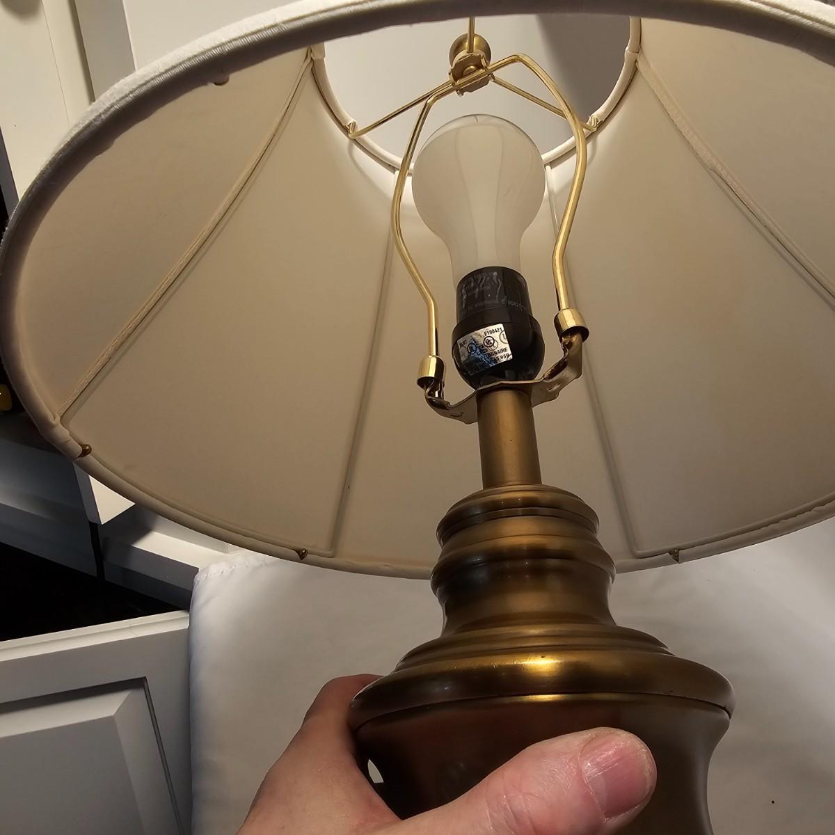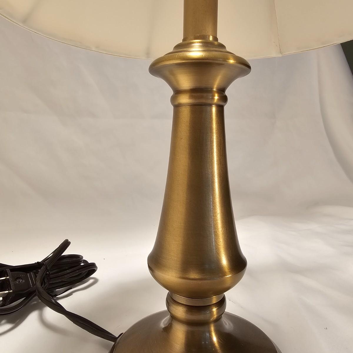 A pair of bronze colored lamps with ivory shades. Larger lamp is 14.5"D x 26"H, has touch on/off activation. Smaller lamp is 9"D x 15"H, has inline cord switch. Both lamps powered on when plugged in. Local pickup only.