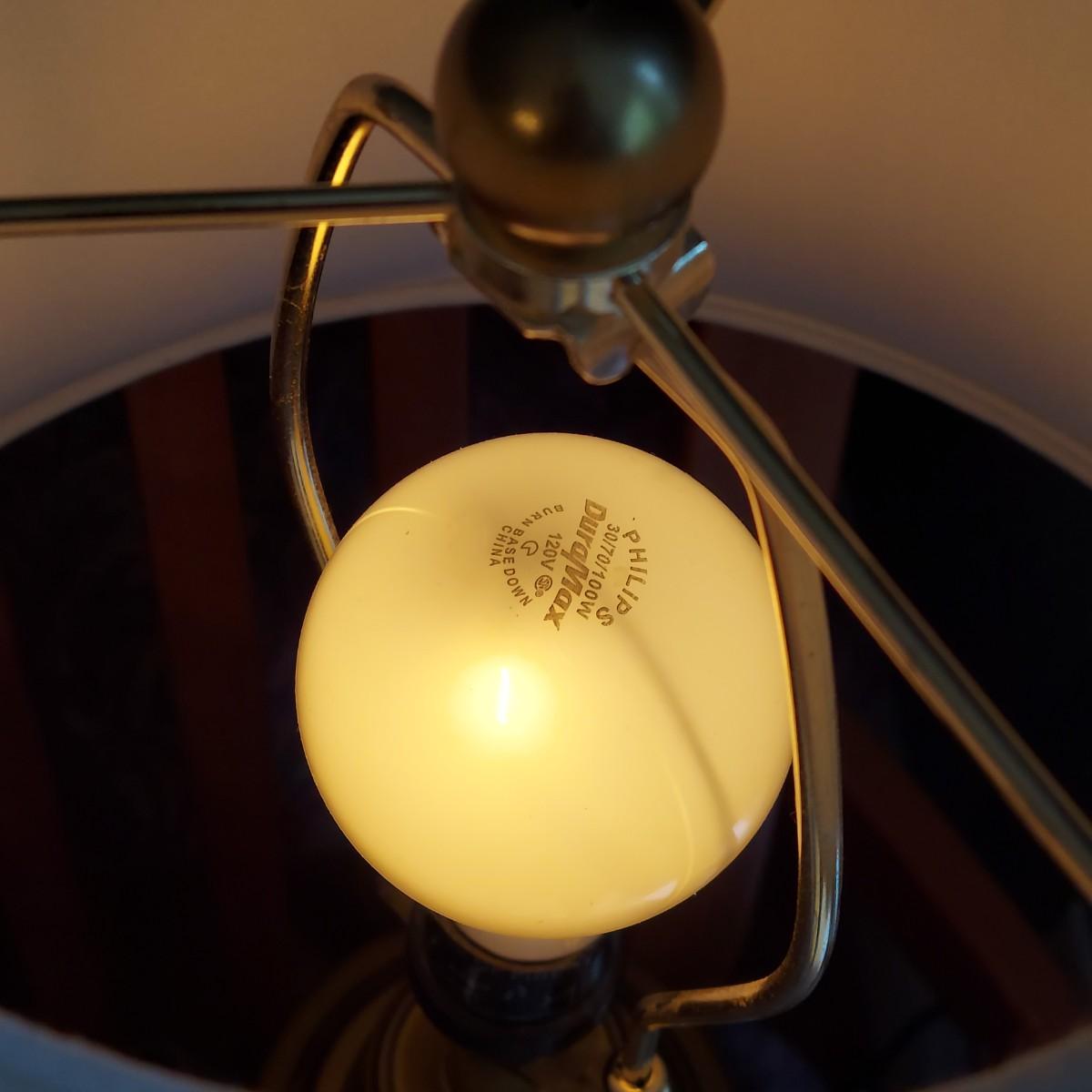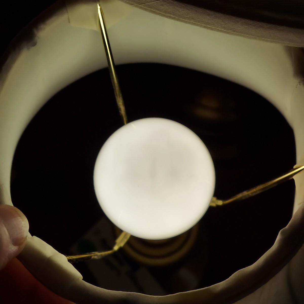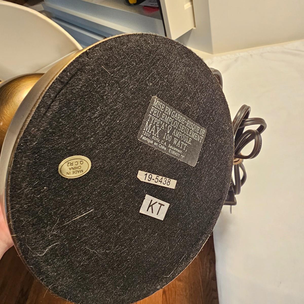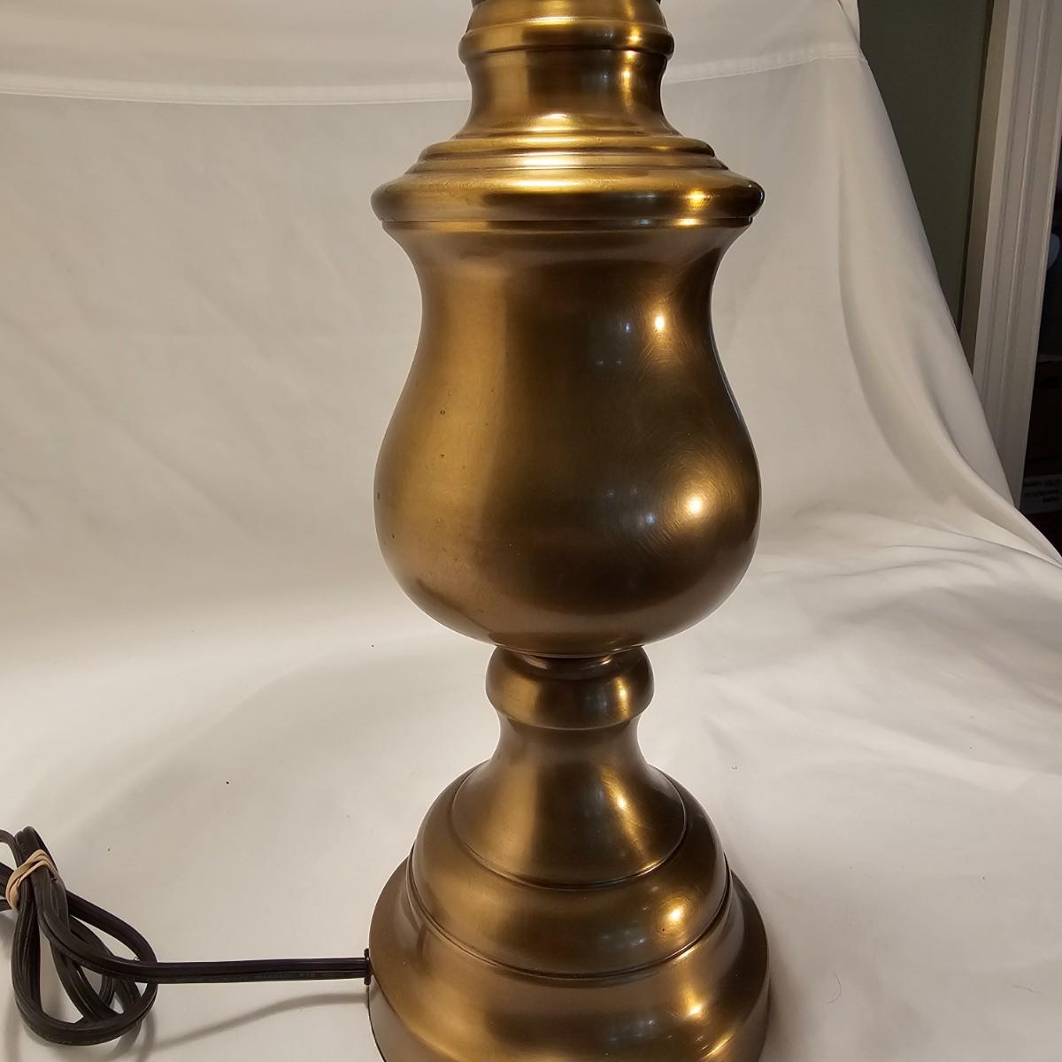 A pair of bronze colored lamps with ivory shades. Larger lamp is 14.5"D x 26"H, has touch on/off activation. Smaller lamp is 9"D x 15"H, has inline cord switch. Both lamps powered on when plugged in. Local pickup only.