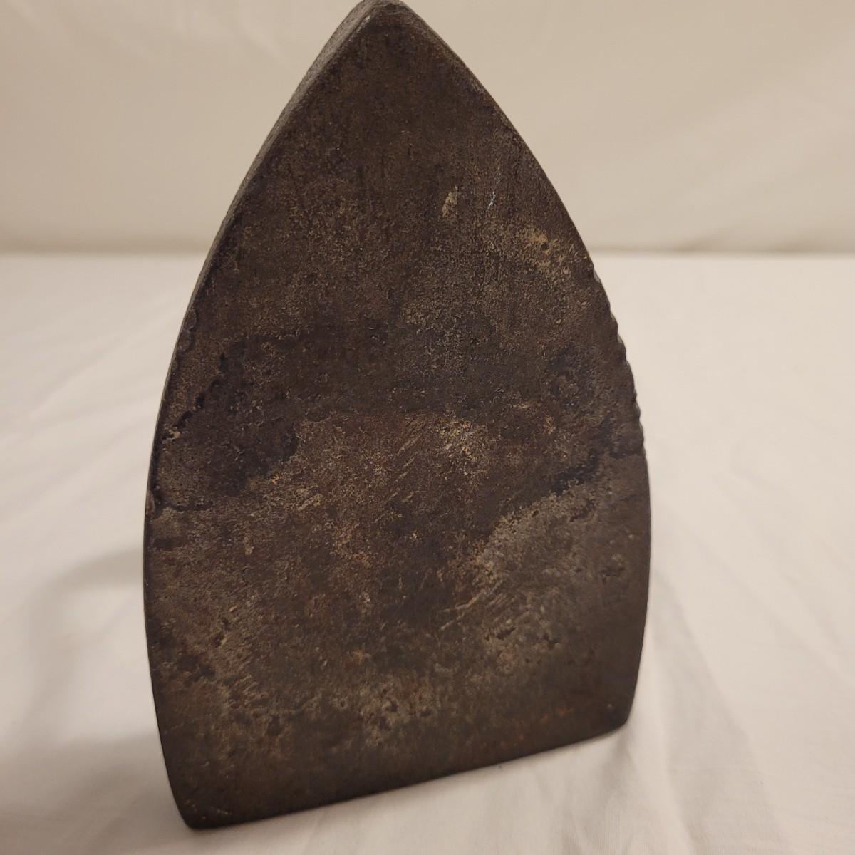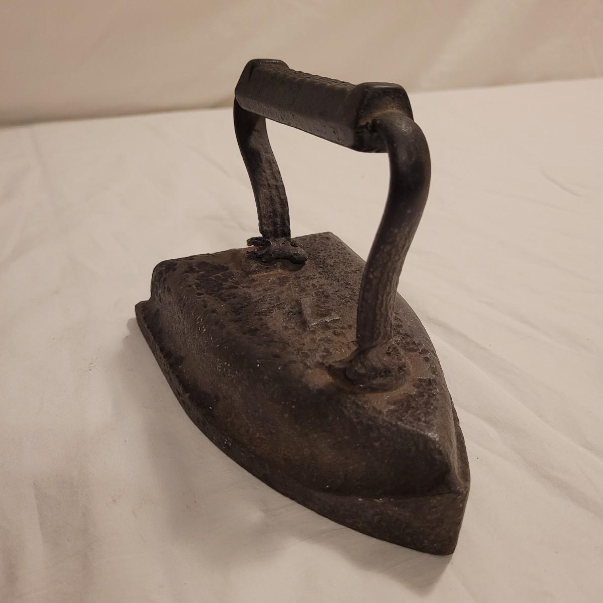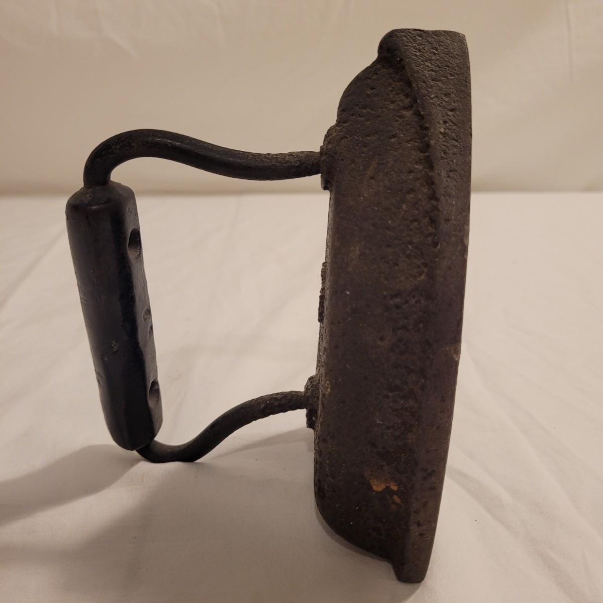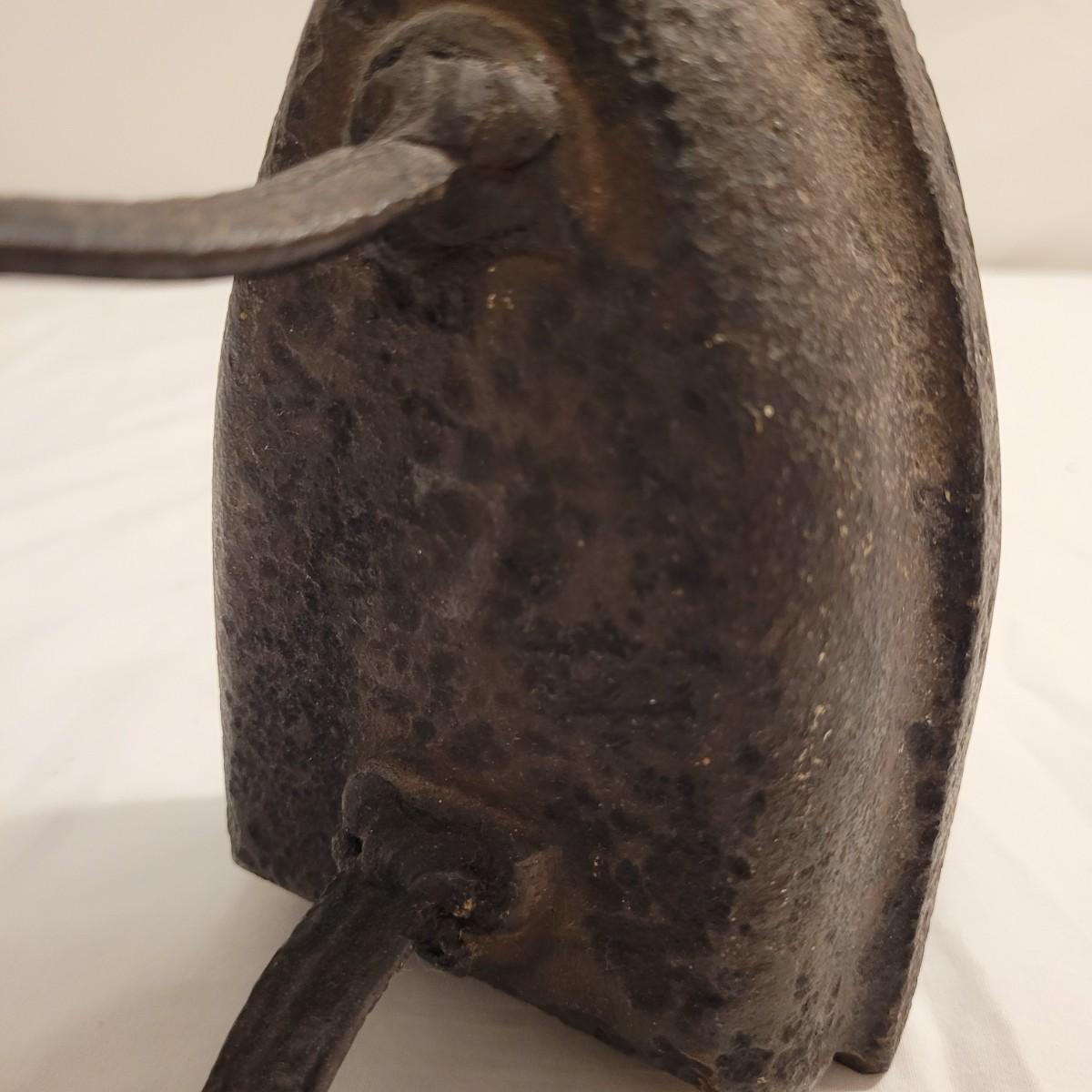 This lot includes two cast iron antique irons. They are similar, but not identical. The first iron is a slightly larger seven pound model with metal handle. It measures approximately 4" x 5" x 7"H. The second, smaller iron is six pounds and also features a metal handle. Both irons are old and seemingly antique. They have minor condition issues due to age.