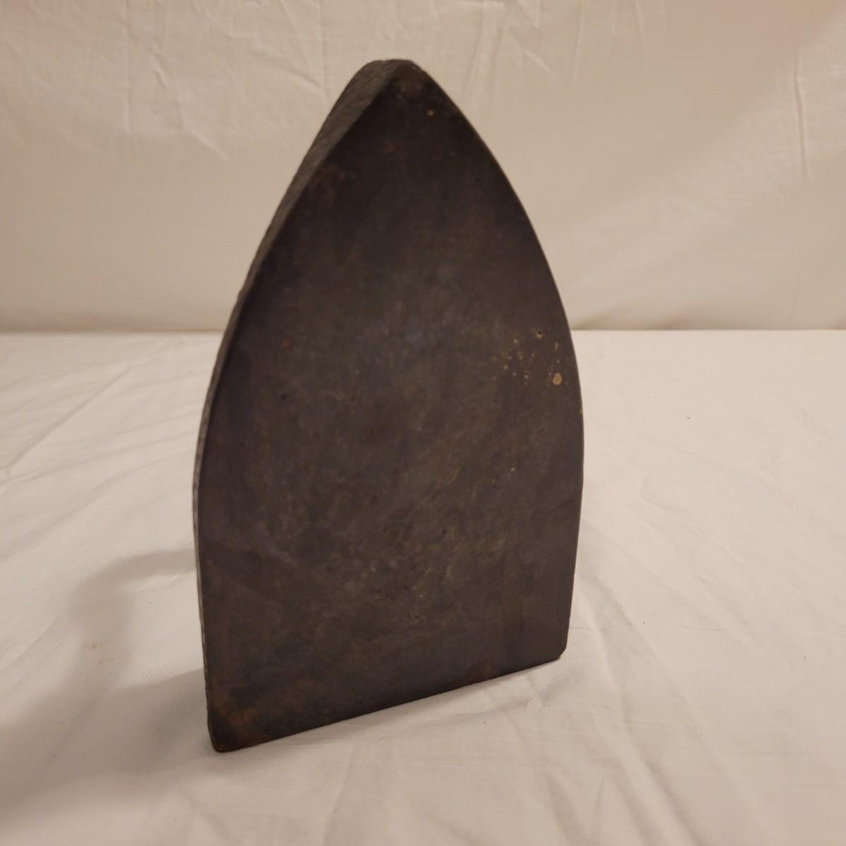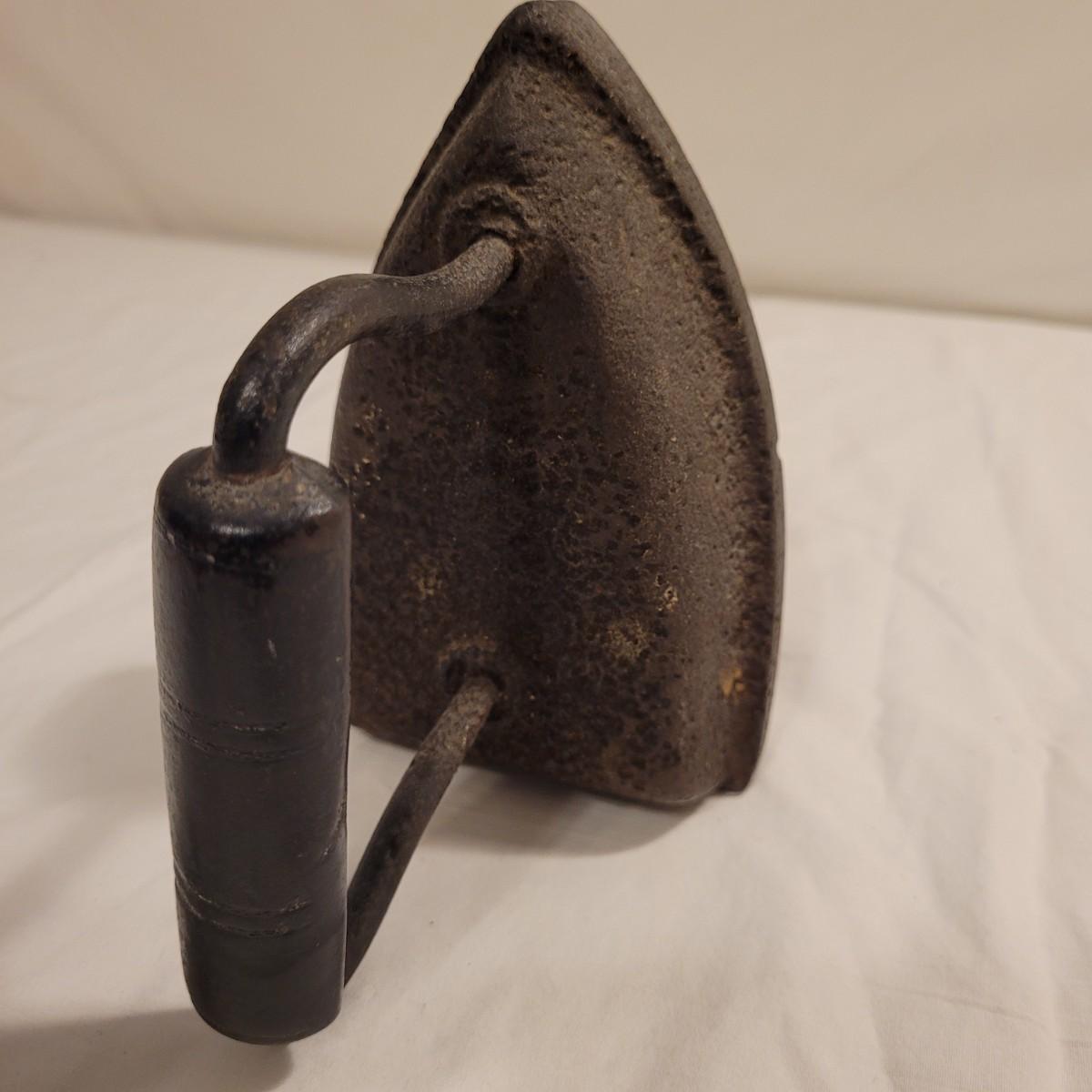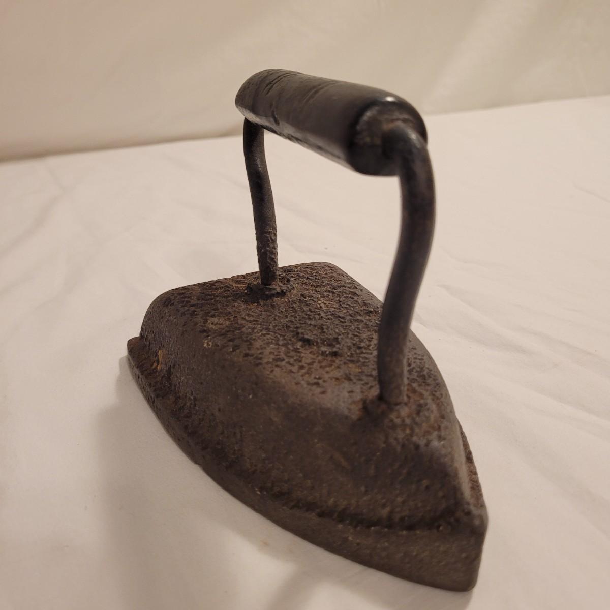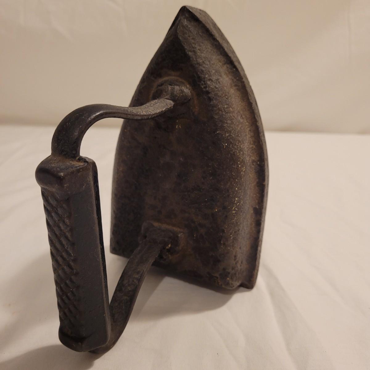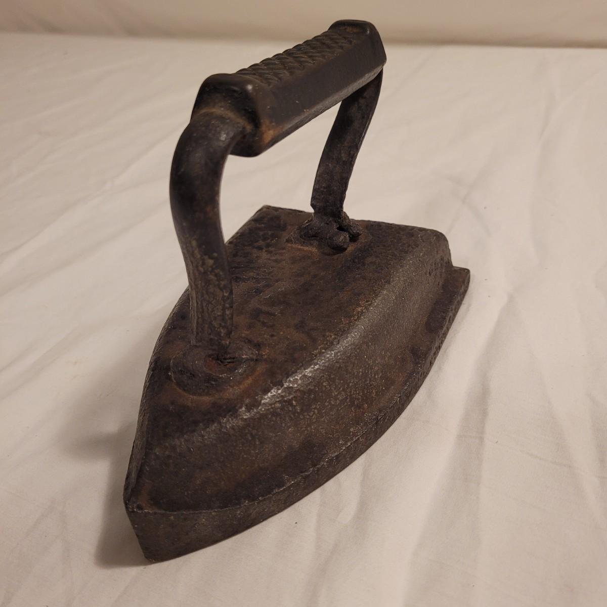This lot includes two cast iron antique irons. They are similar, but not identical. The first iron is a slightly larger seven pound model with metal handle. It measures approximately 4" x 5" x 7"H. The second, smaller iron is six pounds and also features a metal handle. Both irons are old and seemingly antique. They have minor condition issues due to age.