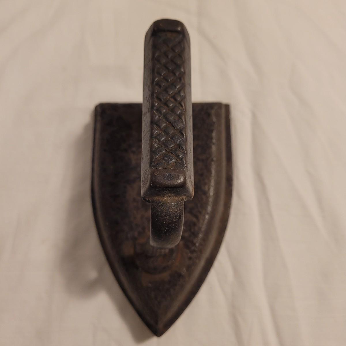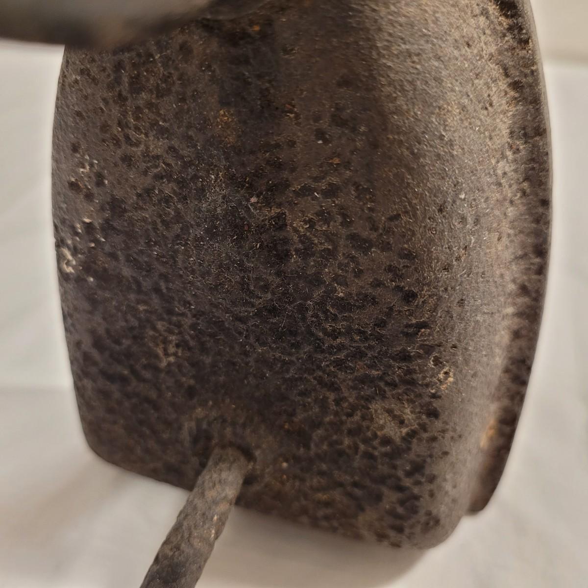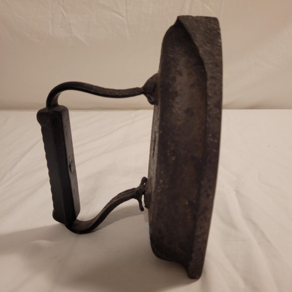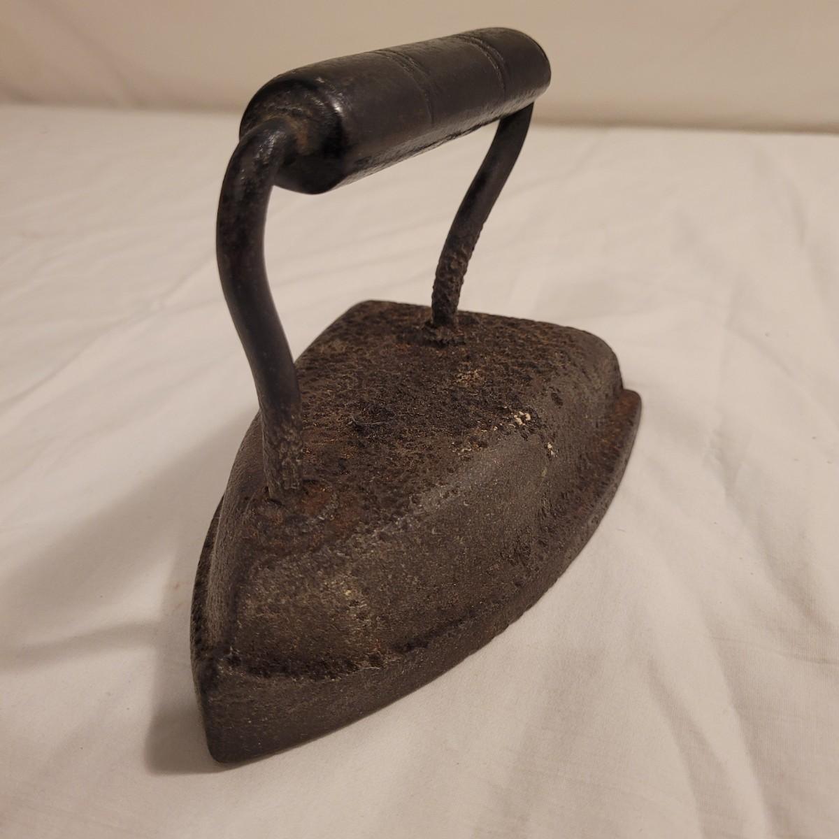 This lot includes two cast iron antique irons. They are similar, but not identical. The first iron is a slightly larger seven pound model with metal handle. It measures approximately 4" x 5" x 7"H. The second, smaller iron is six pounds and also features a metal handle. Both irons are old and seemingly antique. They have minor condition issues due to age.