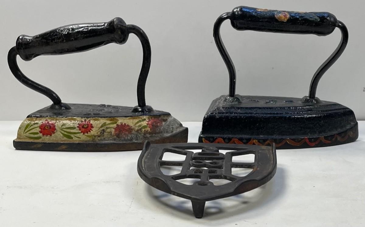Two Antique Cast Iron Sad Flat Iron w/ B and D Footed Trivet