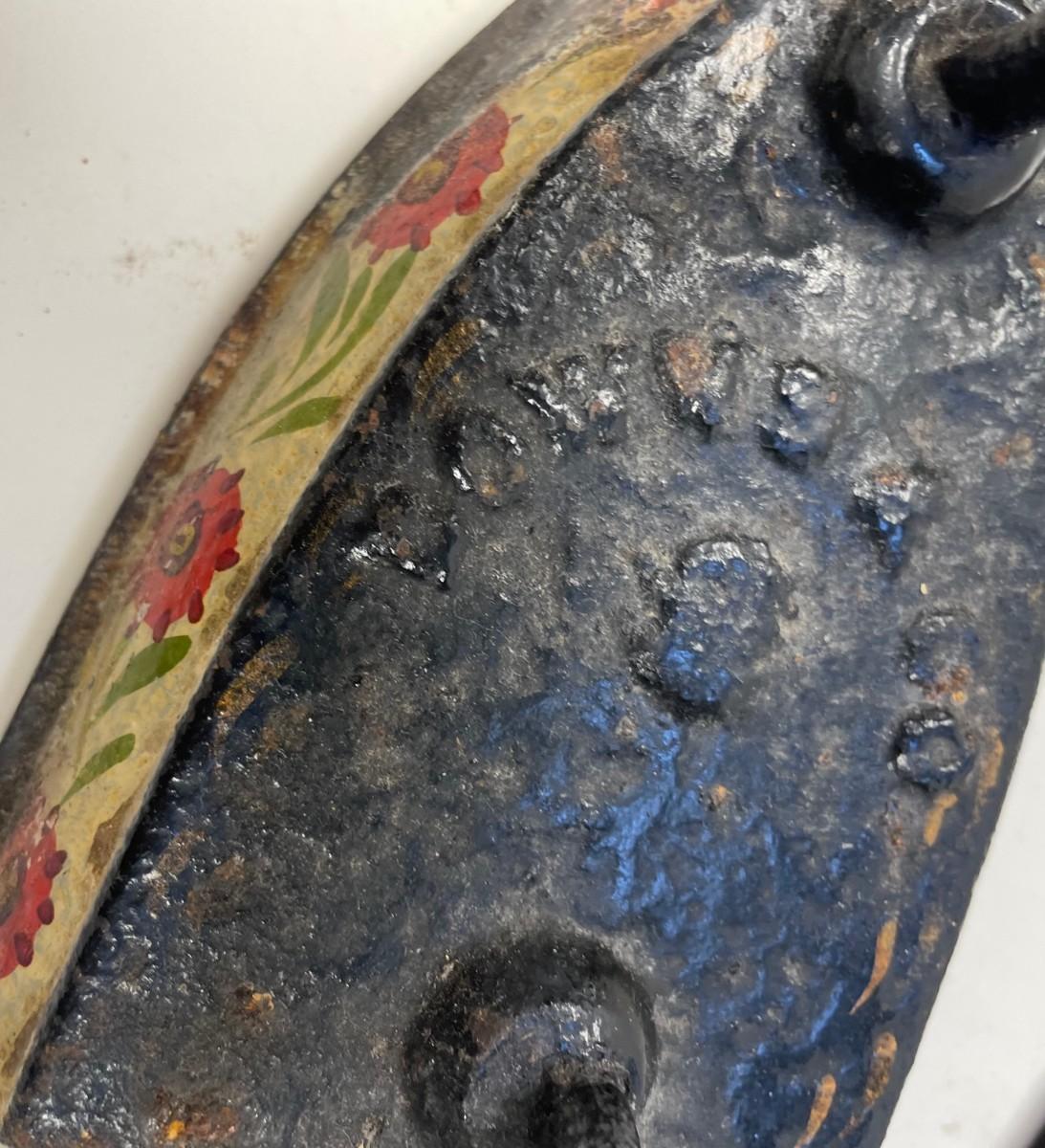 Description: Two antique cast iron Sad Flat iron with / B and D footed trivet; Both Sad irons are marked / See images; Material: Iron; Measurement approximate: 6.5 x 5 (Inches).