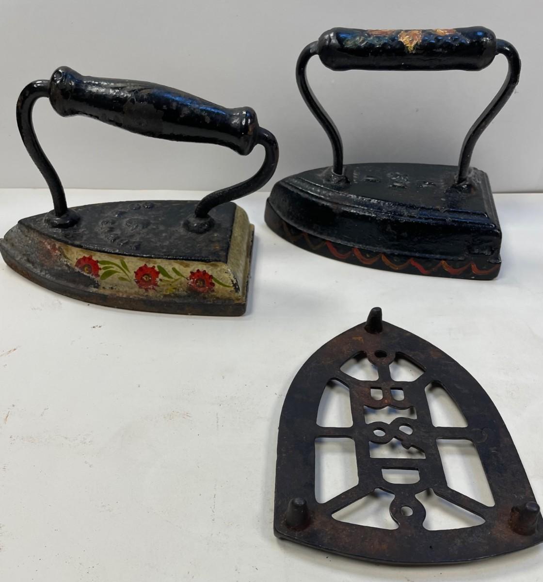 Two Antique Cast Iron Sad Flat Iron w/ B and D Footed Trivet