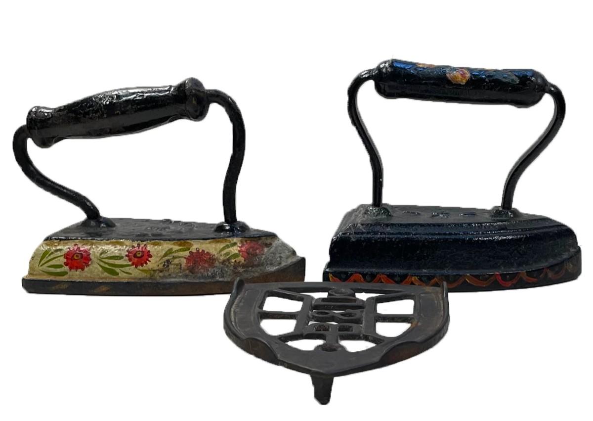 Two Antique Cast Iron Sad Flat Iron w/ B and D Footed Trivet
