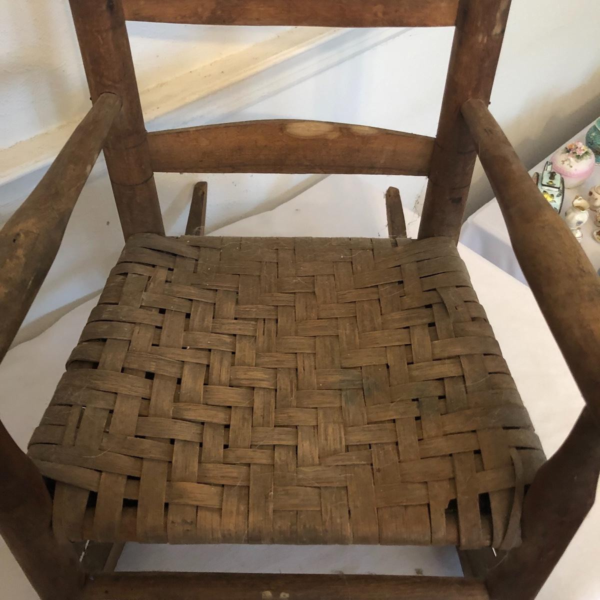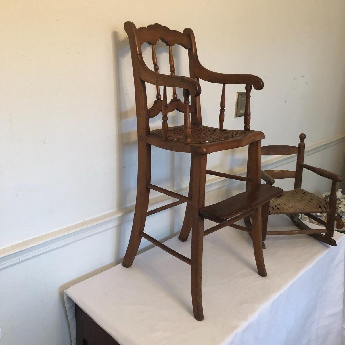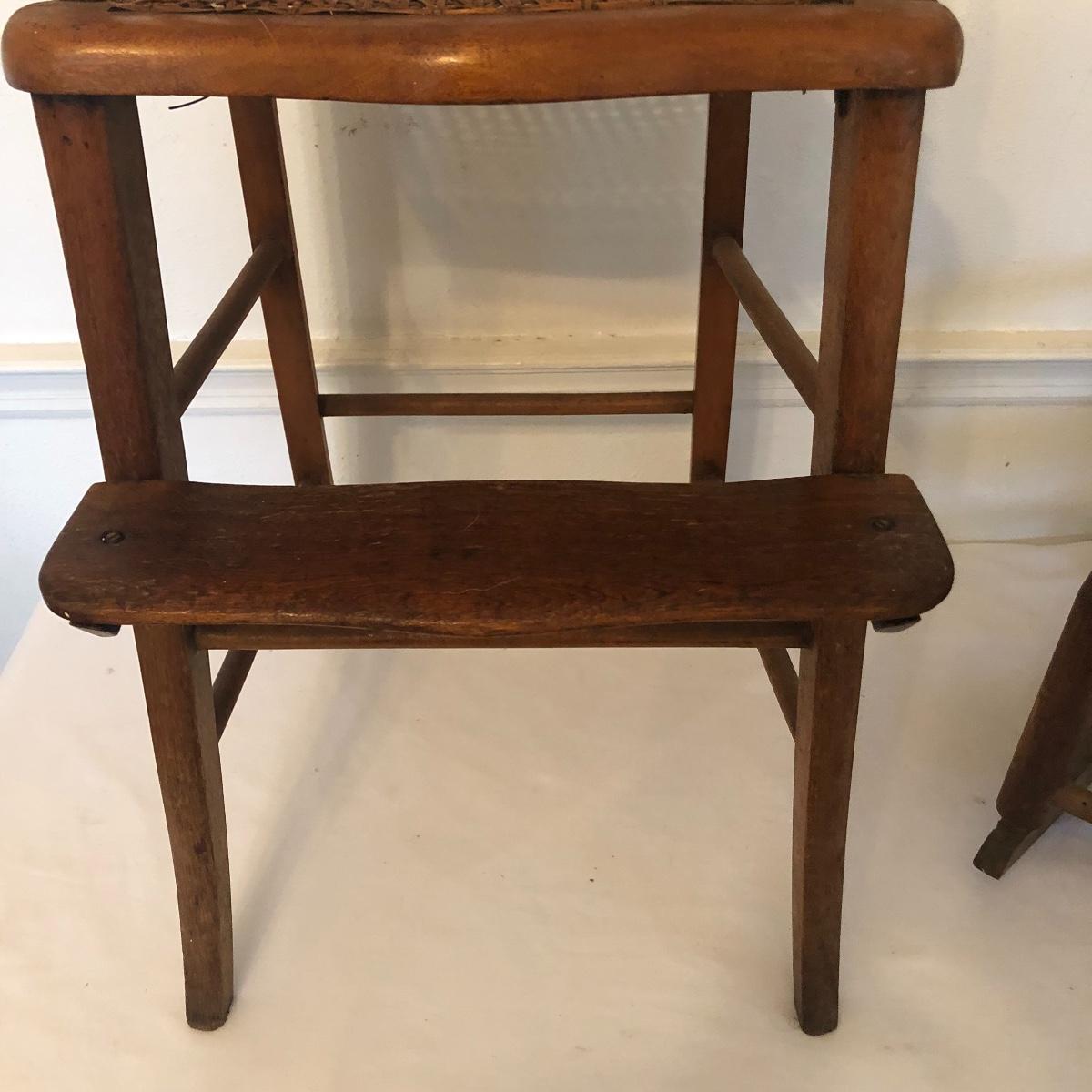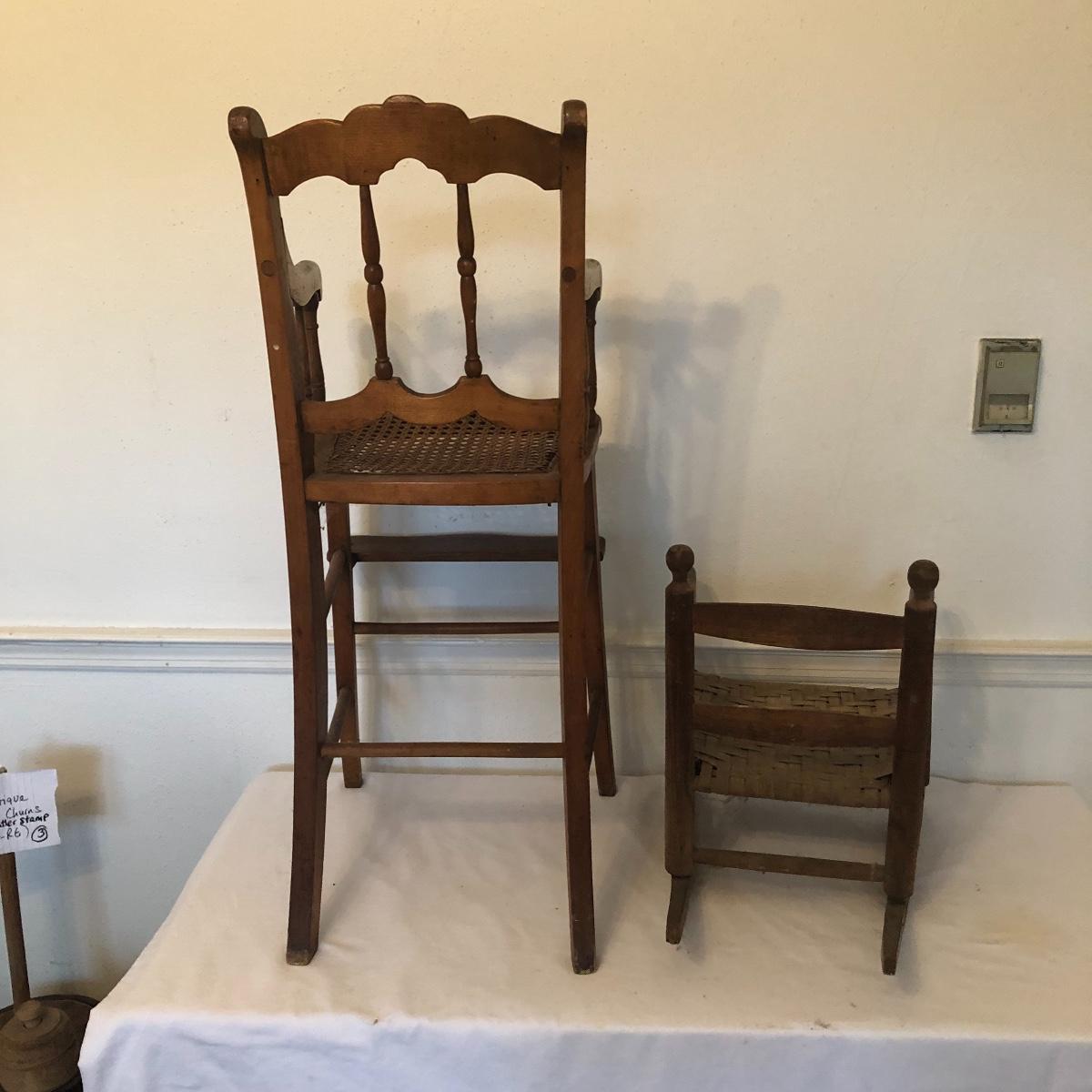 Both of these antique children’s seats are solid wood; the tall chair has a ratan seat and the rocking chair a woven seat. Also included is a small stool (added later) that has a woven seat, it measures 12” square x 11.5”. All are in good condition although the ratan is wearing a little, see images.