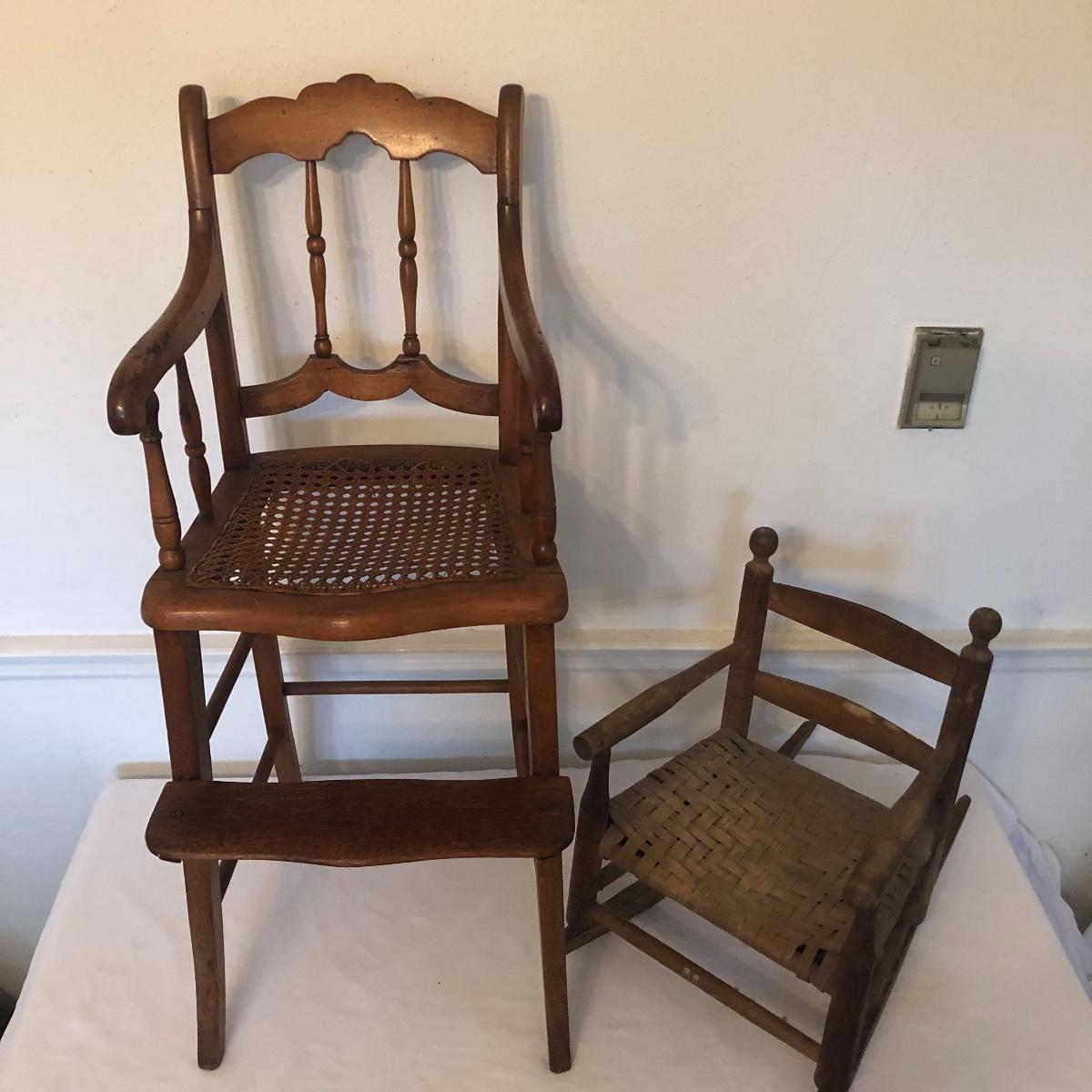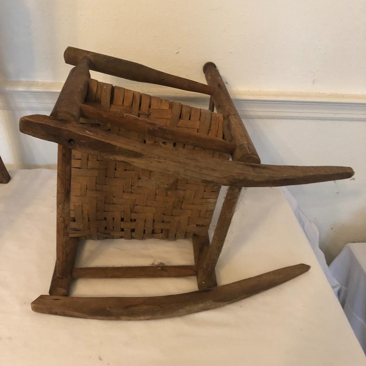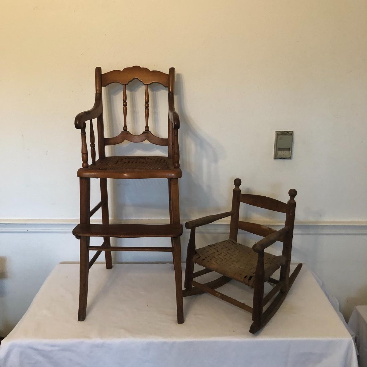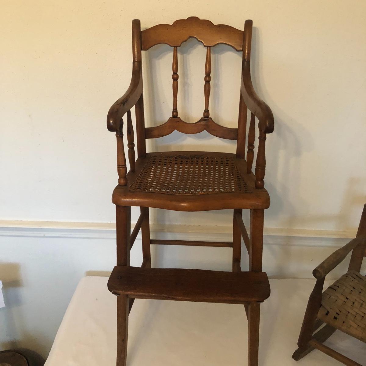 Both of these antique children’s seats are solid wood; the tall chair has a ratan seat and the rocking chair a woven seat. Also included is a small stool (added later) that has a woven seat, it measures 12” square x 11.5”. All are in good condition although the ratan is wearing a little, see images.