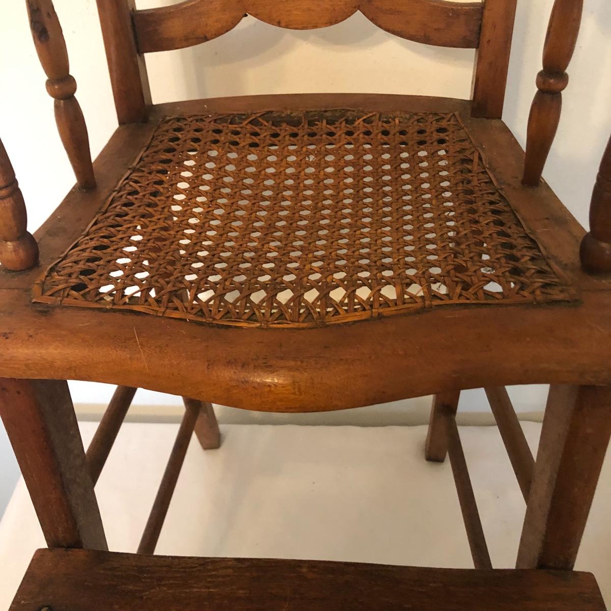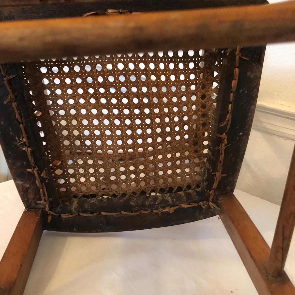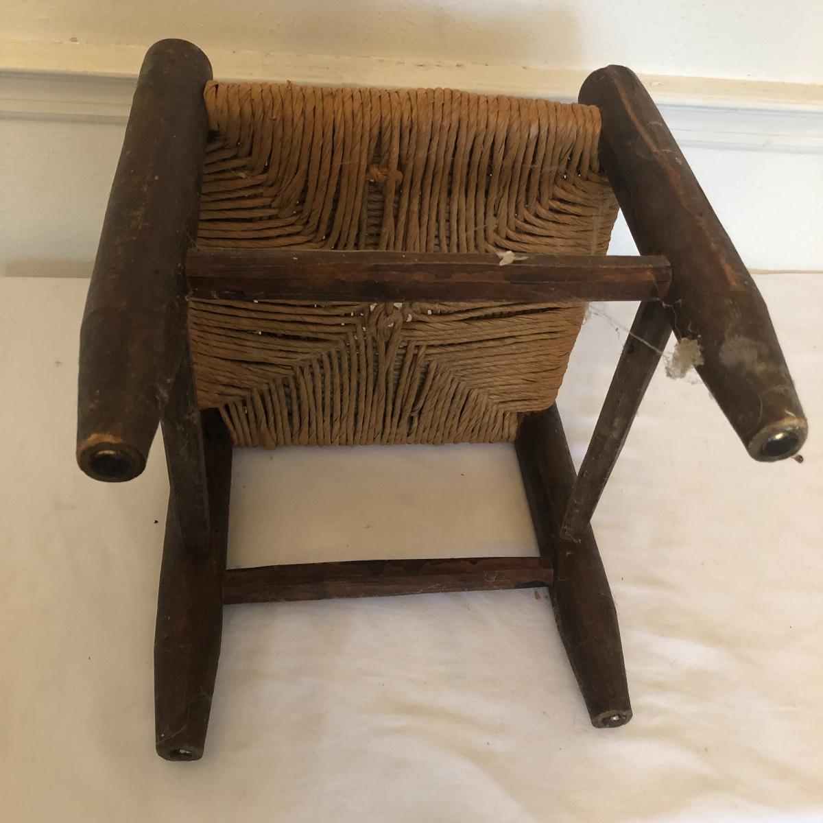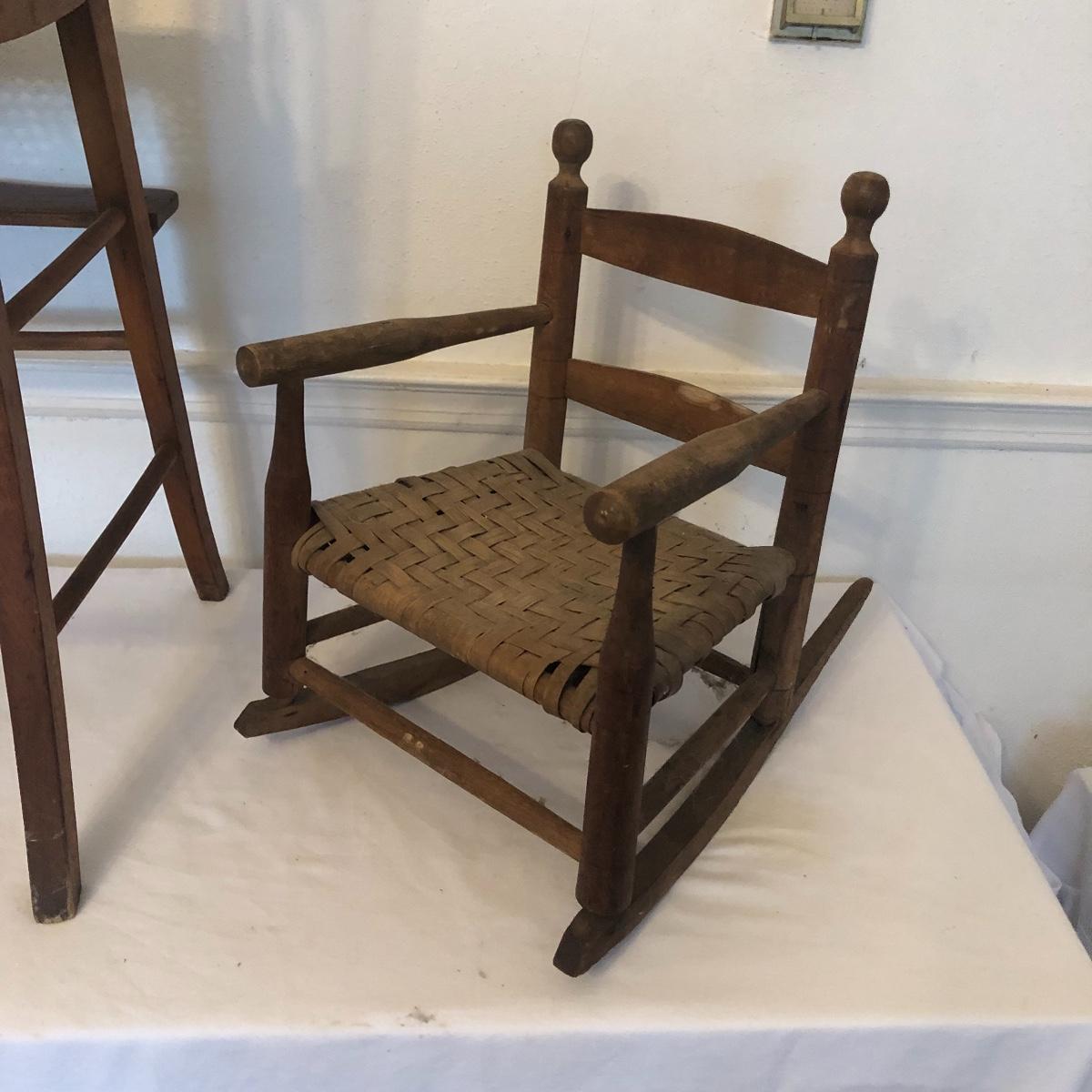 Both of these antique children’s seats are solid wood; the tall chair has a ratan seat and the rocking chair a woven seat. Also included is a small stool (added later) that has a woven seat, it measures 12” square x 11.5”. All are in good condition although the ratan is wearing a little, see images.