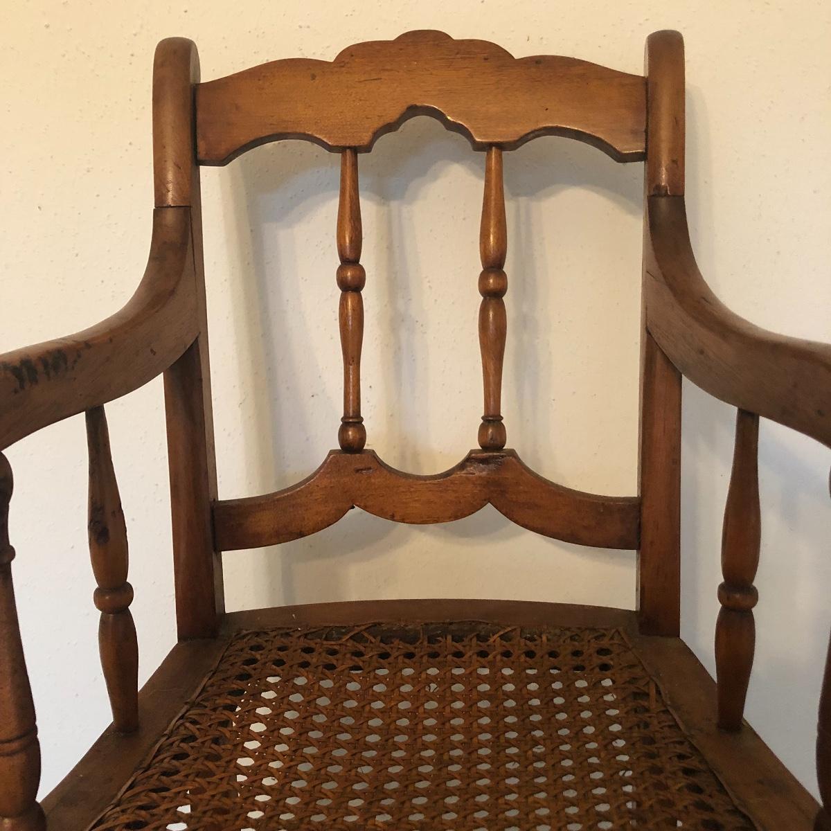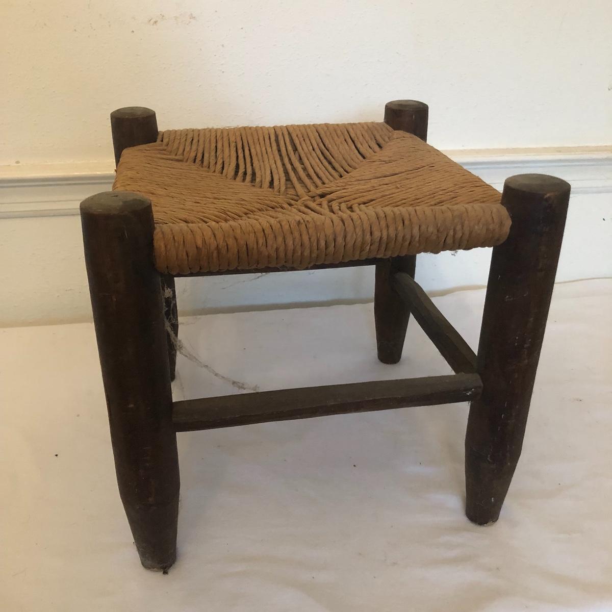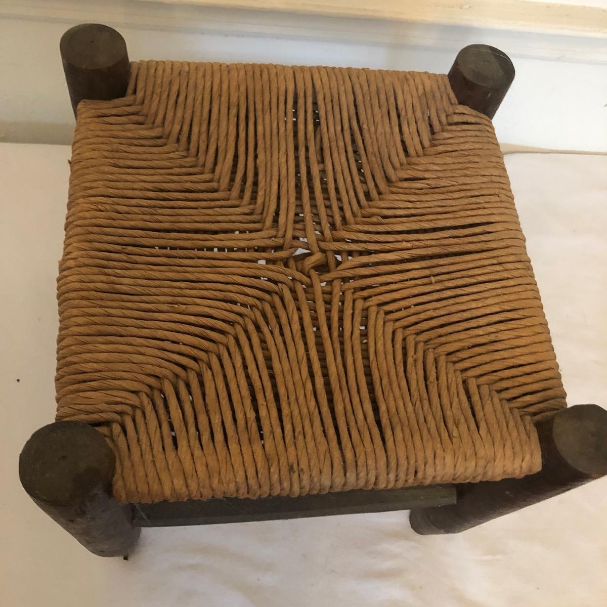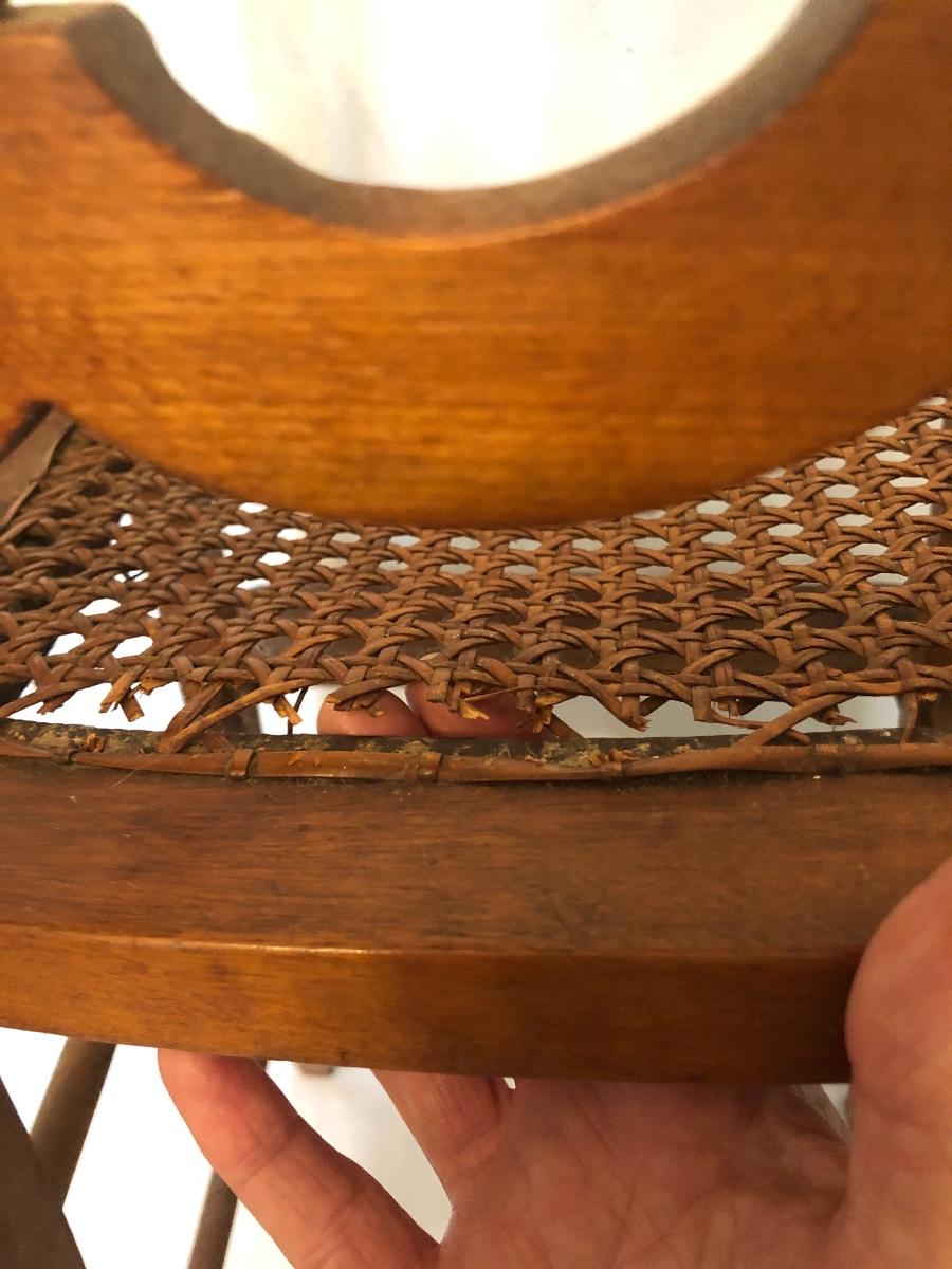 Both of these antique children’s seats are solid wood; the tall chair has a ratan seat and the rocking chair a woven seat. Also included is a small stool (added later) that has a woven seat, it measures 12” square x 11.5”. All are in good condition although the ratan is wearing a little, see images.