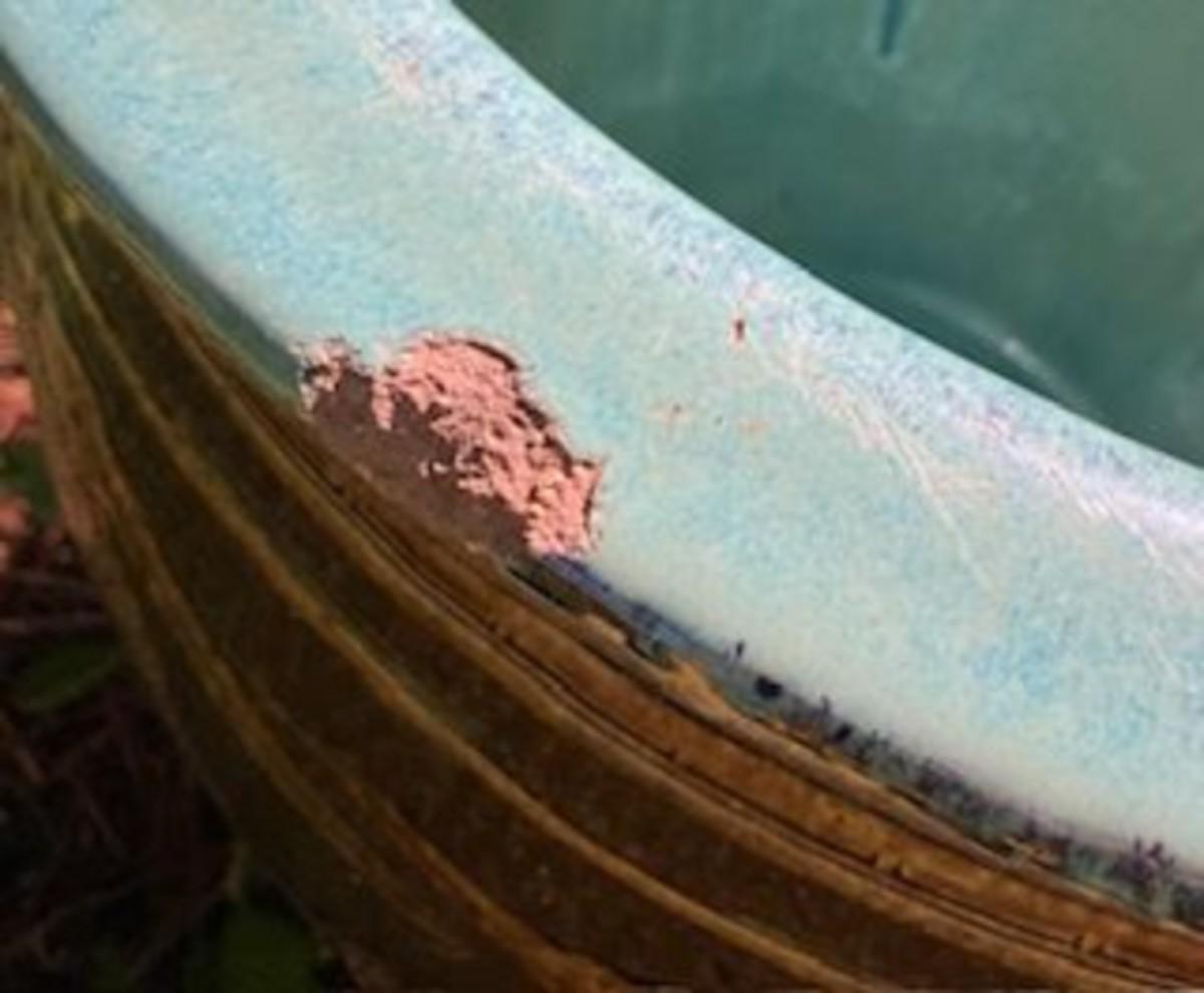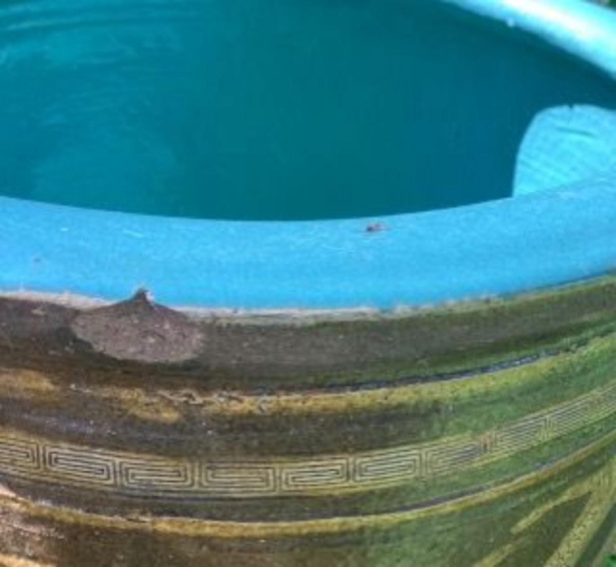 One chip at the top of each pot, some small cracks and scuffs throughout.