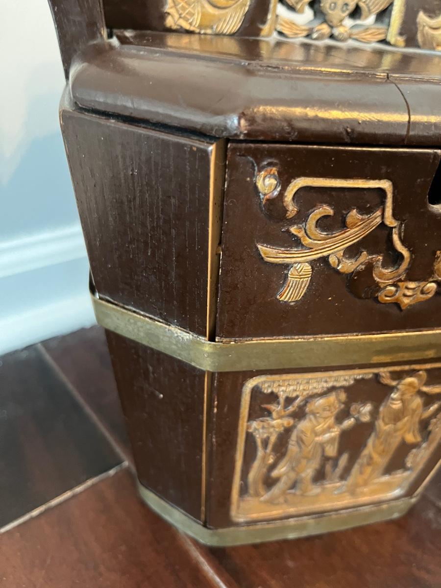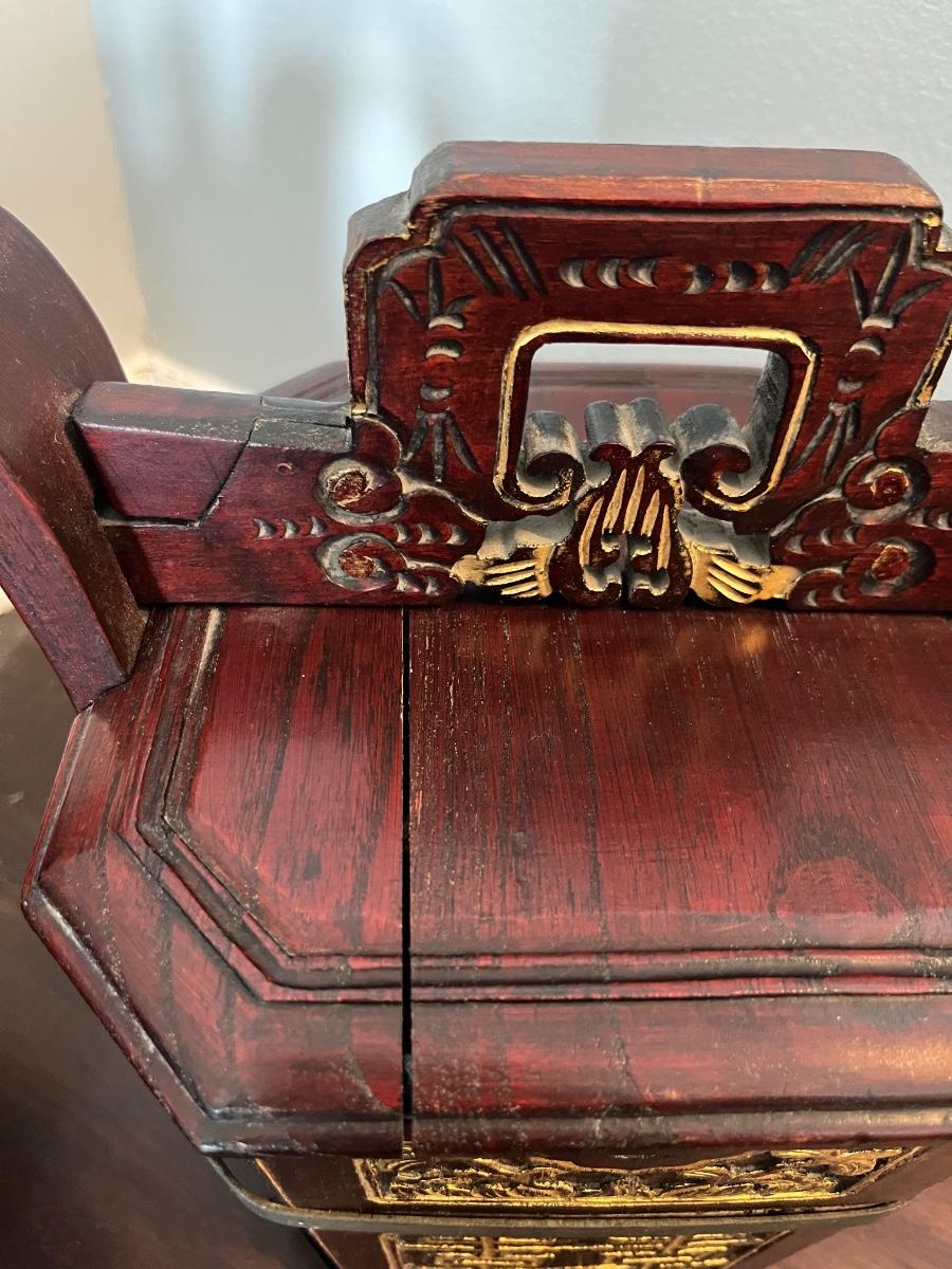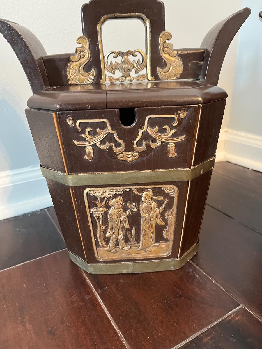 This is a lovely group of late 19th century Chinese wedding baskets. Both have a dark finish, carvings and are decorated with gold. Both bear antique customs stamps. One has a split in the top.