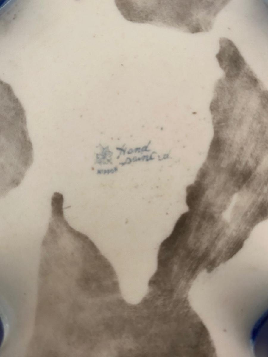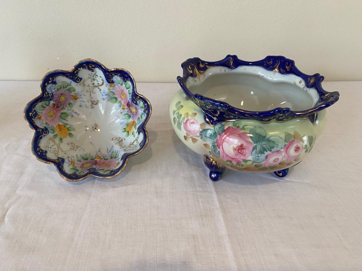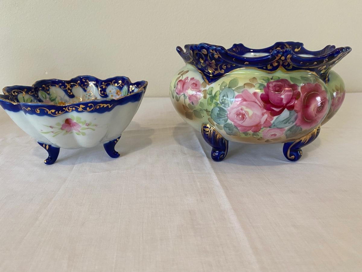 Two antique hand painted Nippon footed bowls. One is signed and one is not. Bowl on left is approx 6w x 3h, bowl on right is approx 7-1/2w x 5h. VG condition