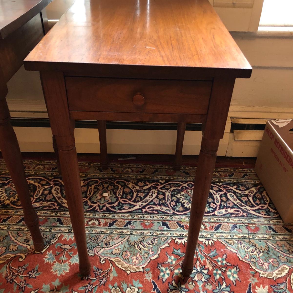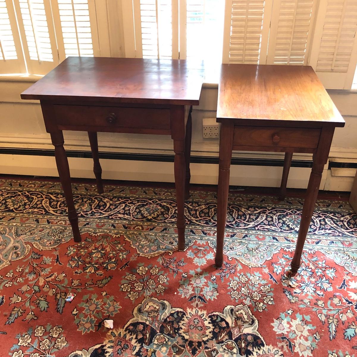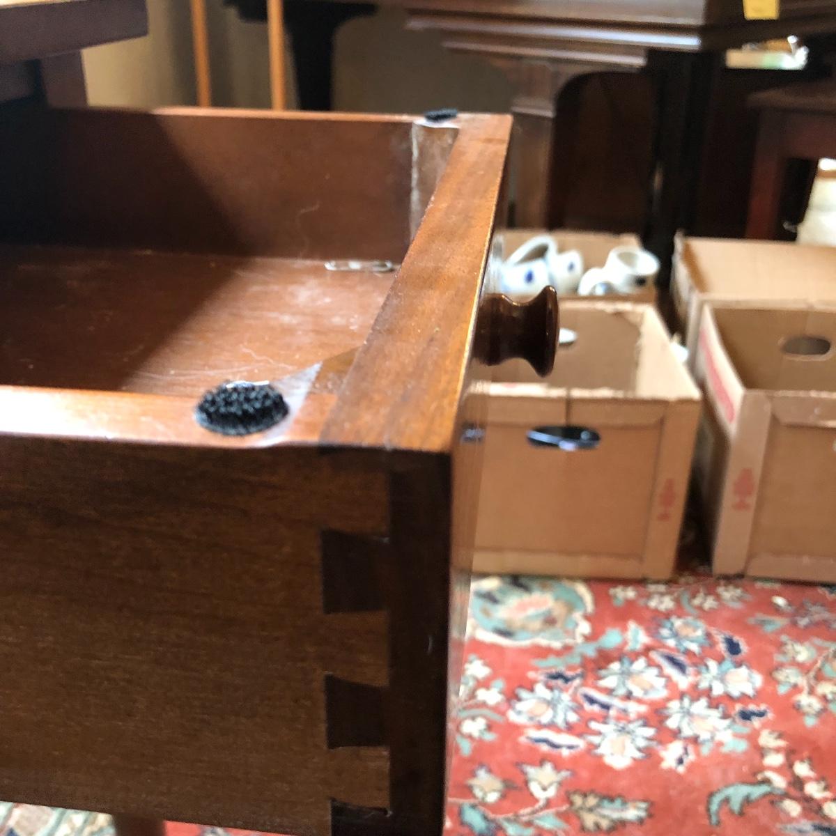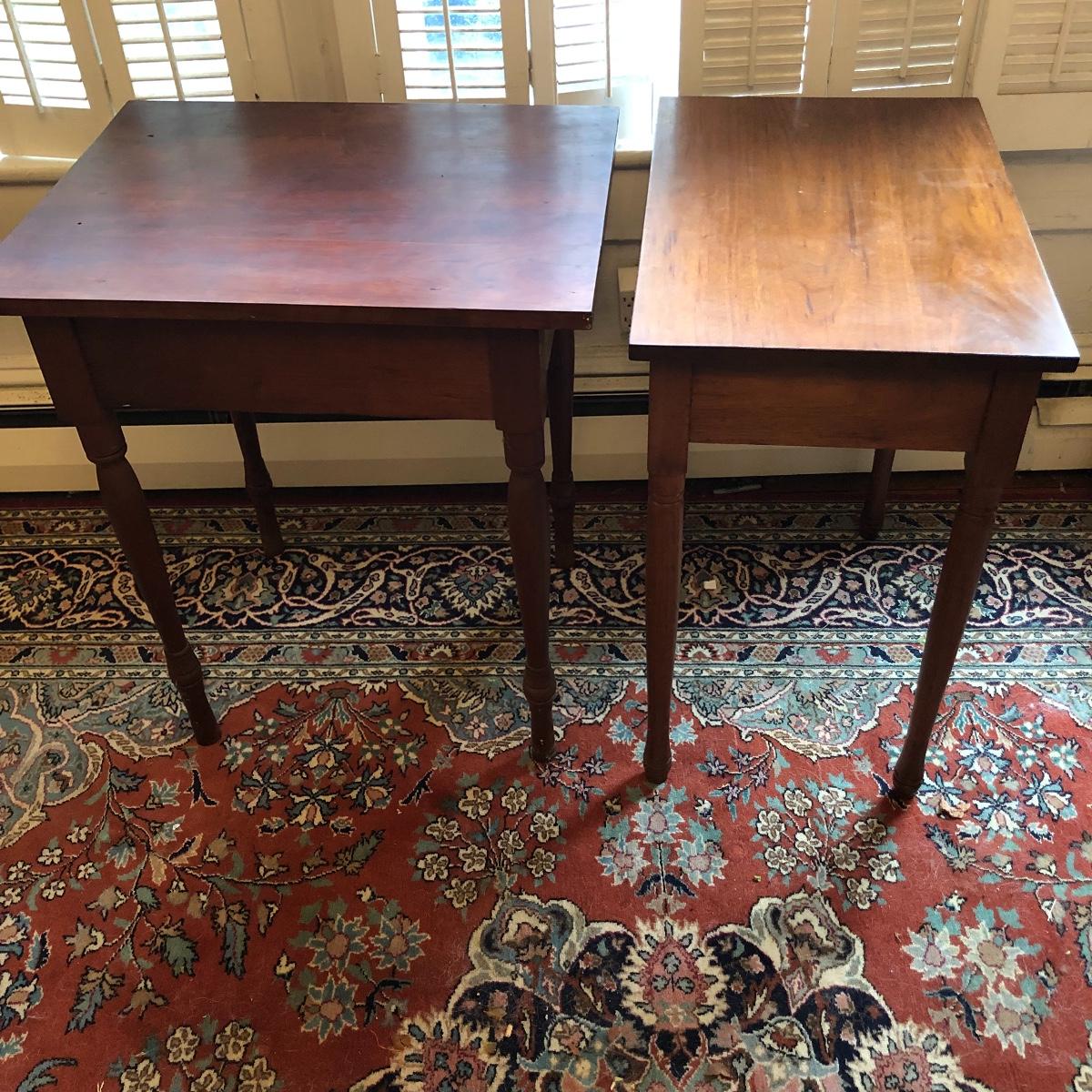 Both of these two tall tables each have one dovetailed drawer each. The darker wood larger table has a few scratches and measures 20” x 25” x 29”. The lighter table has some blemishes also, see images.