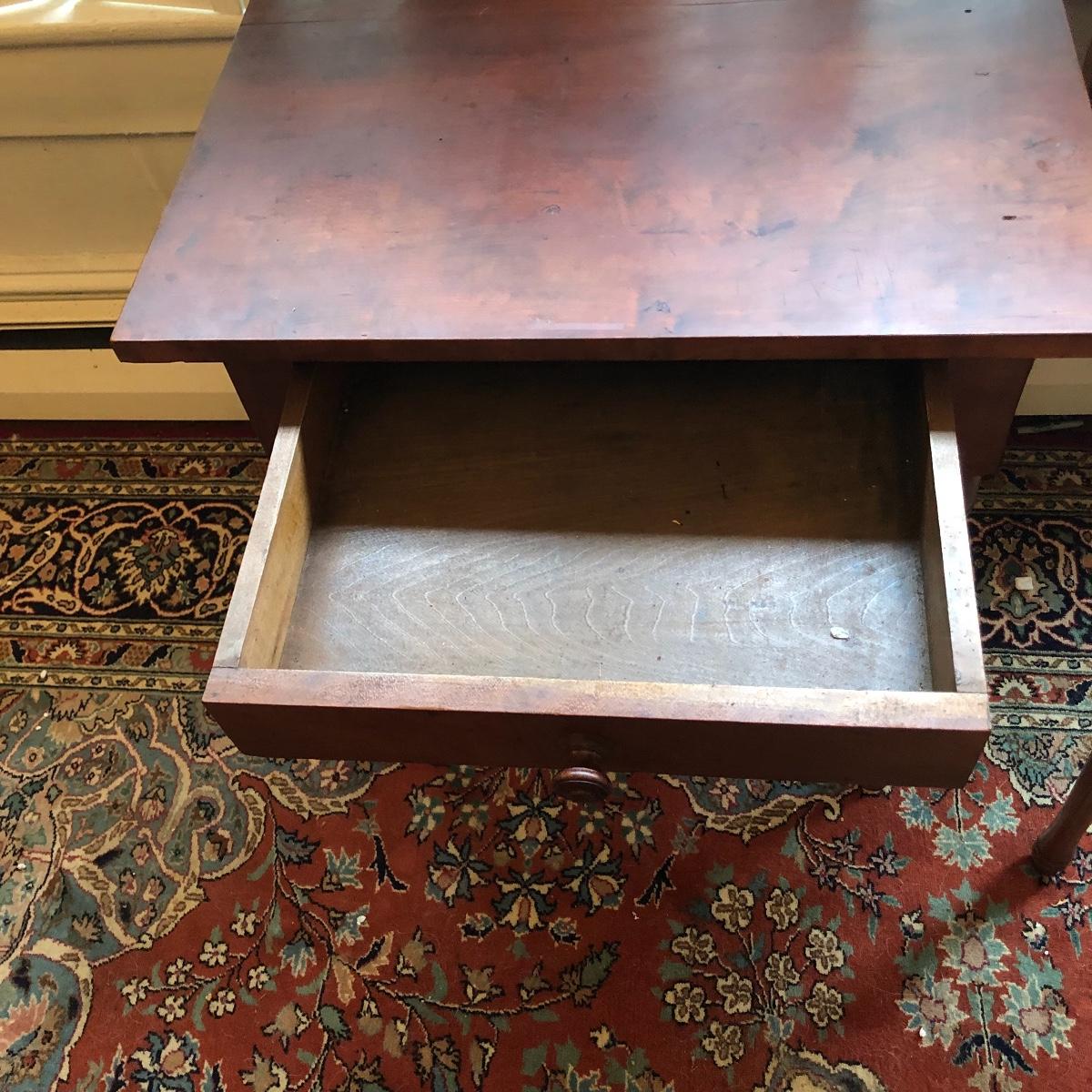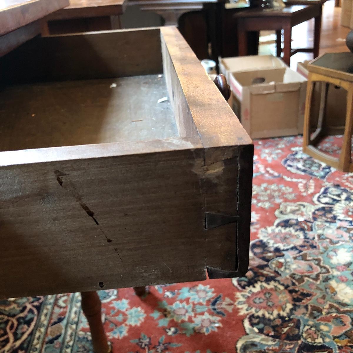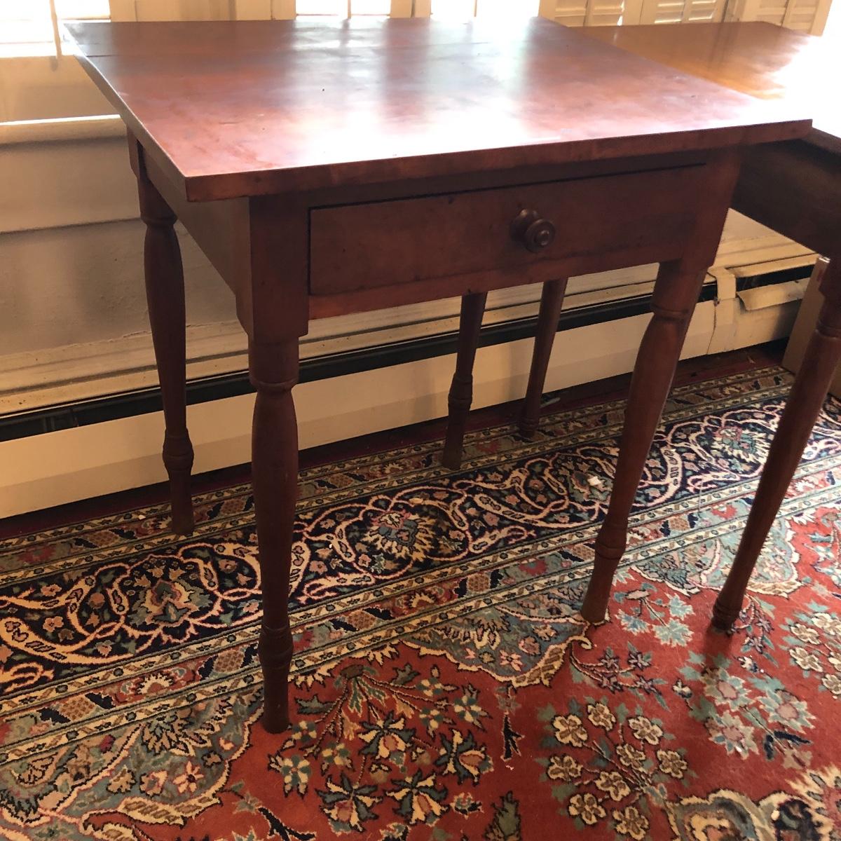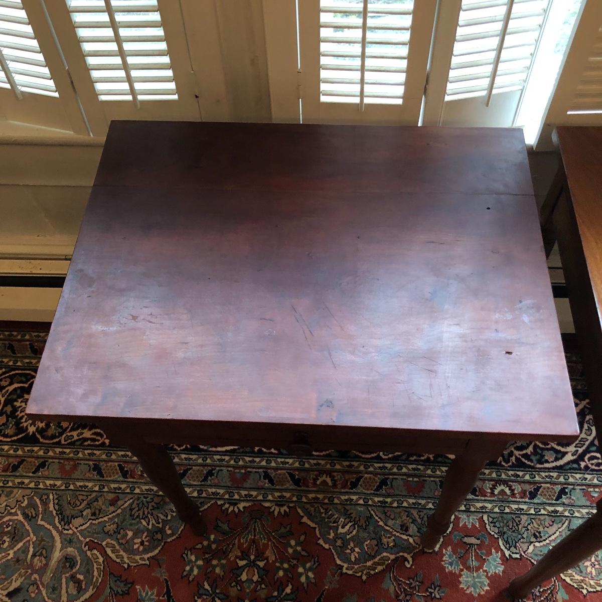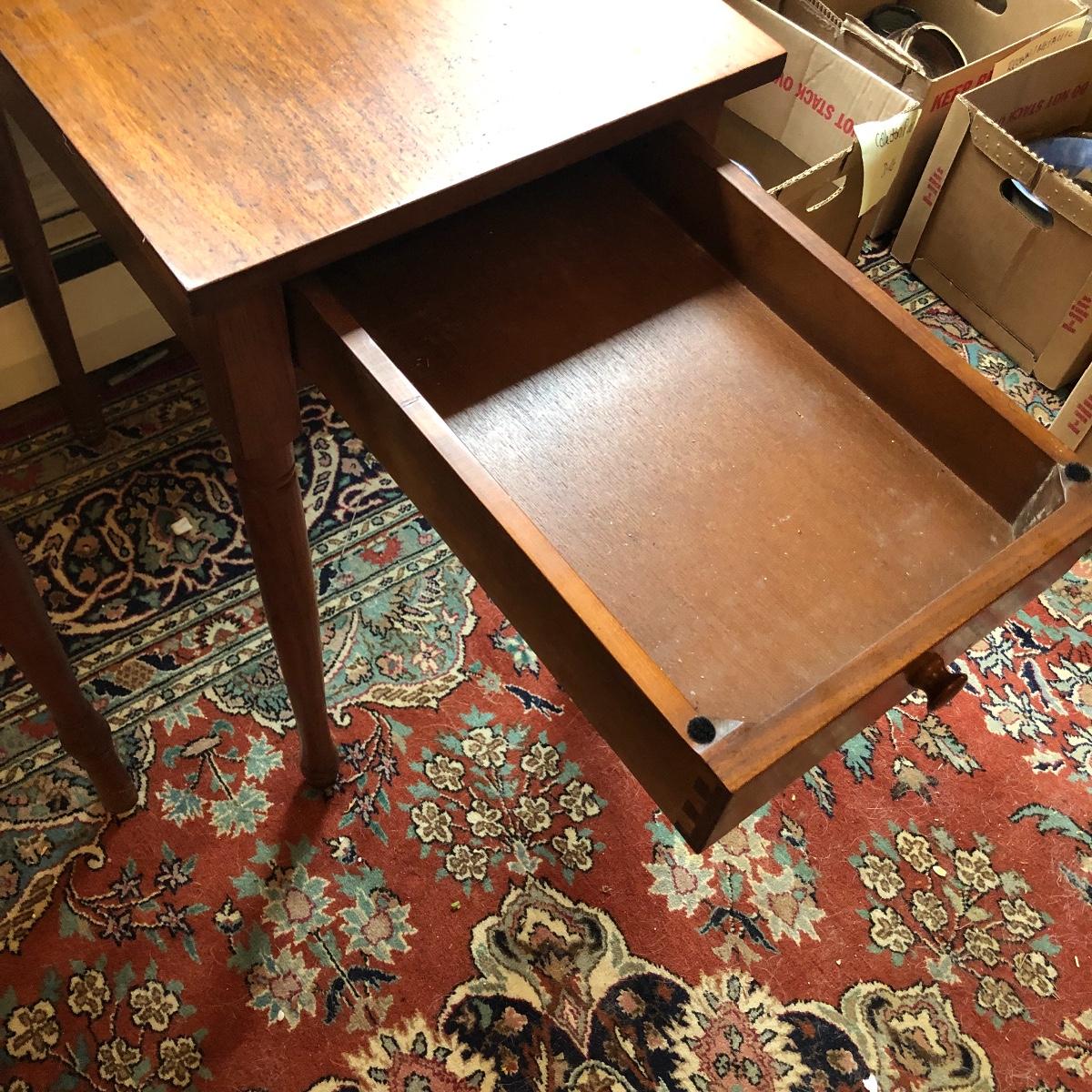 Both of these two tall tables each have one dovetailed drawer each. The darker wood larger table has a few scratches and measures 20” x 25” x 29”. The lighter table has some blemishes also, see images.