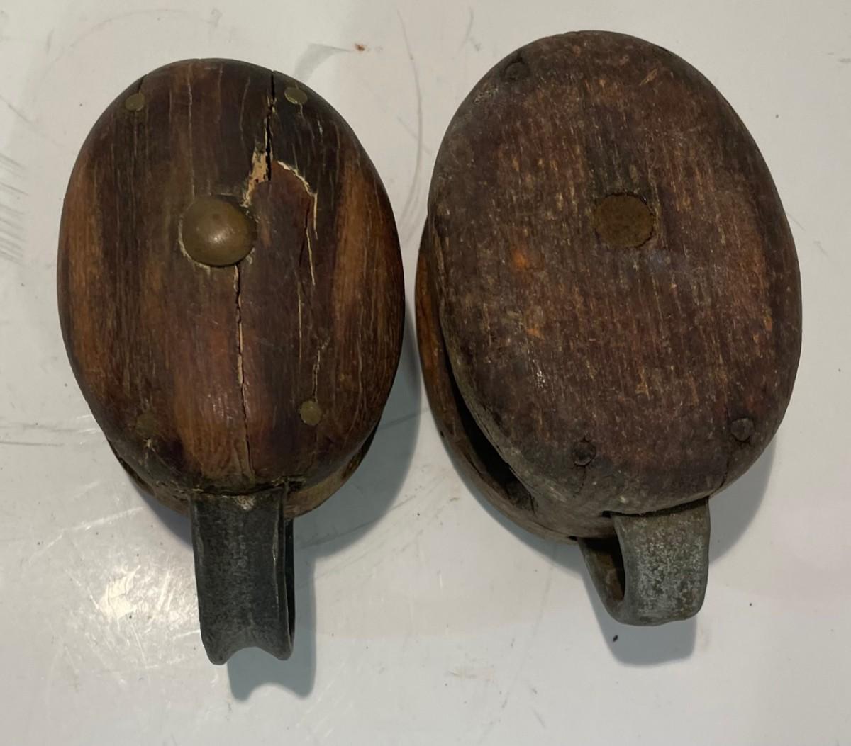 Description: Two Antique Wood Block Tackle Pullies Measurement approximate: 2.75 x 3Material: Wood/ metal