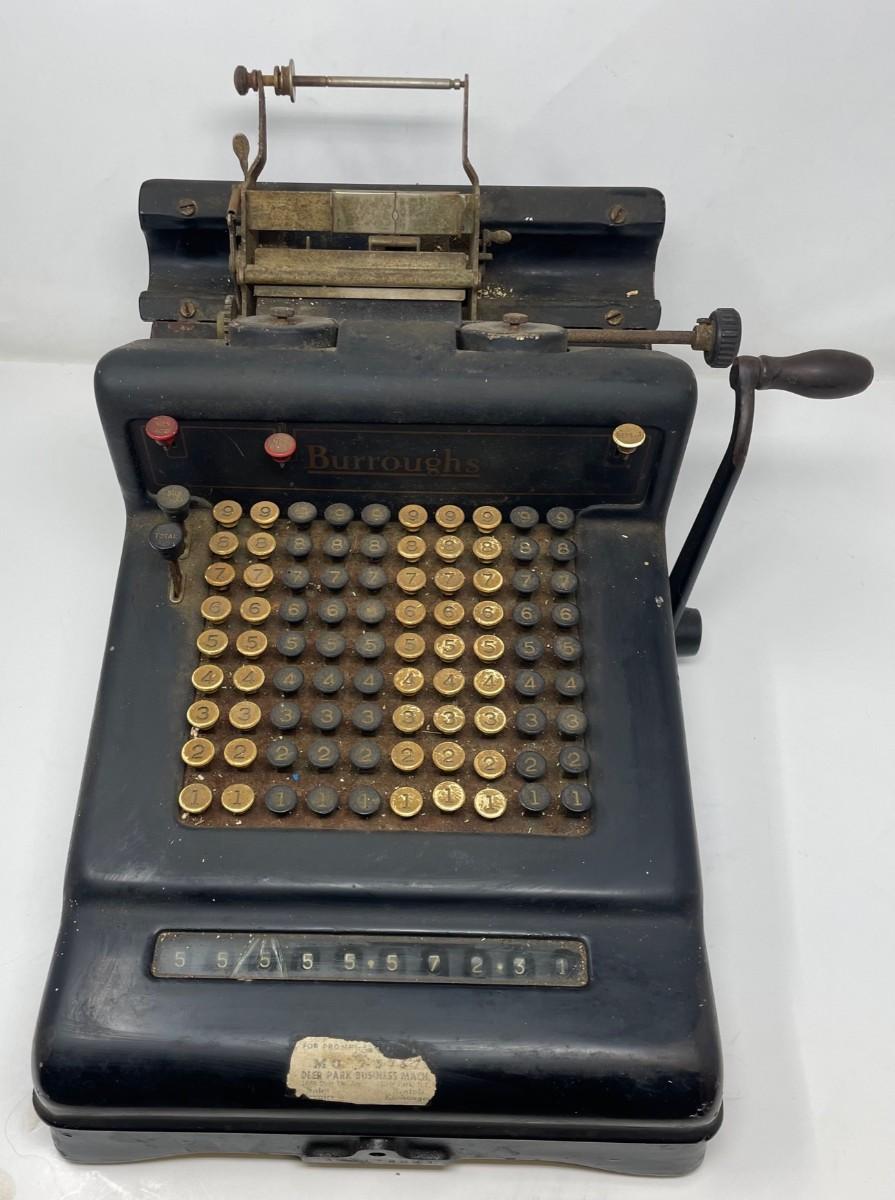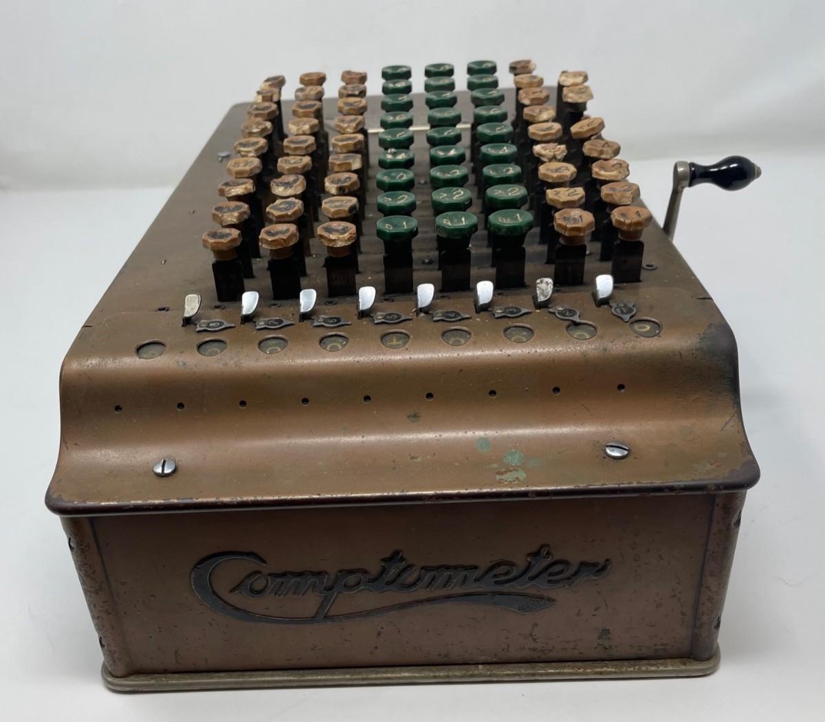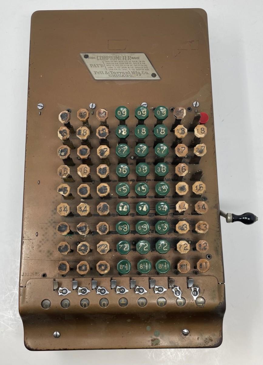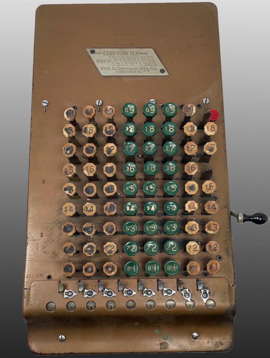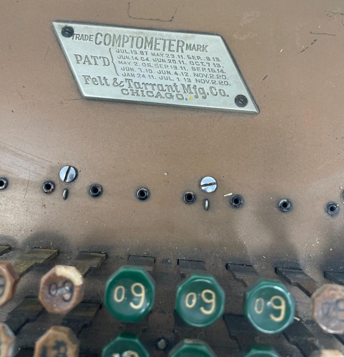 Description: COMPTOMETER CALCULATOR/ Felt & Tarrant Mfg. Co. Chicago. PAT'D and Burroughs Calculator/ Felt & Tarrant Mfg. Co. Chicago. PAT'D.. Measurement approximate: 15 x 8” (Inches).Material: Metal.