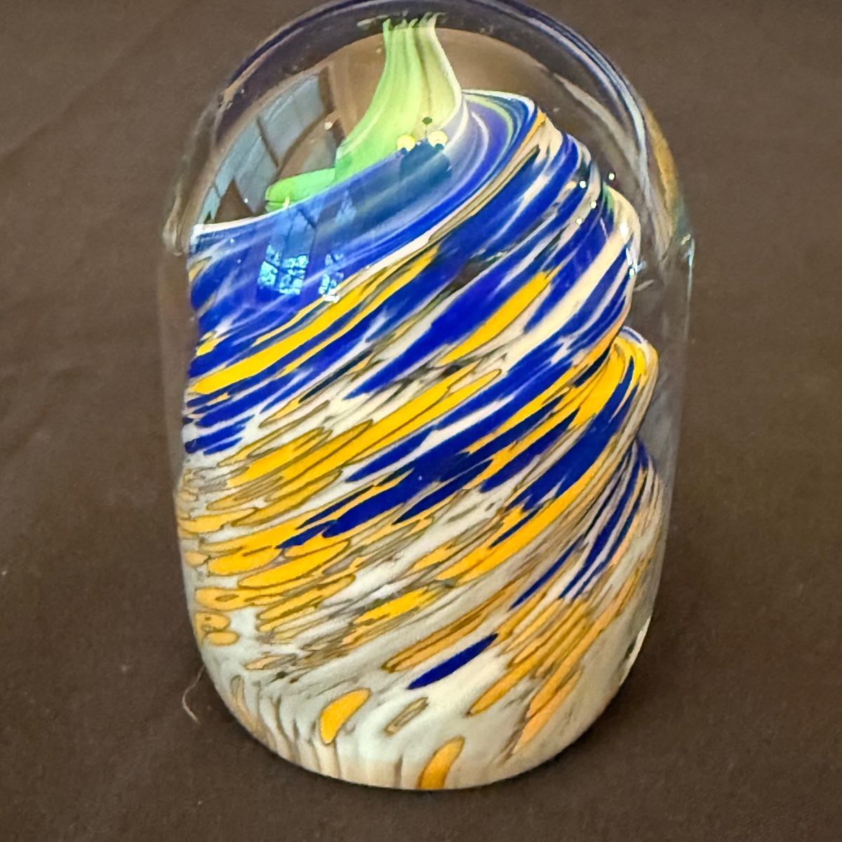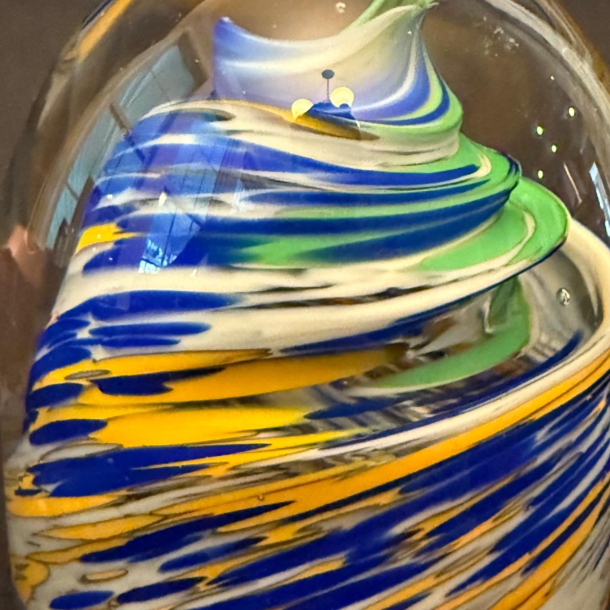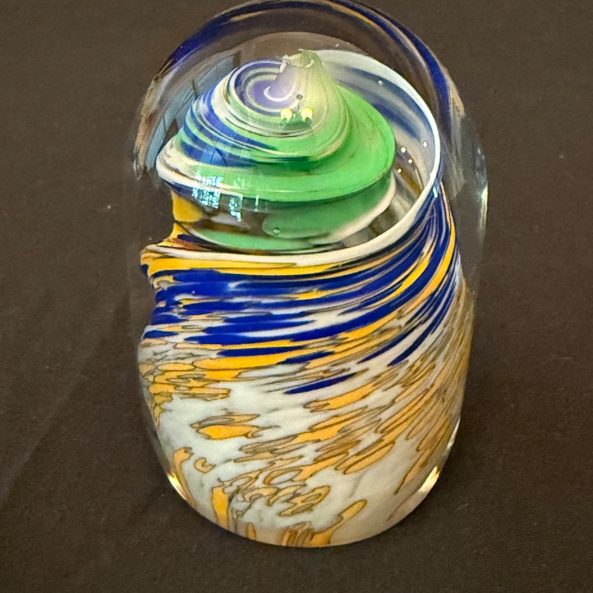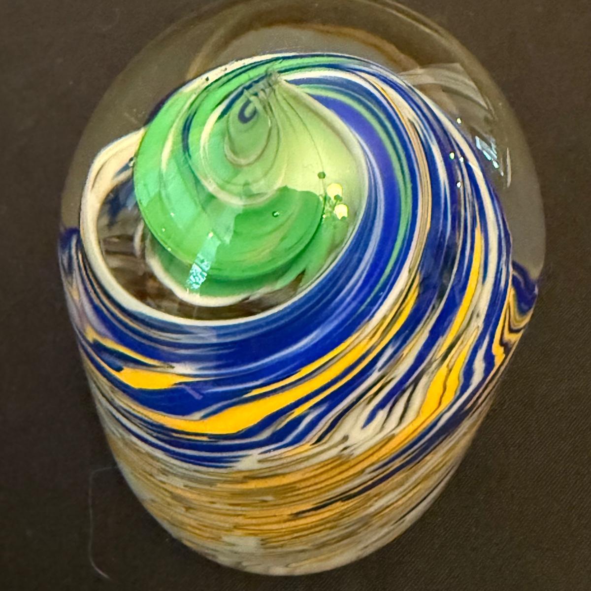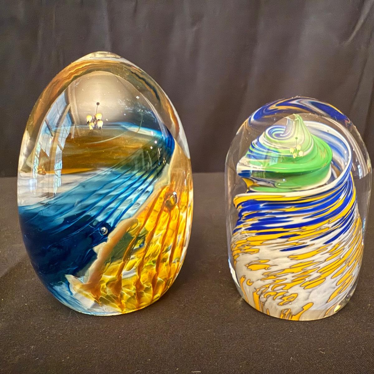 Two glass paperweights with hypnotic swirls. The larger is approximately 2.75”D x 3.75”H. No signature found on either item.