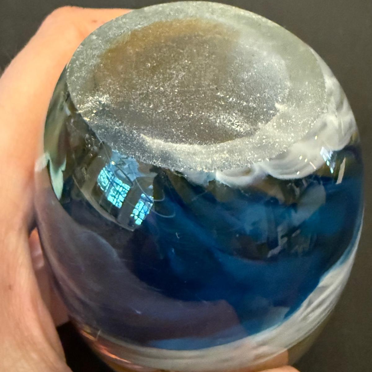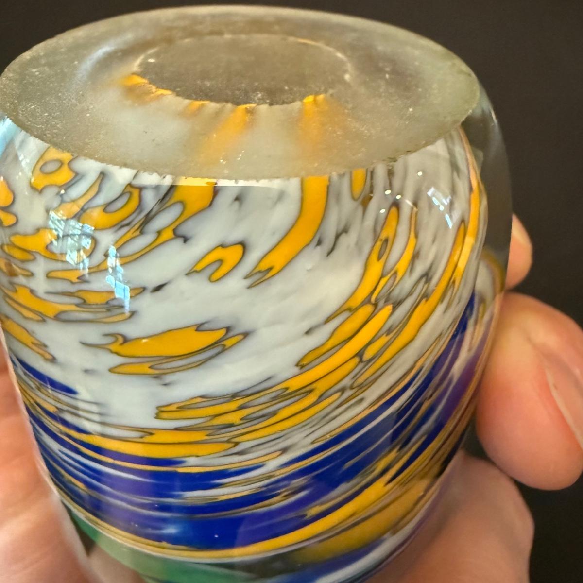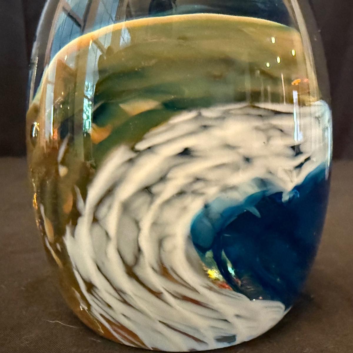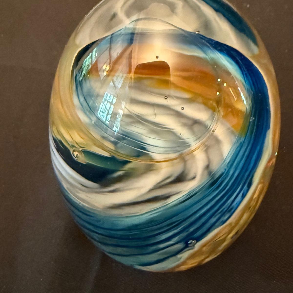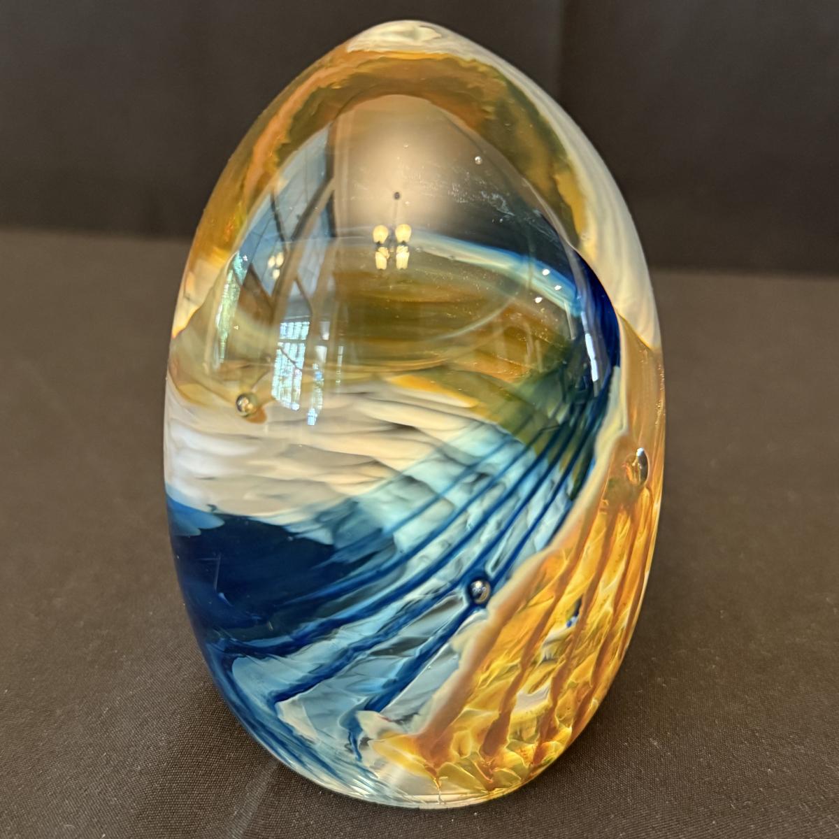 Two glass paperweights with hypnotic swirls. The larger is approximately 2.75”D x 3.75”H. No signature found on either item.