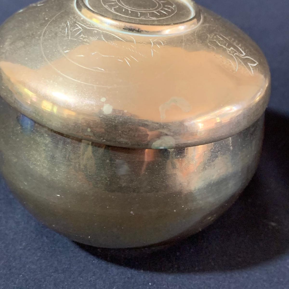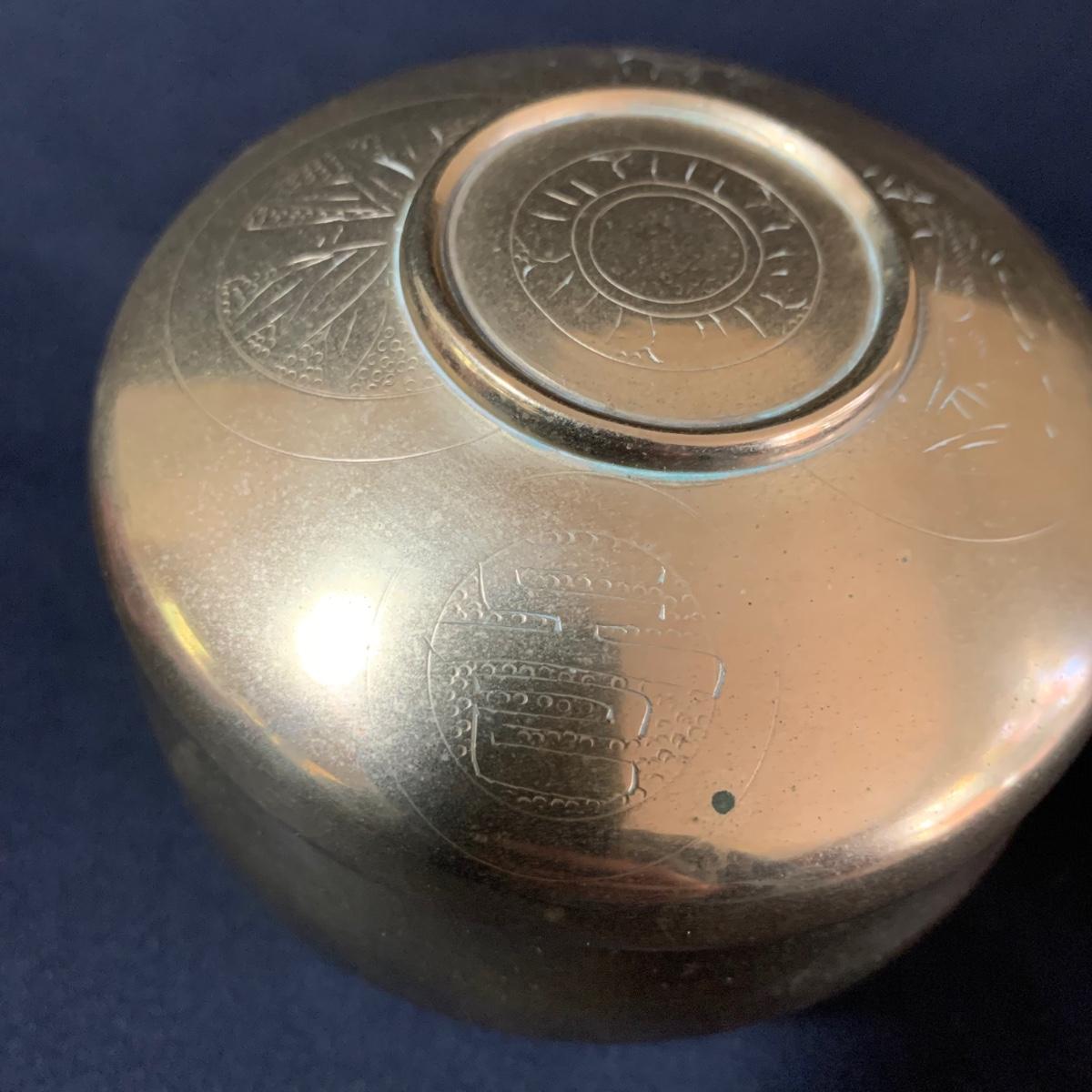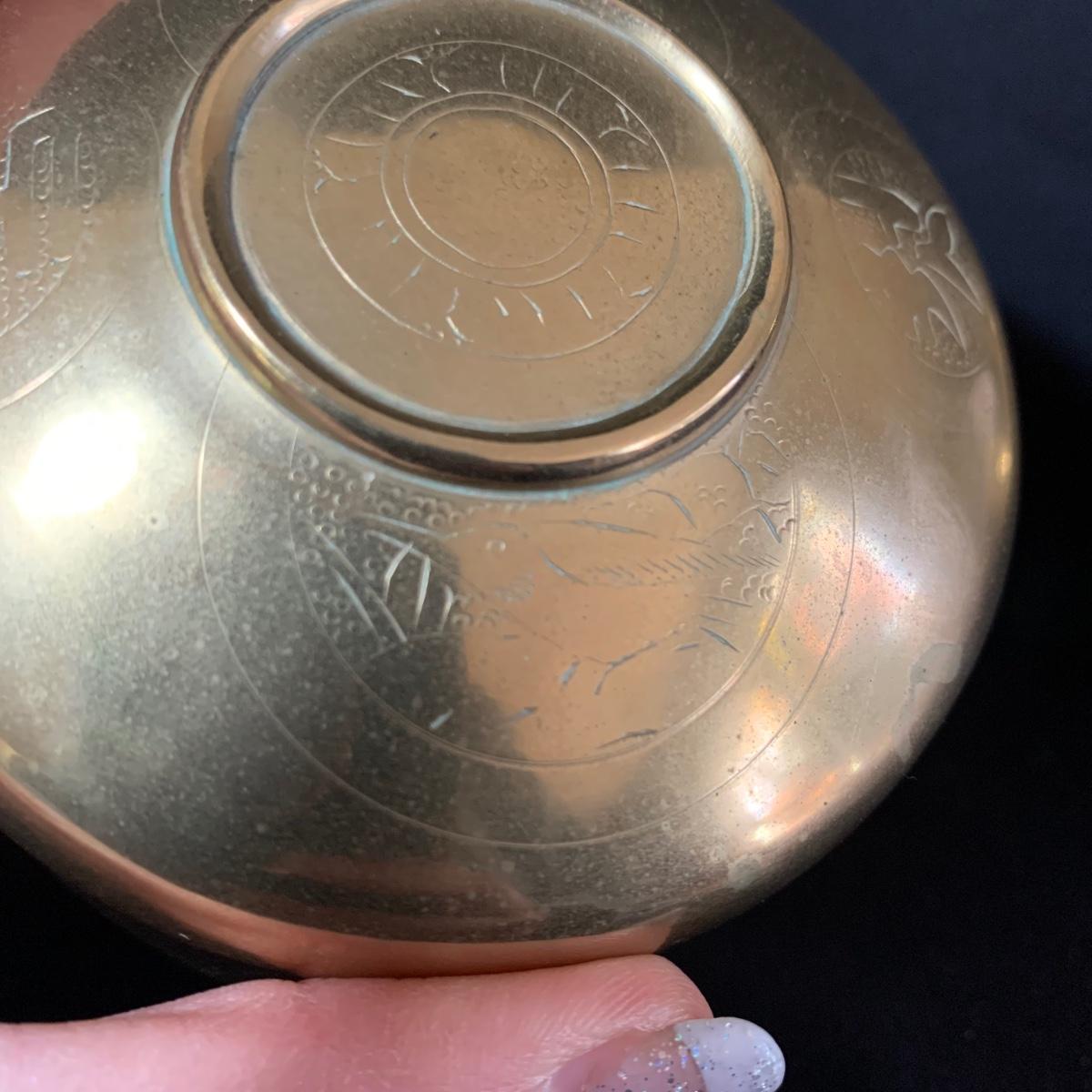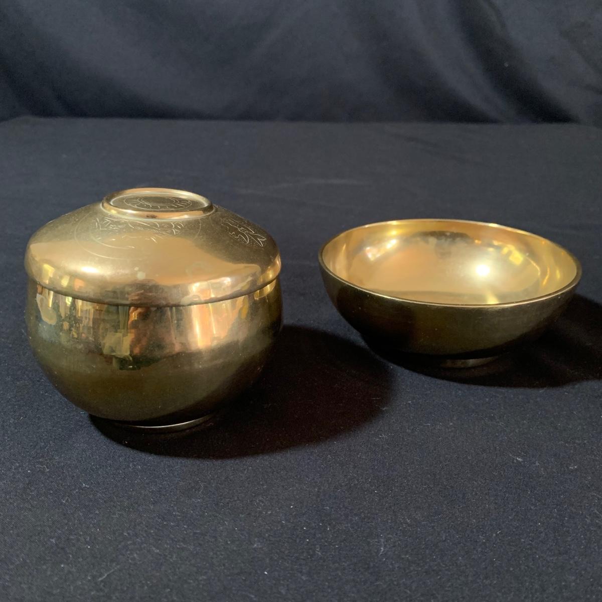 Two lovely Asian bowls that appear to be brass. One has a lid with delicate engraved designs. The bowl without the lid measures 5”D x 2”H. These are both in very good condition, with just a few small surface blemishes, shown in photos..