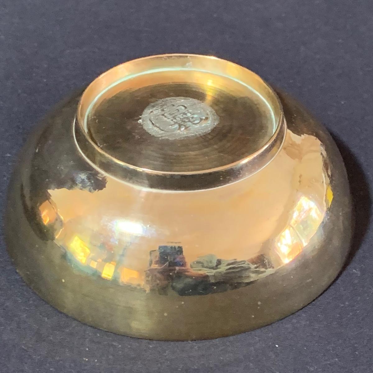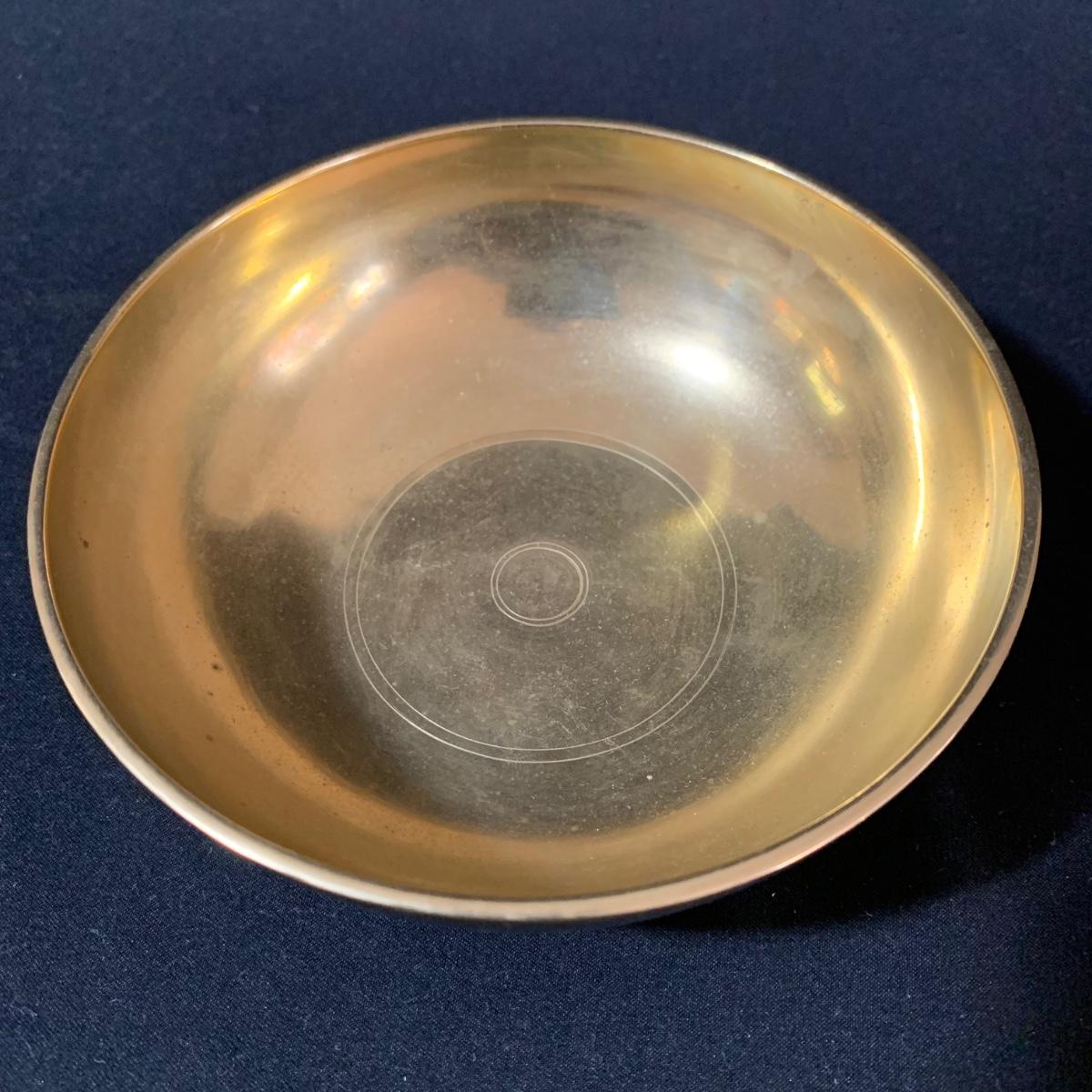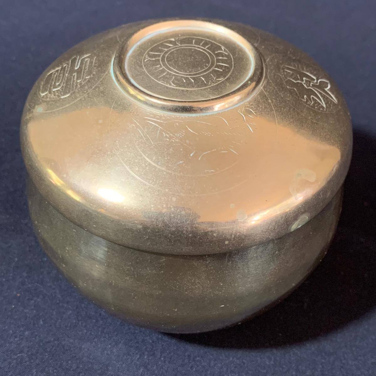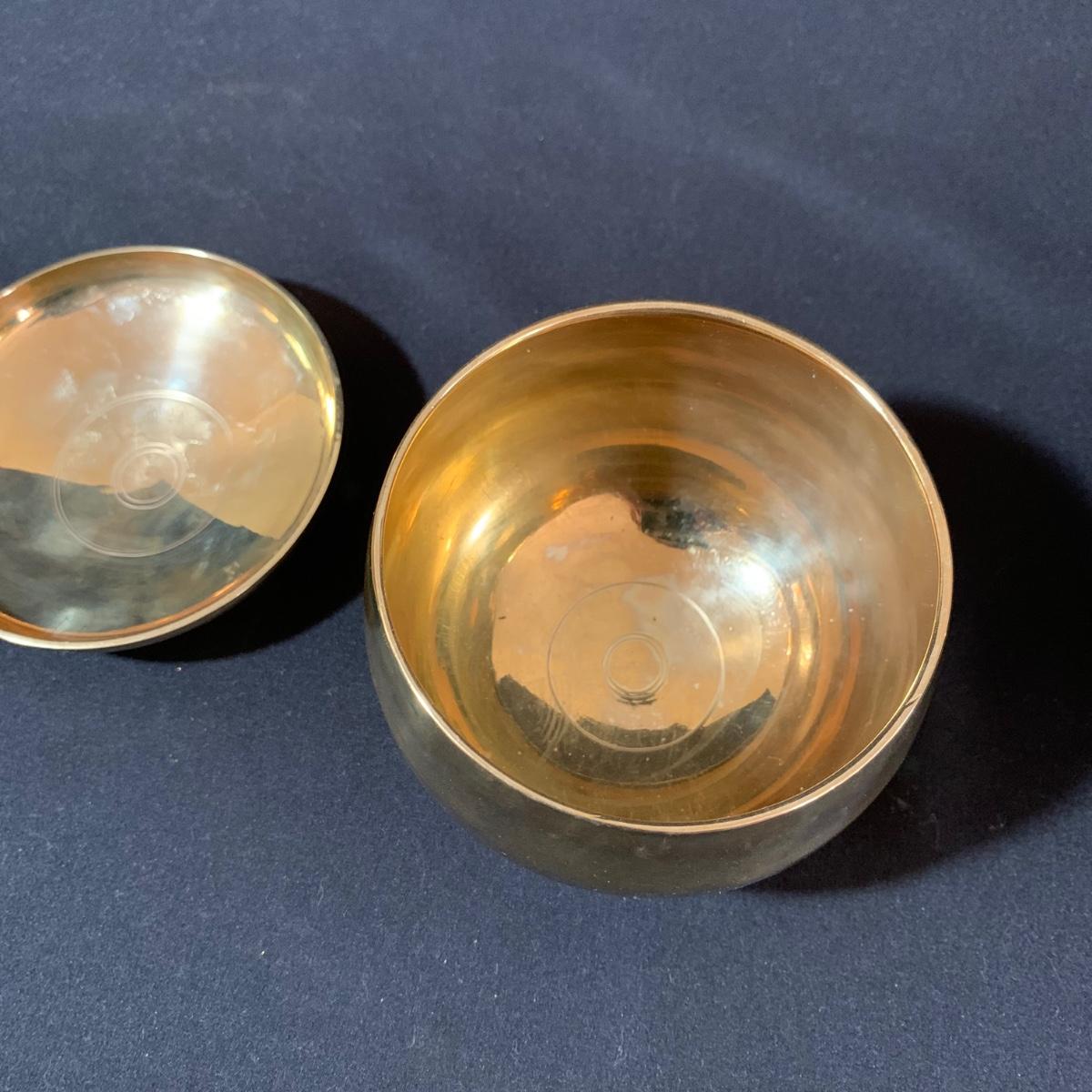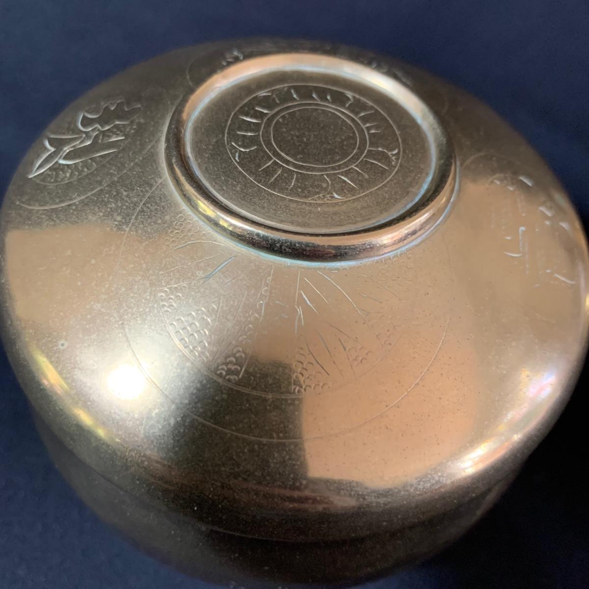 Two lovely Asian bowls that appear to be brass. One has a lid with delicate engraved designs. The bowl without the lid measures 5”D x 2”H. These are both in very good condition, with just a few small surface blemishes, shown in photos..