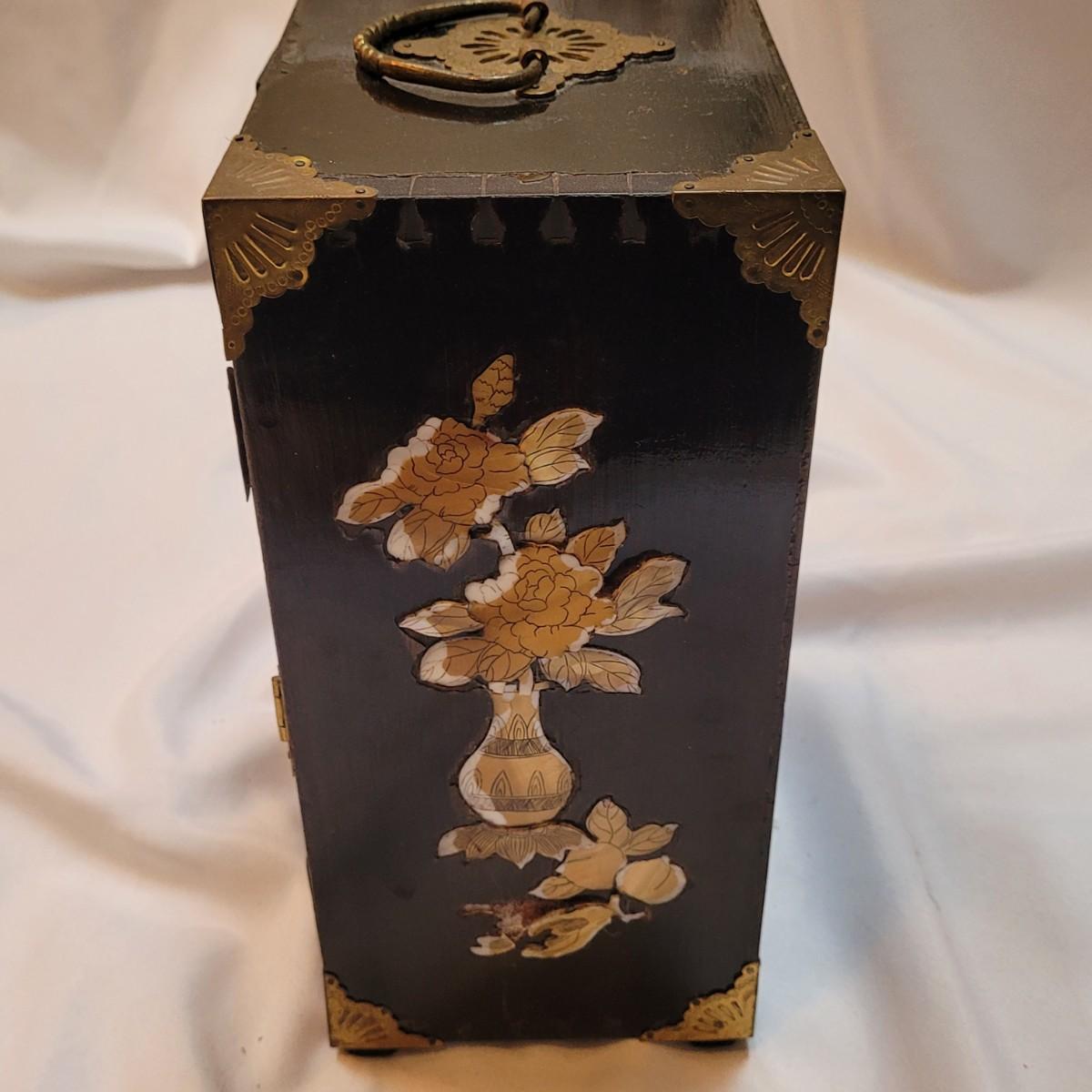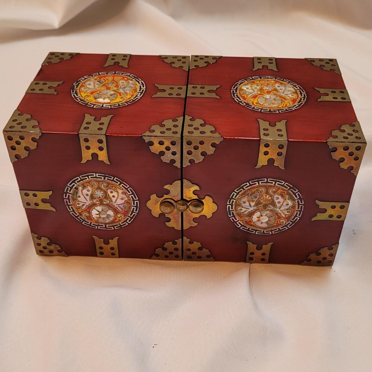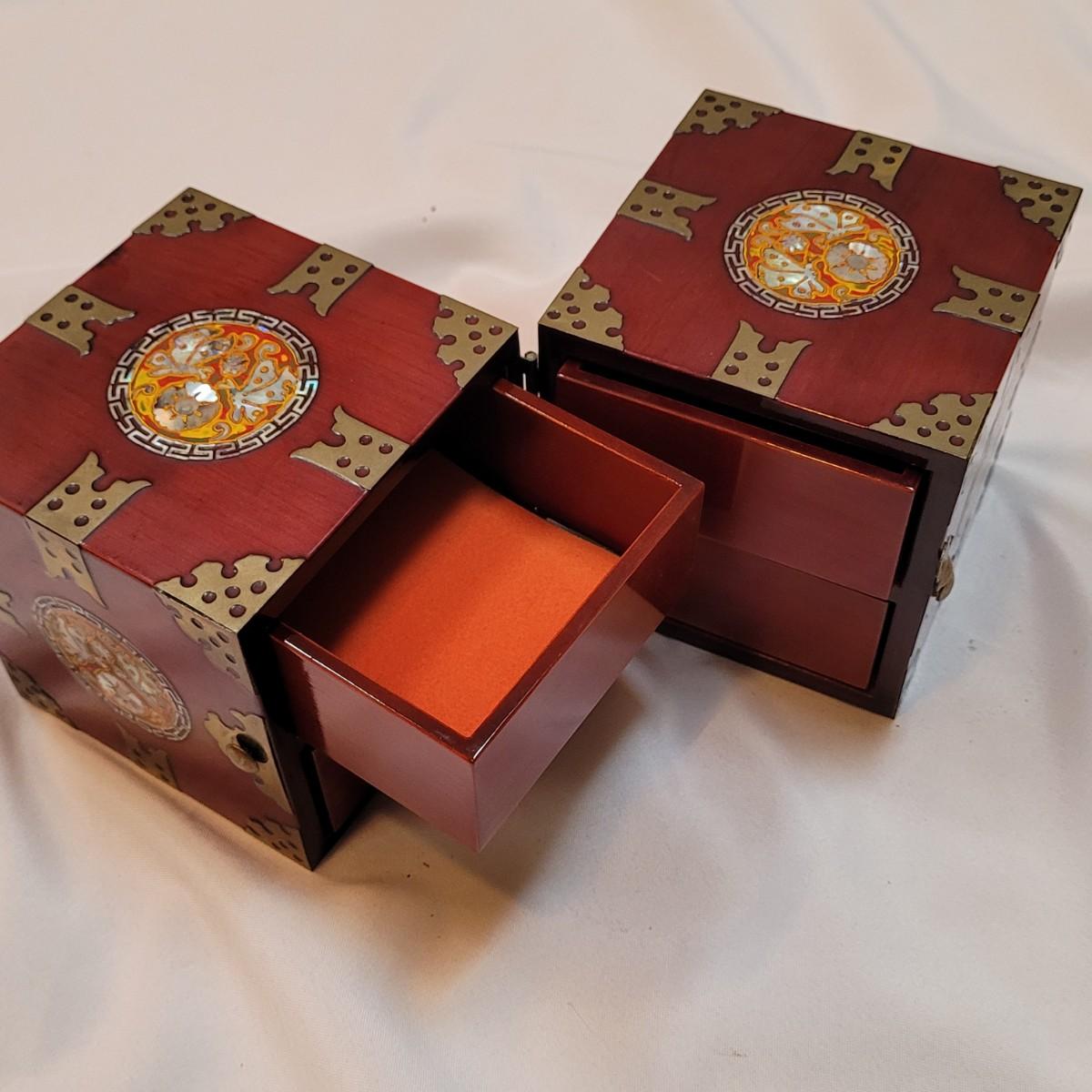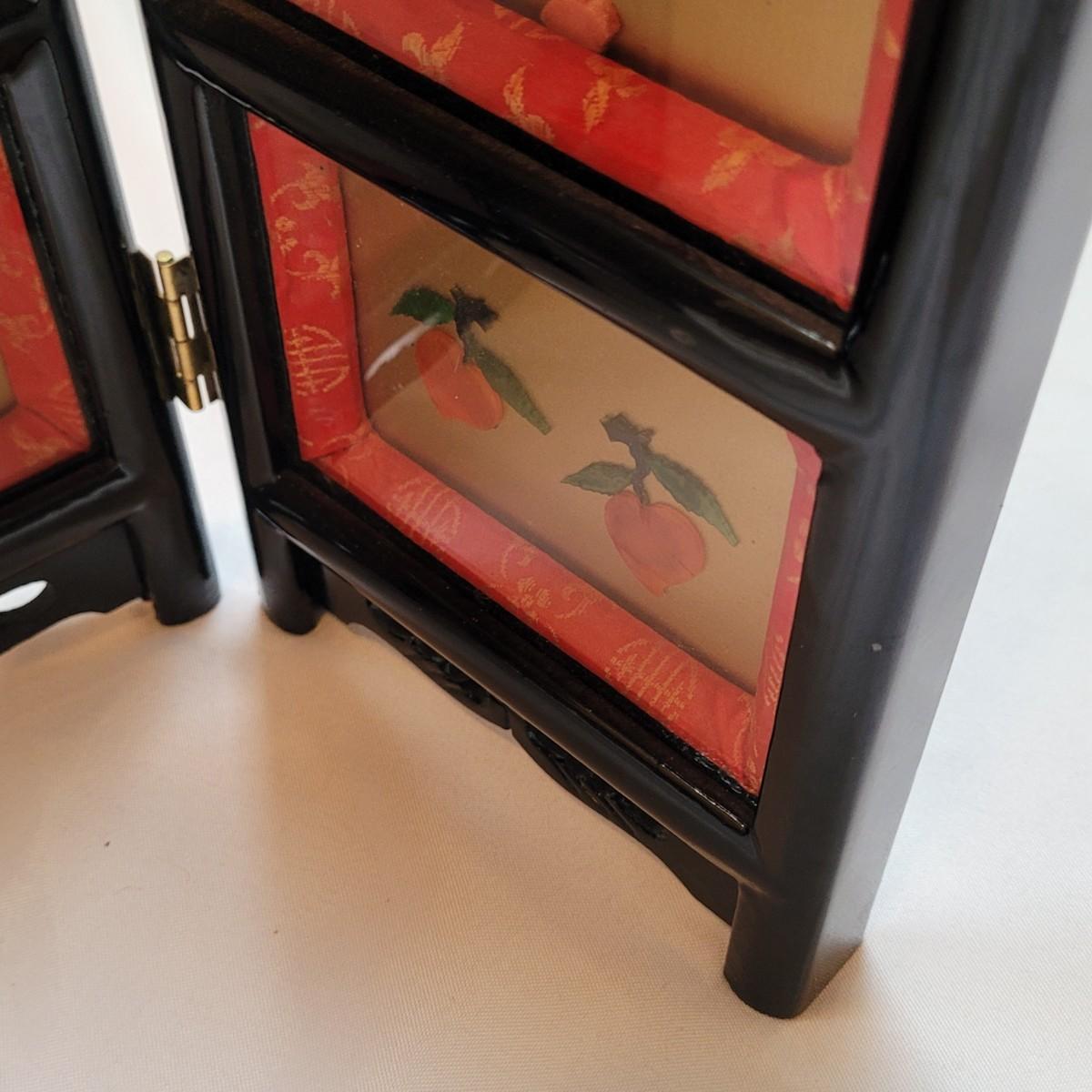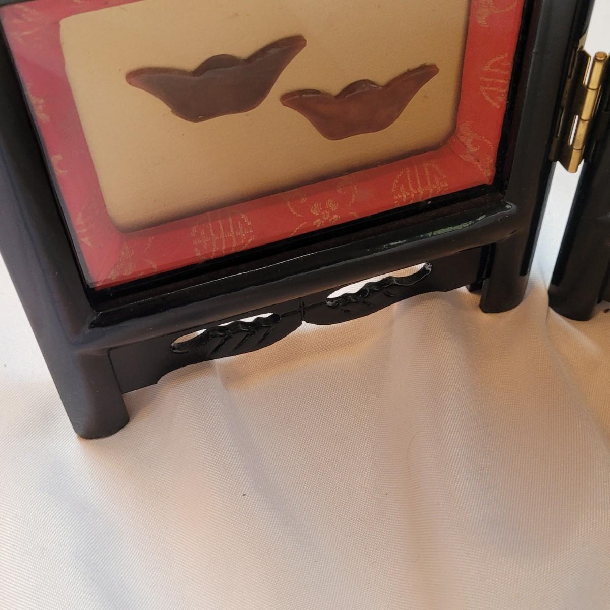 This auction is for two asian style jewelry boxes and an ornate divider screen. The black jewelry box is made from wood with metal accents and features five sliding drawers for storage. Some of the wooden decorations are peeling from the side. The red jewelry box splits in half revealing four sliding drawers. It is also made from wood with metal accents. The divider screen has four panels with unique decorations depicting plants and animals. The divider measures 24" x 18"H when open.