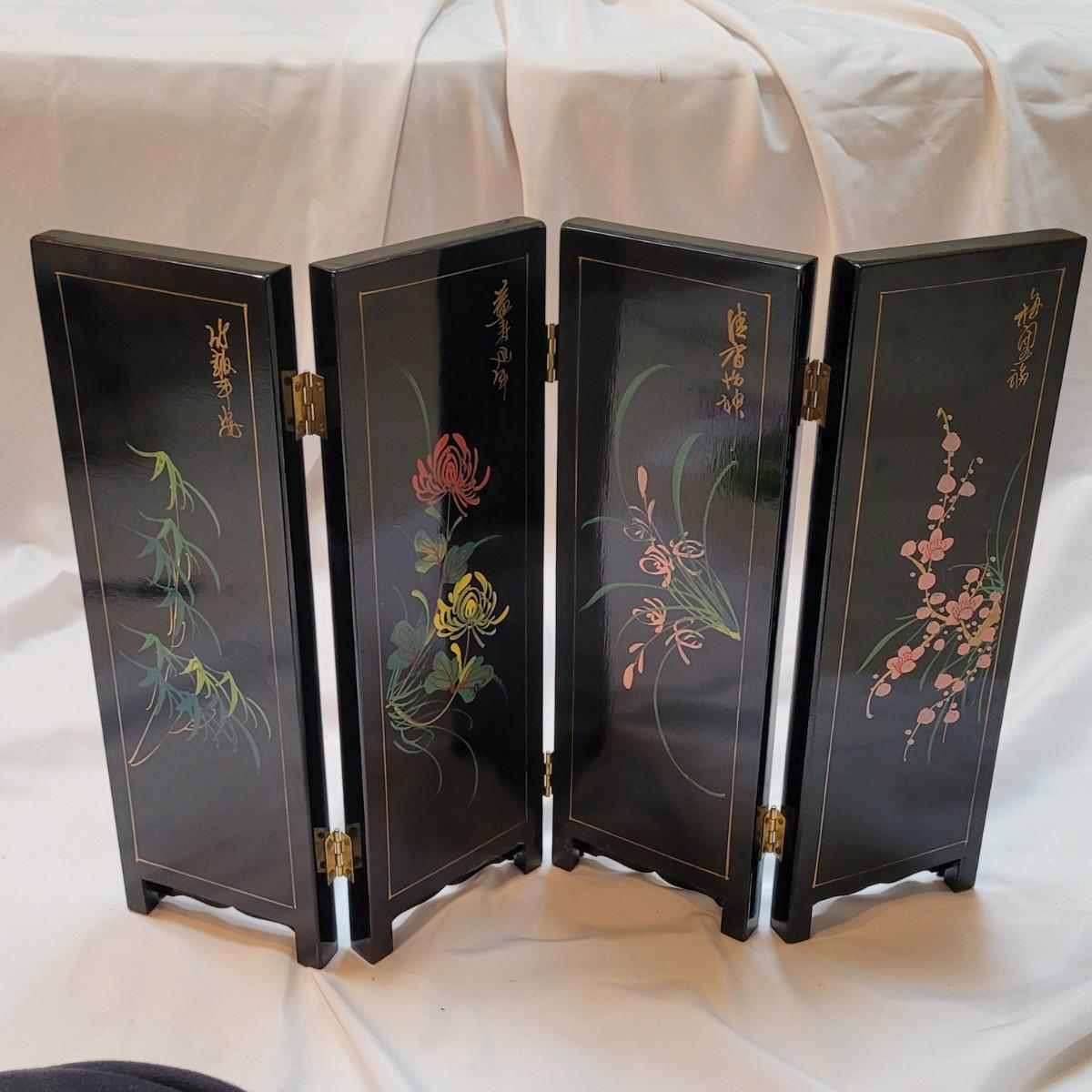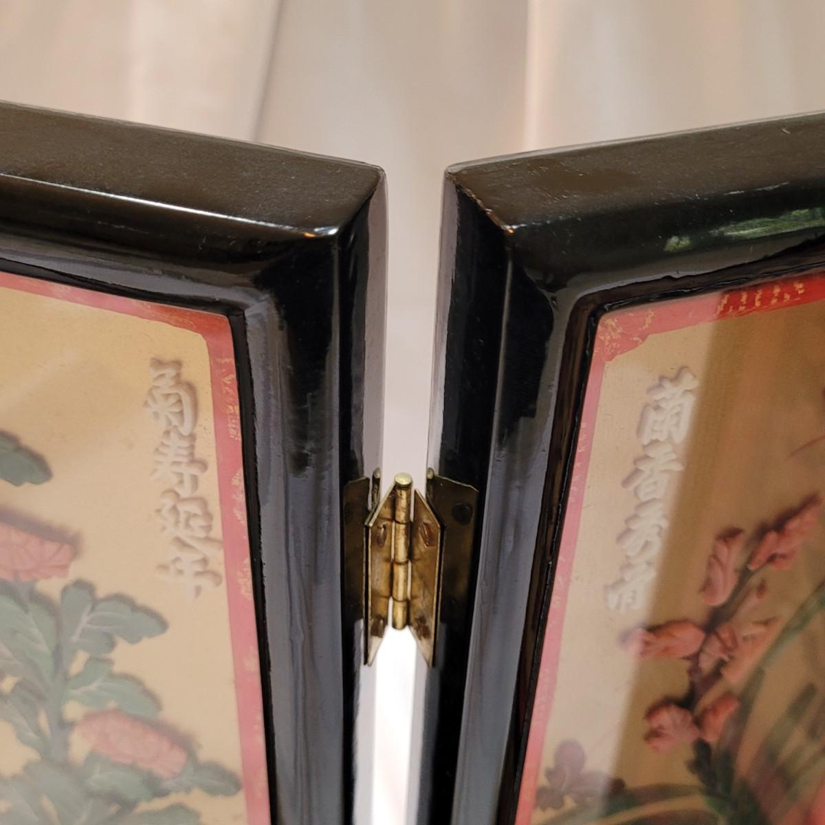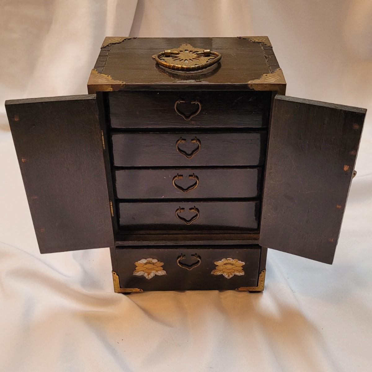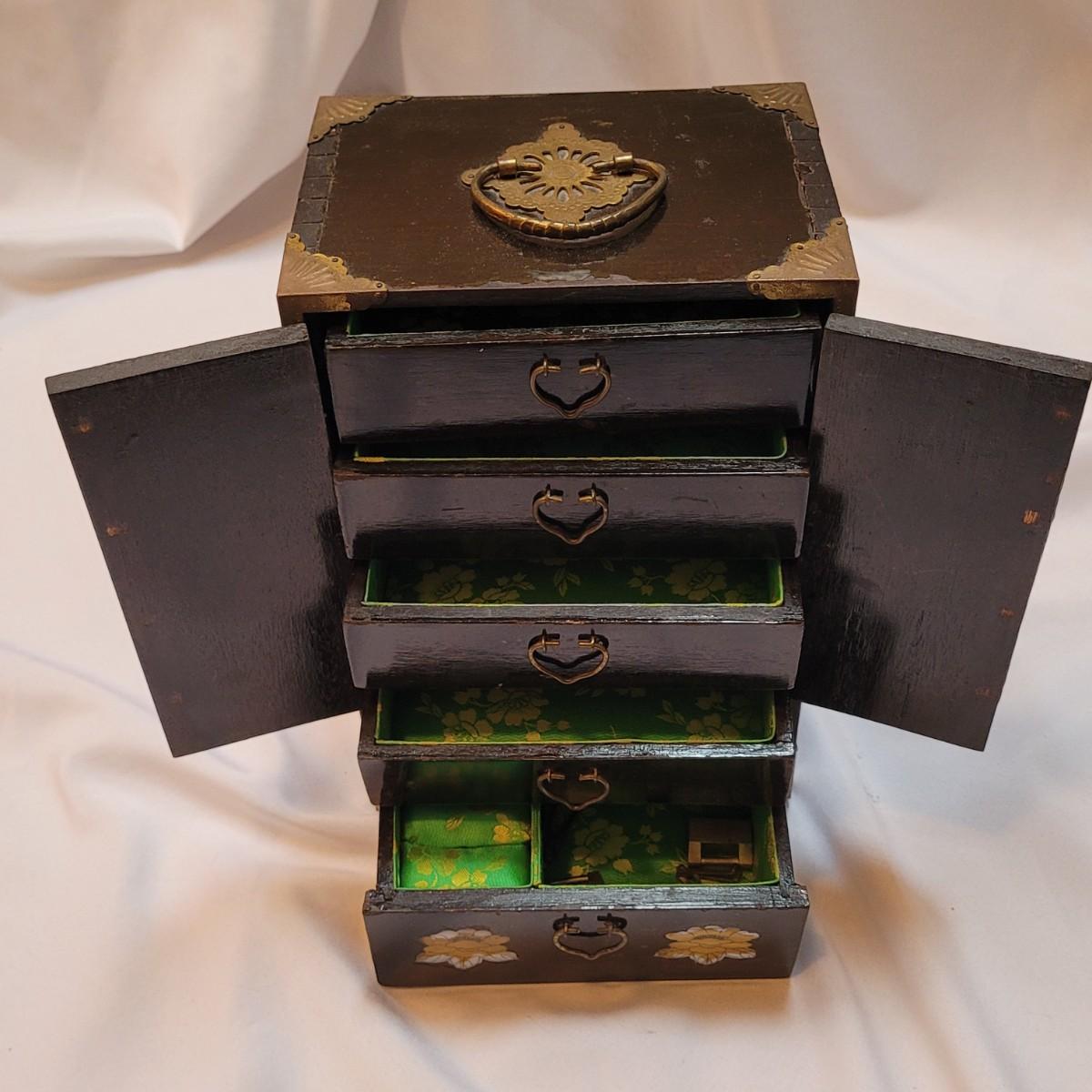 This auction is for two asian style jewelry boxes and an ornate divider screen. The black jewelry box is made from wood with metal accents and features five sliding drawers for storage. Some of the wooden decorations are peeling from the side. The red jewelry box splits in half revealing four sliding drawers. It is also made from wood with metal accents. The divider screen has four panels with unique decorations depicting plants and animals. The divider measures 24" x 18"H when open.