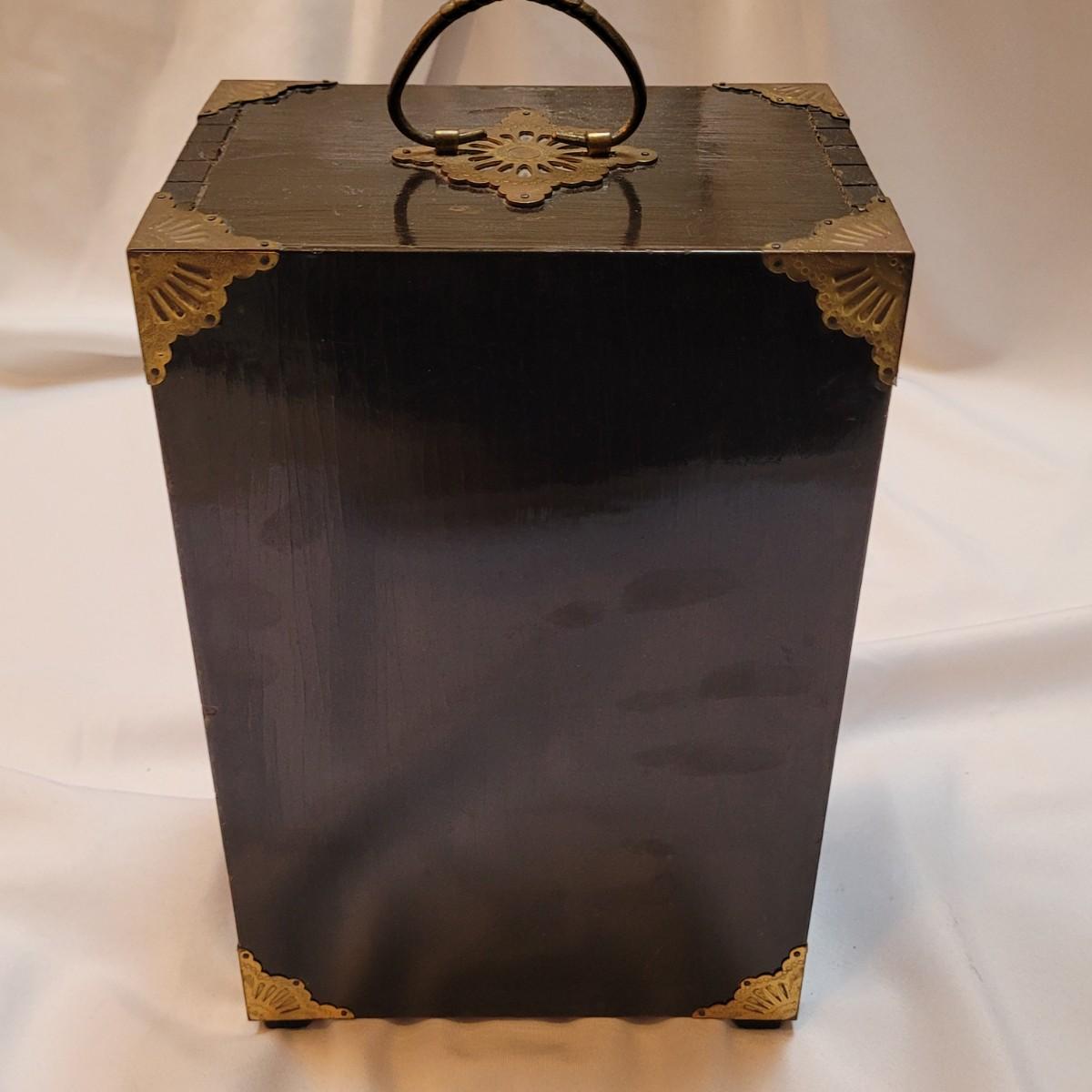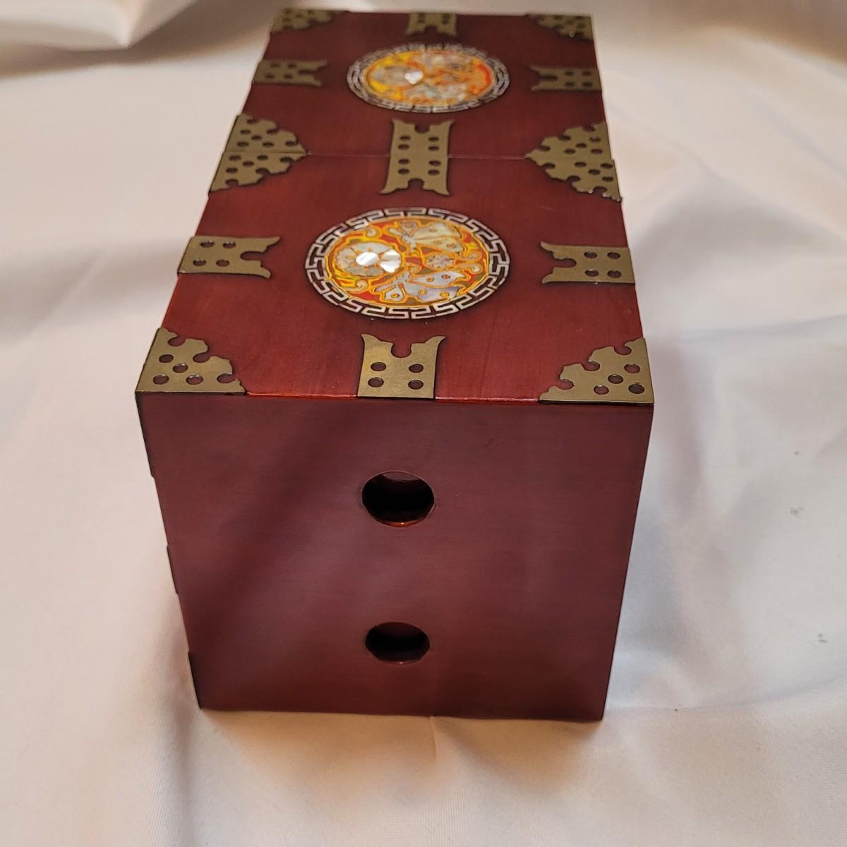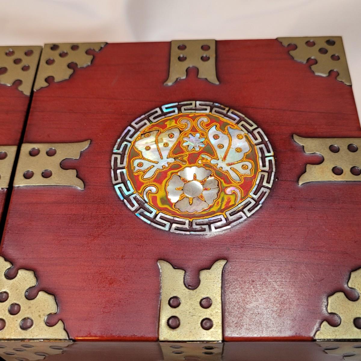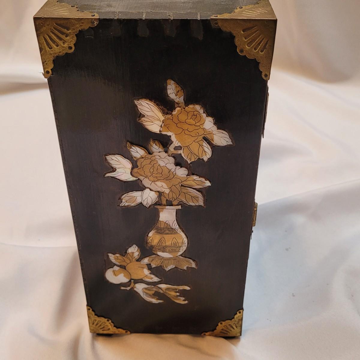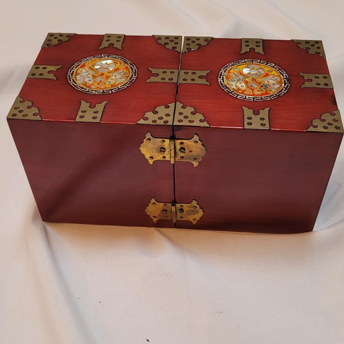 This auction is for two asian style jewelry boxes and an ornate divider screen. The black jewelry box is made from wood with metal accents and features five sliding drawers for storage. Some of the wooden decorations are peeling from the side. The red jewelry box splits in half revealing four sliding drawers. It is also made from wood with metal accents. The divider screen has four panels with unique decorations depicting plants and animals. The divider measures 24" x 18"H when open.