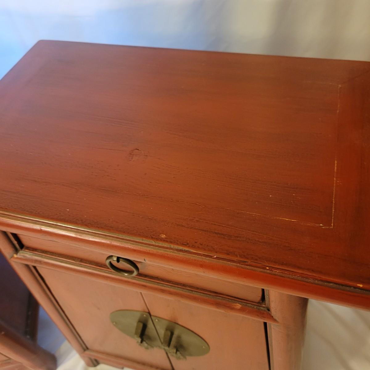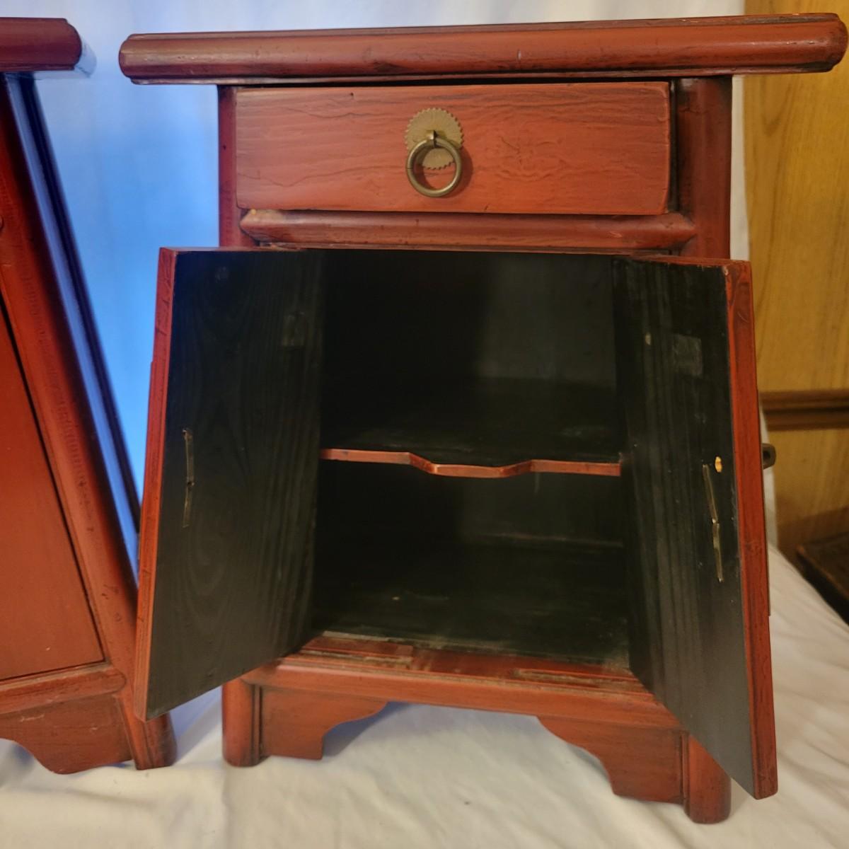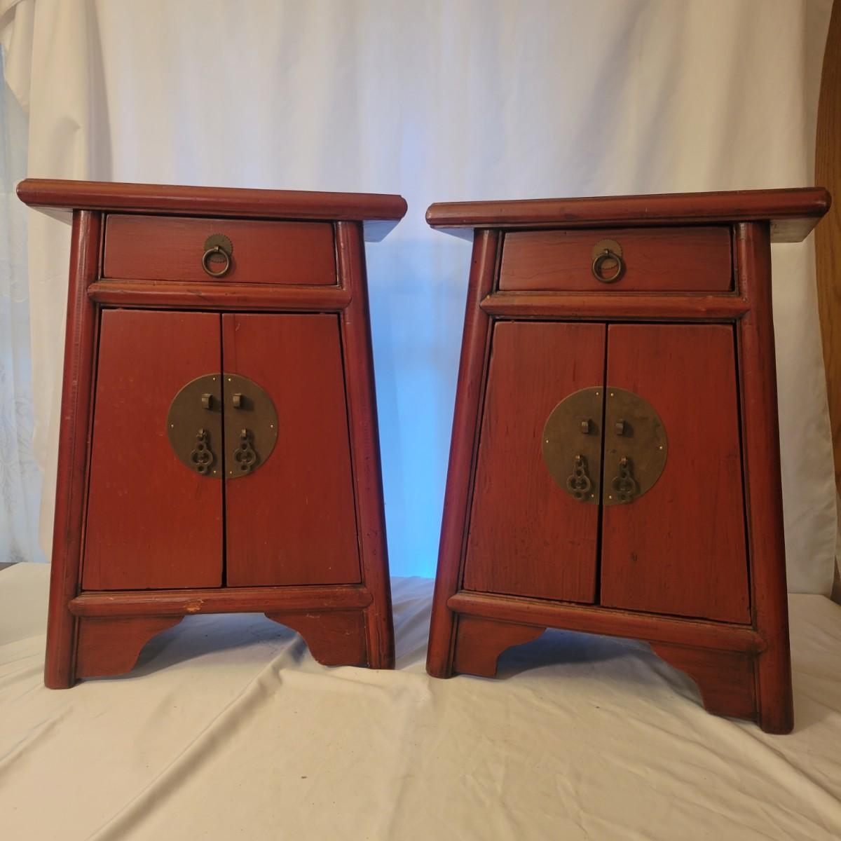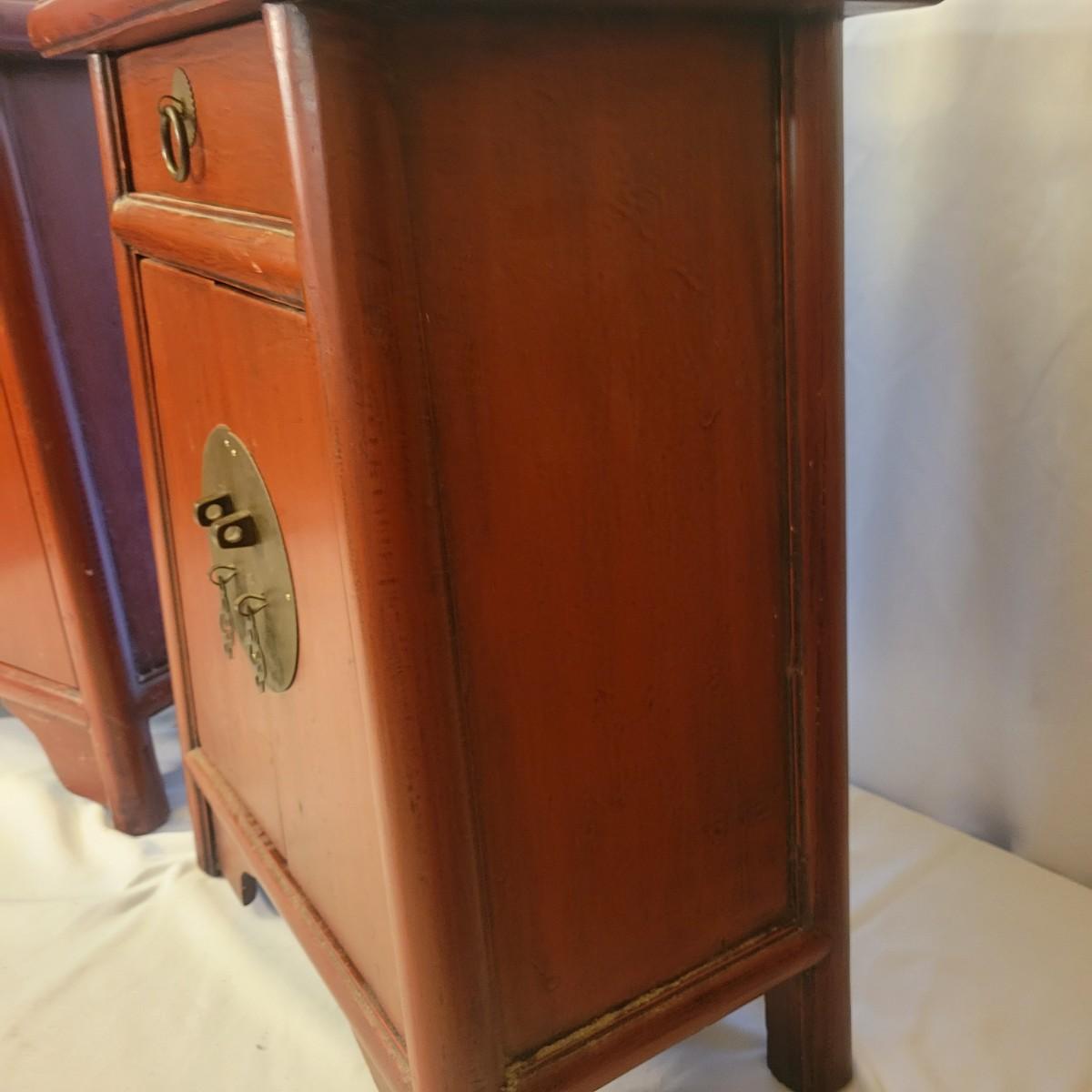 A pair of marching side tables in good condition but with some minor scratches and blemishes. Tables feature an Asian flare, metal hardware, a drawer and one shelf in the cabinet. Tables measure approximately 16" x 9.5" x 22" Local pickup only