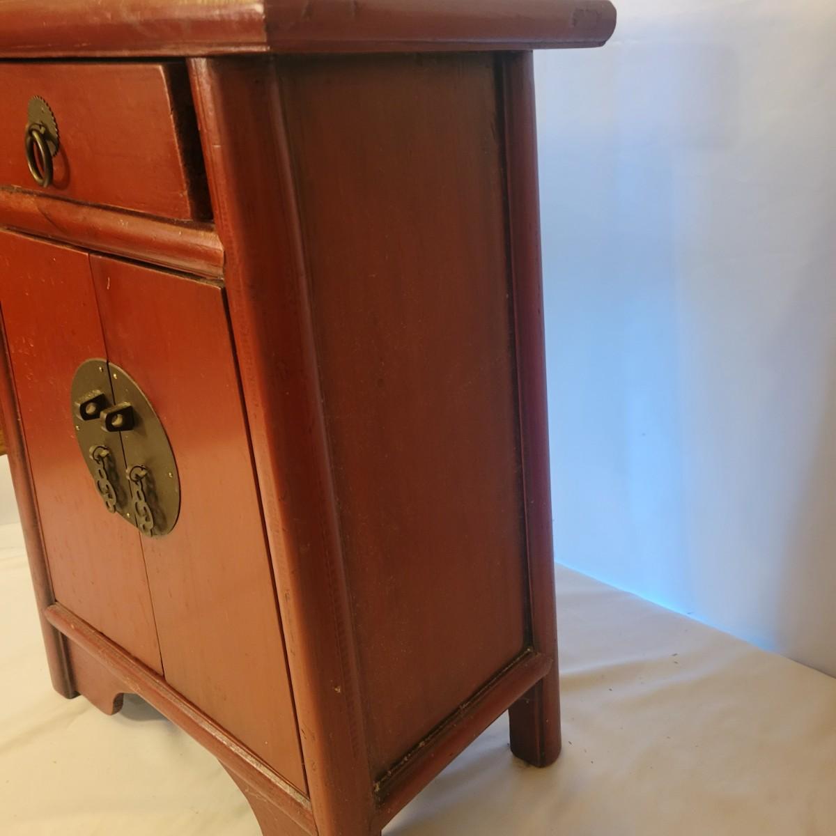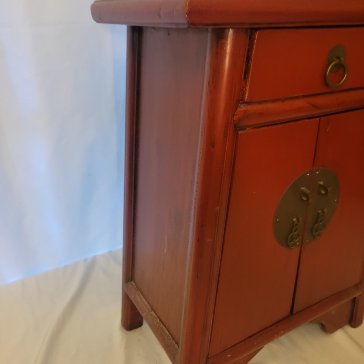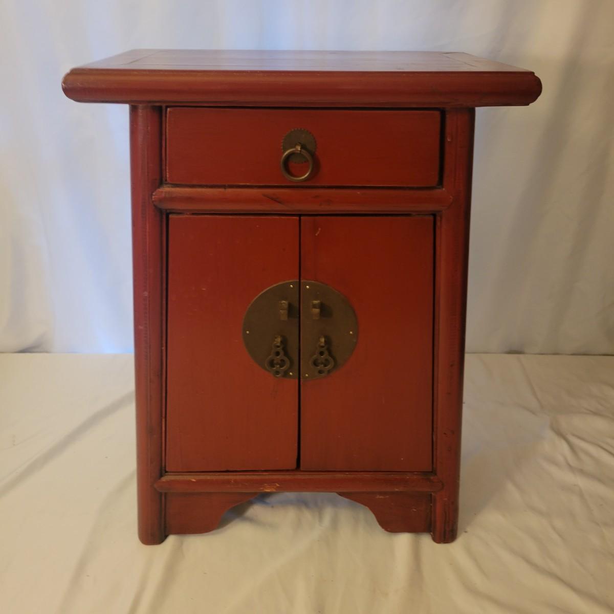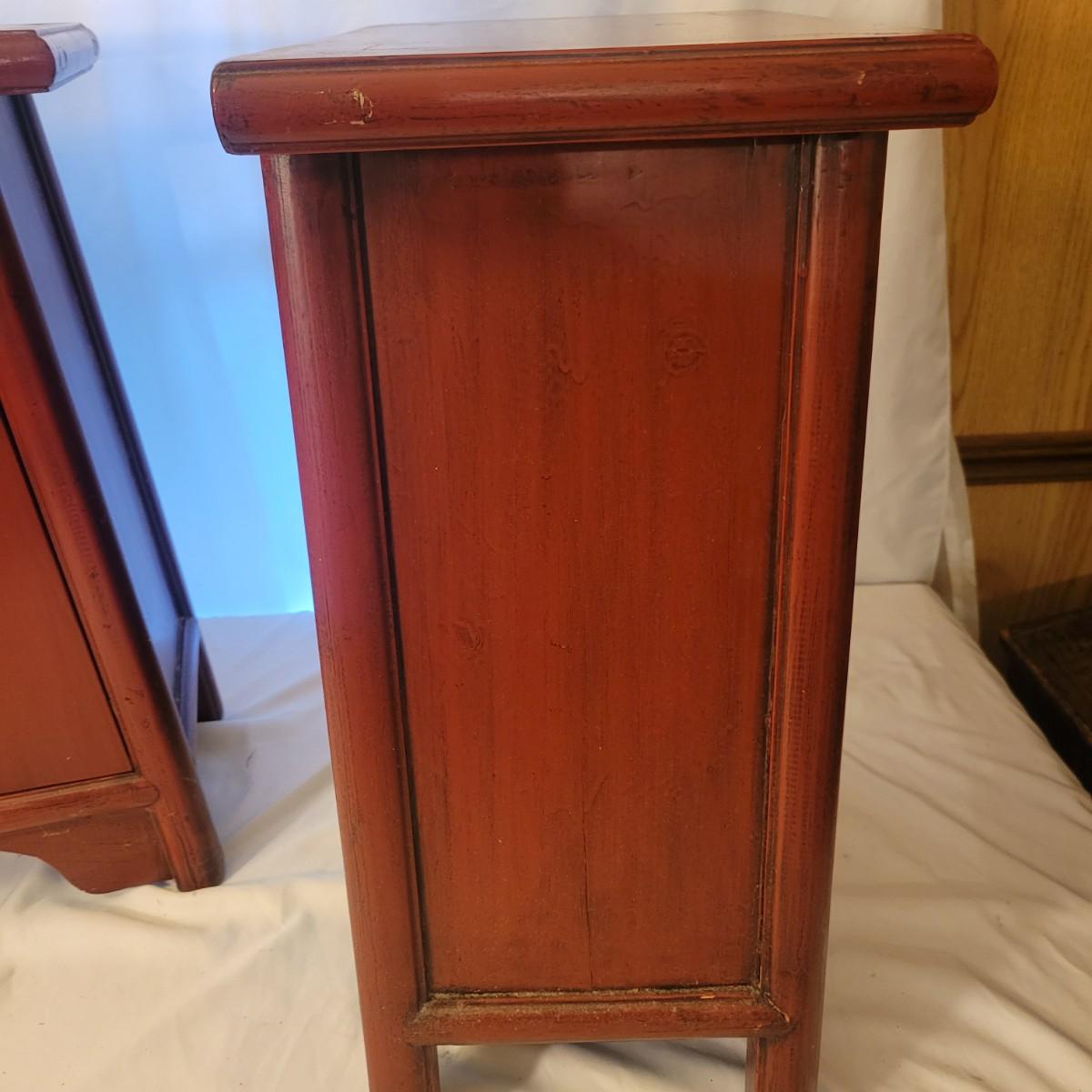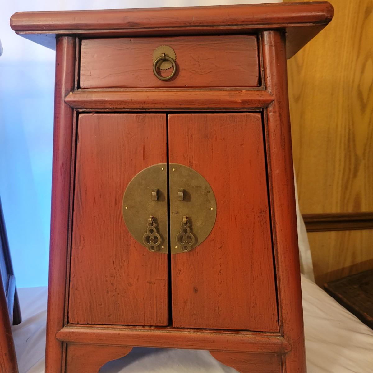 A pair of marching side tables in good condition but with some minor scratches and blemishes. Tables feature an Asian flare, metal hardware, a drawer and one shelf in the cabinet. Tables measure approximately 16" x 9.5" x 22" Local pickup only