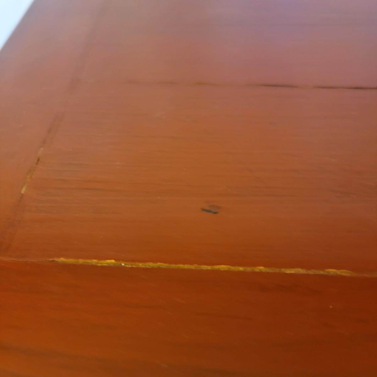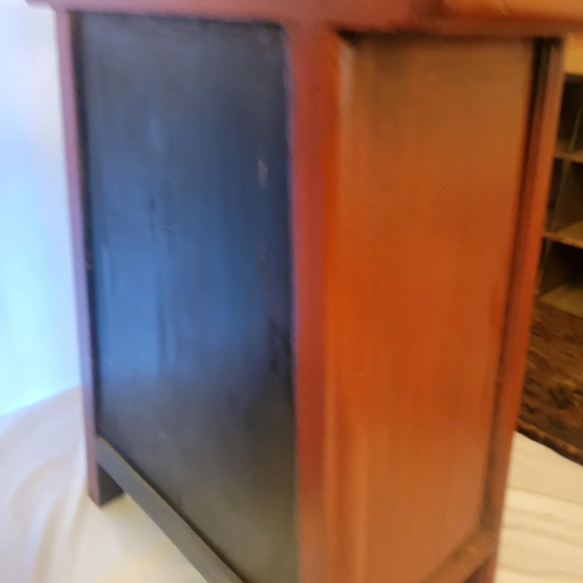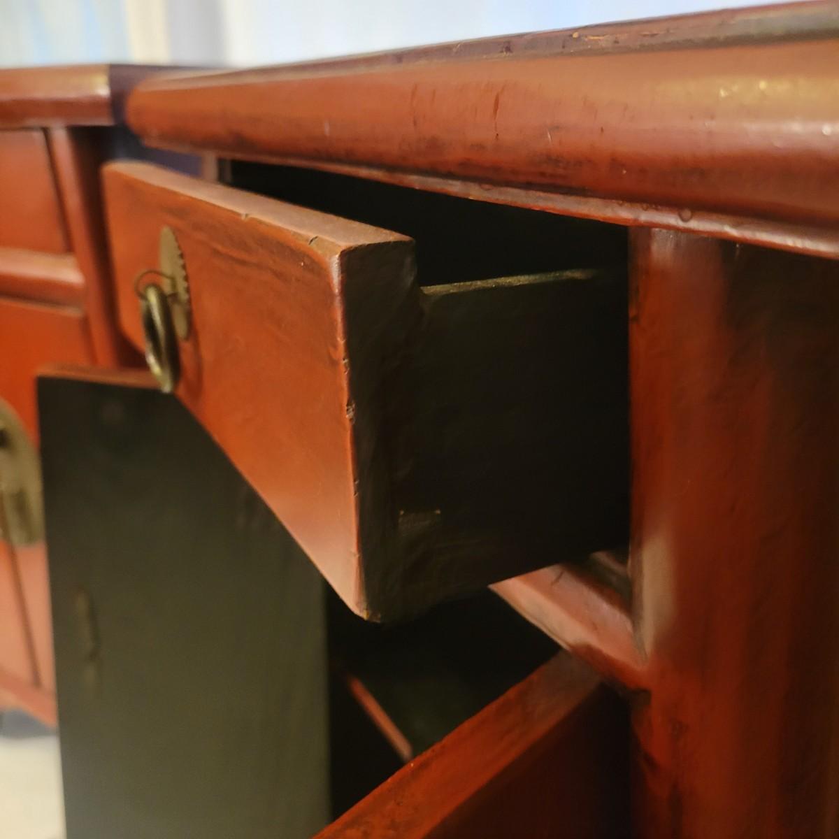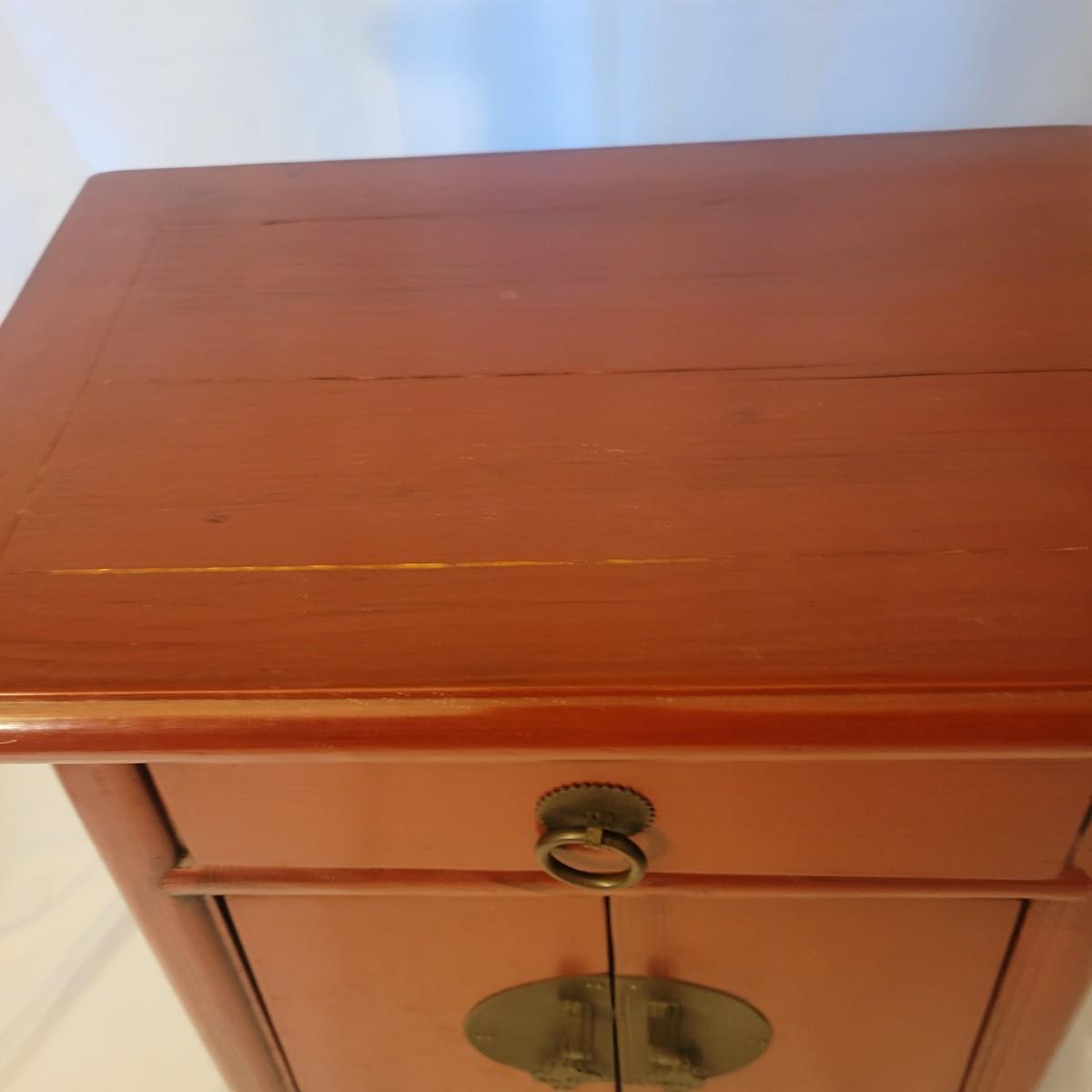A pair of marching side tables in good condition but with some minor scratches and blemishes. Tables feature an Asian flare, metal hardware, a drawer and one shelf in the cabinet. Tables measure approximately 16" x 9.5" x 22" Local pickup only