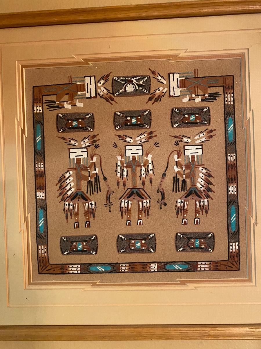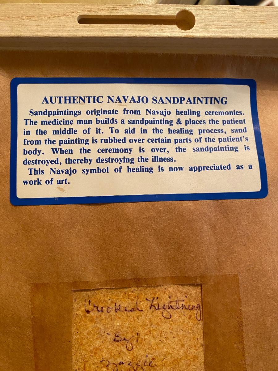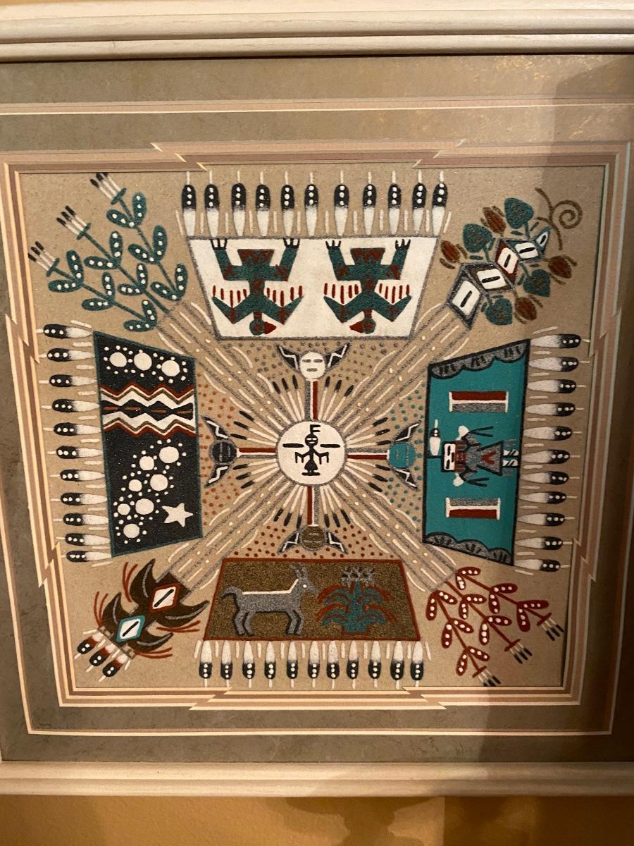 Set of two Authentic Navajo Sandpaintings. Both framed. Different frames. Has information regarding artistic process on the back. 17" x 17"